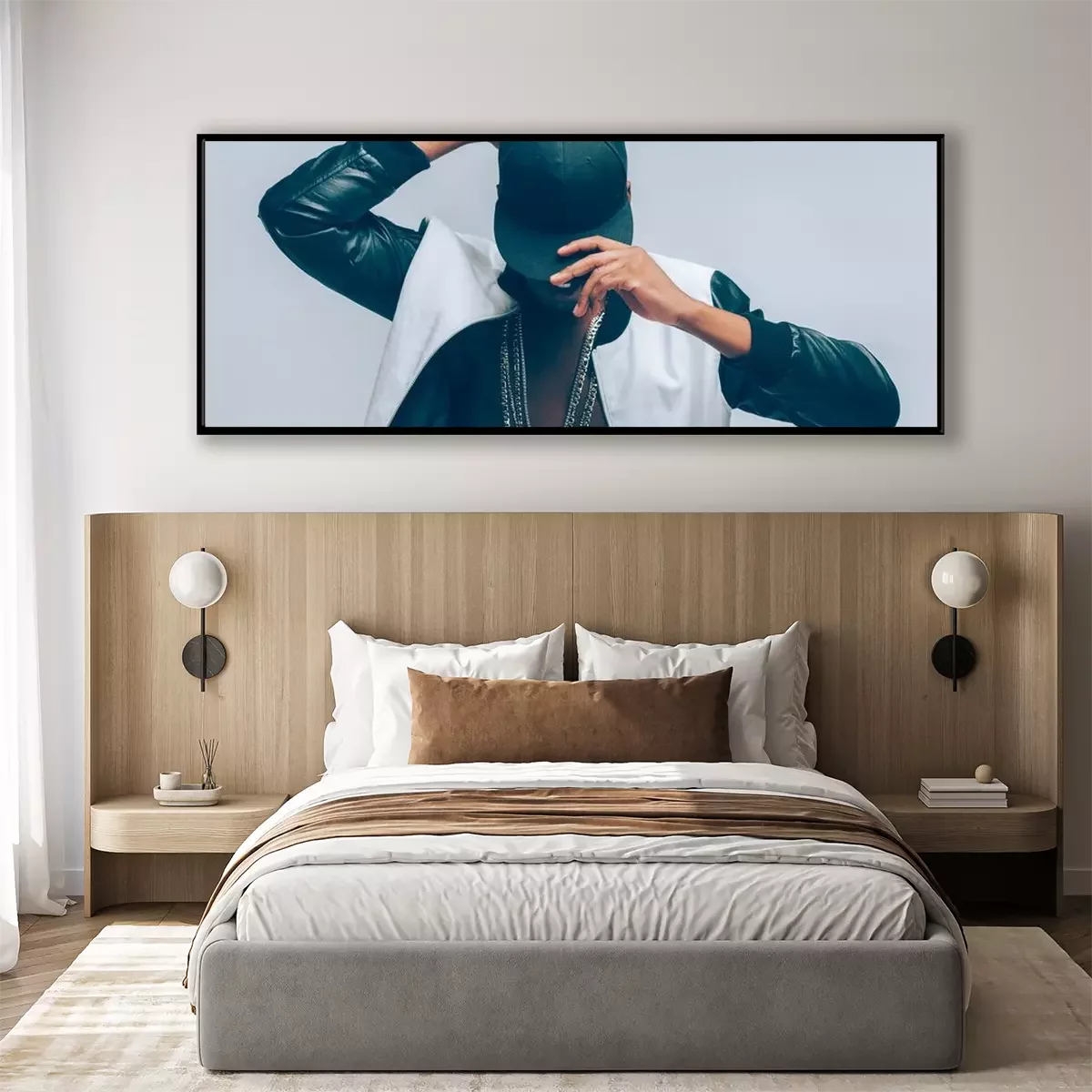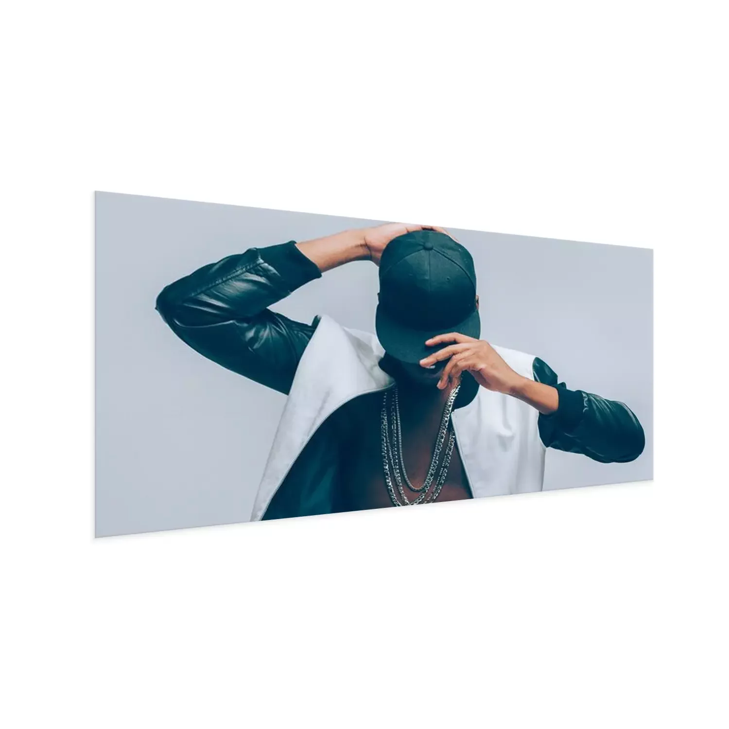 Poster Afro american urban guy. Rapper posing in cap and leather jacket on naked torso. Head tilted down. Rap culture lifestyle.