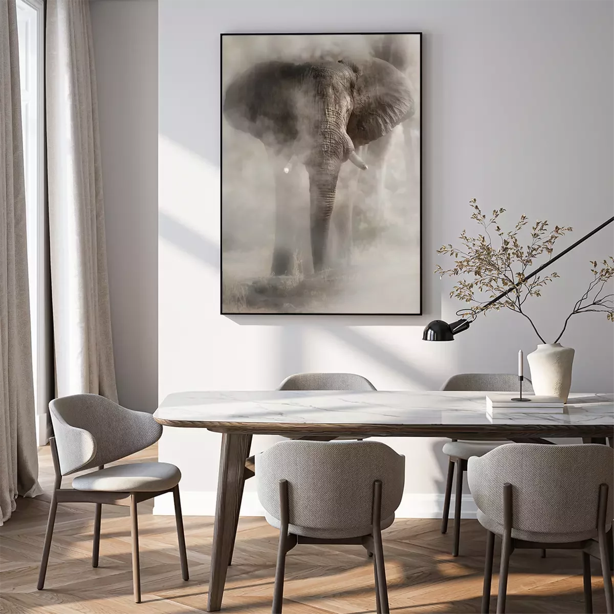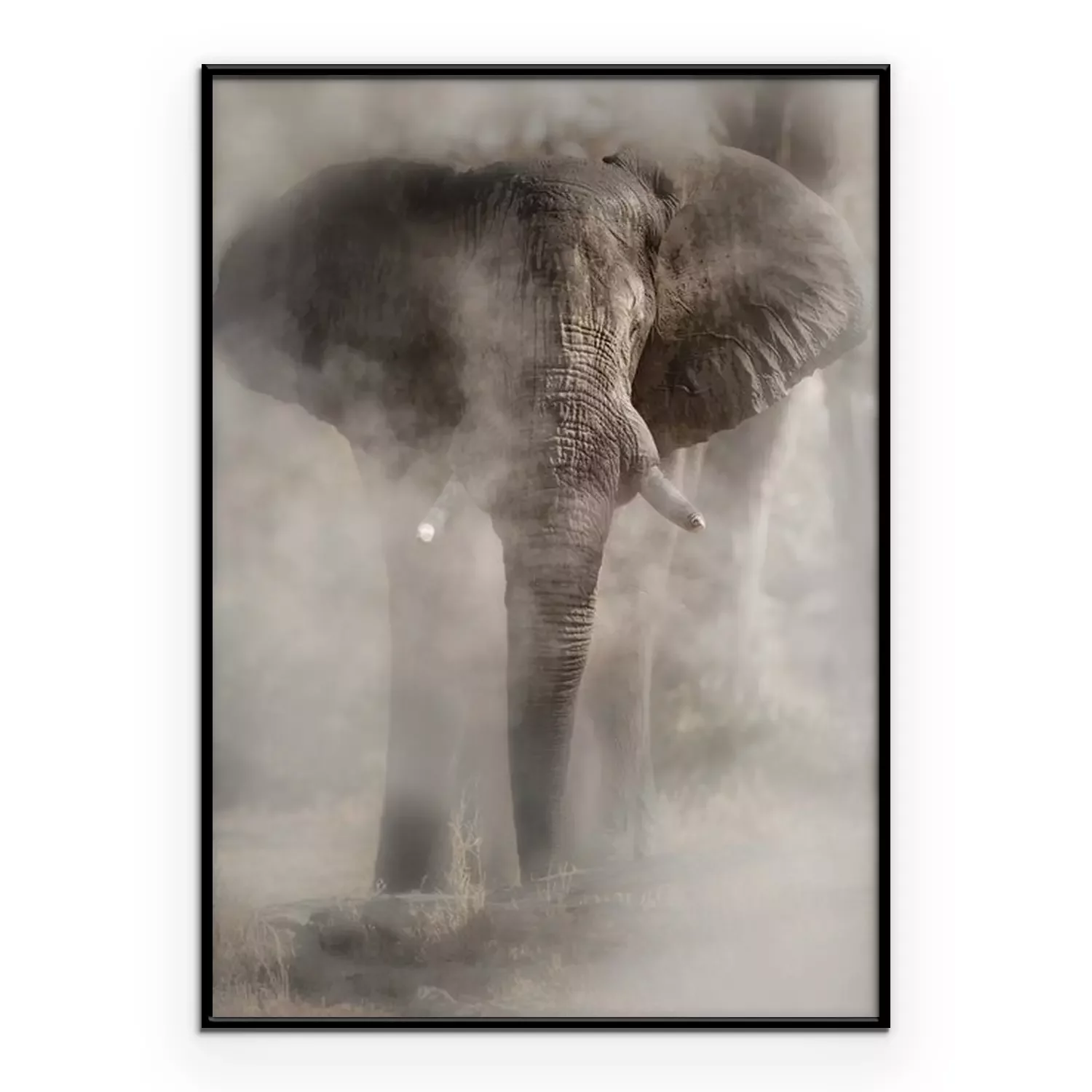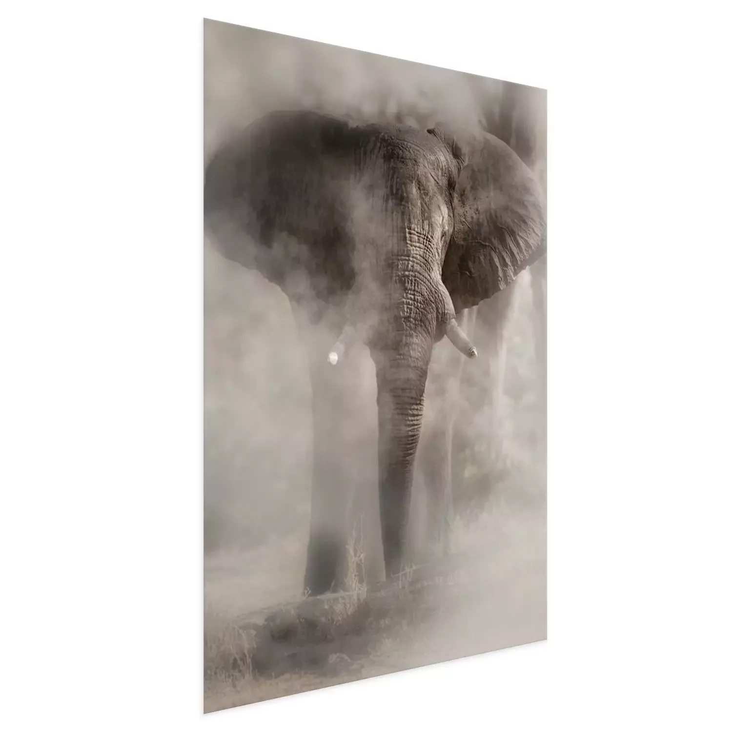 Poster: Amazing african elephant with dust. Huge elephant male in front of the camera. Wildlife scene with dangerous animal. Great tusker in the nature habitat. Loxodonta africana.