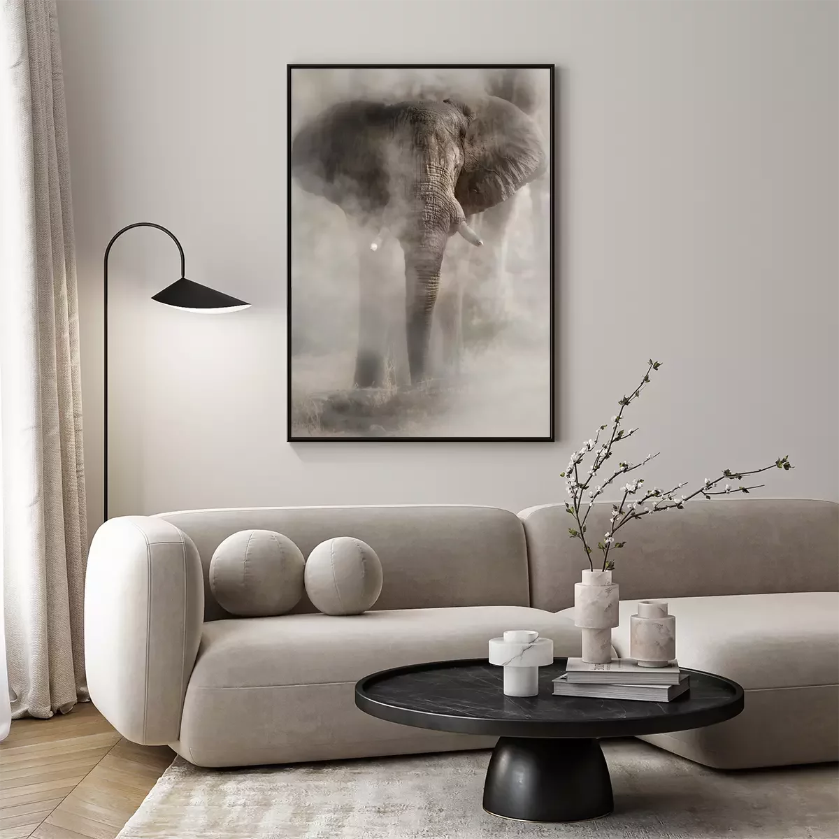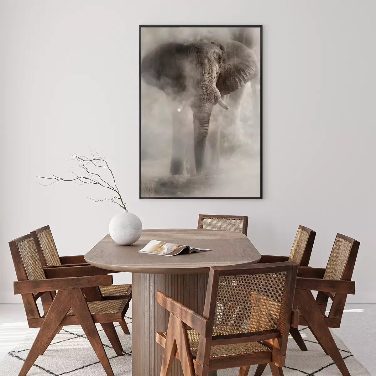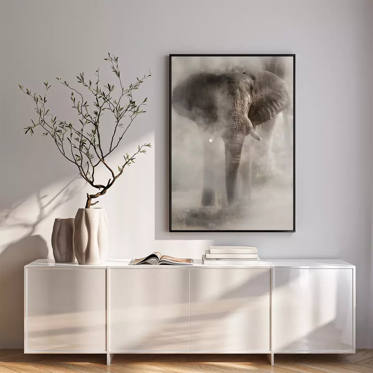 Poster: Amazing african elephant with dust. Huge elephant male in front of the camera. Wildlife scene with dangerous animal. Great tusker in the nature habitat. Loxodonta africana.