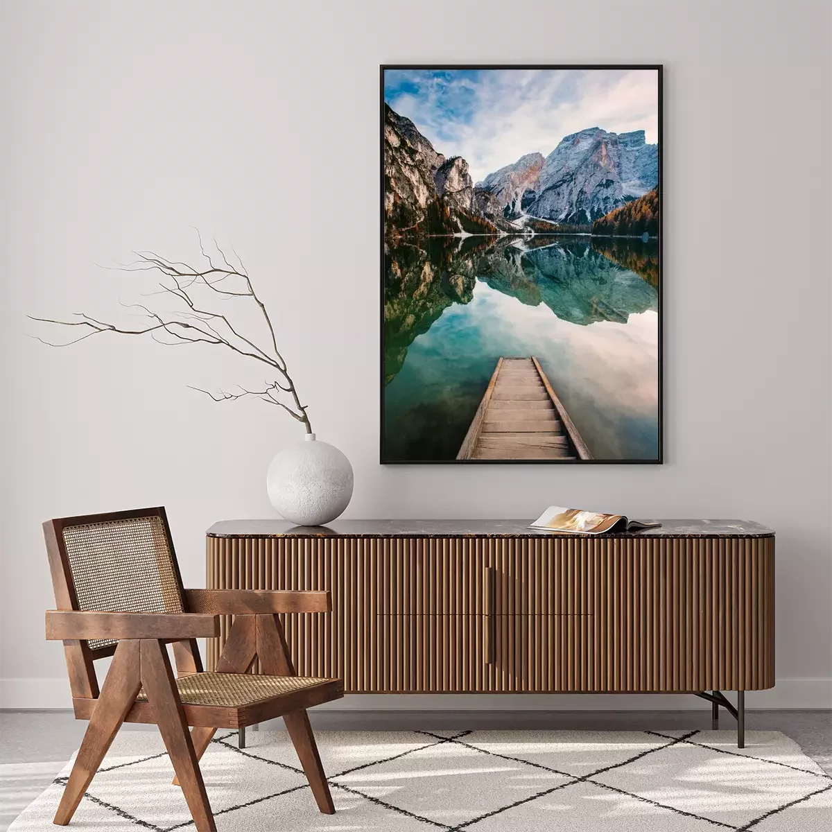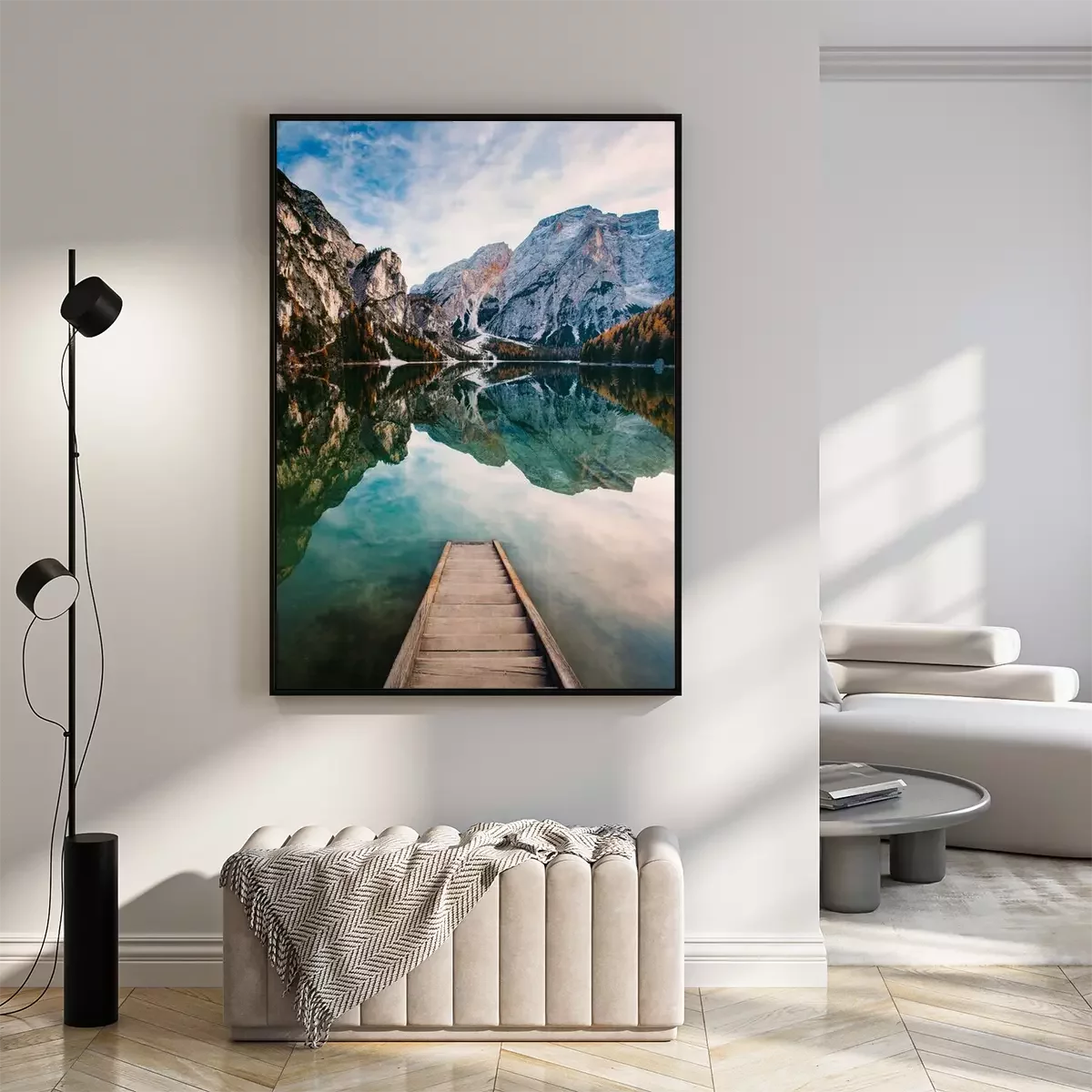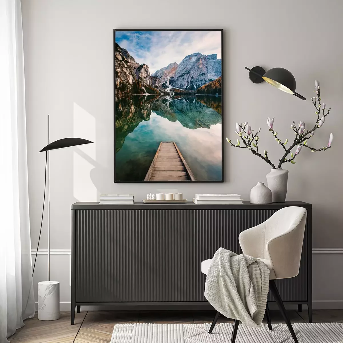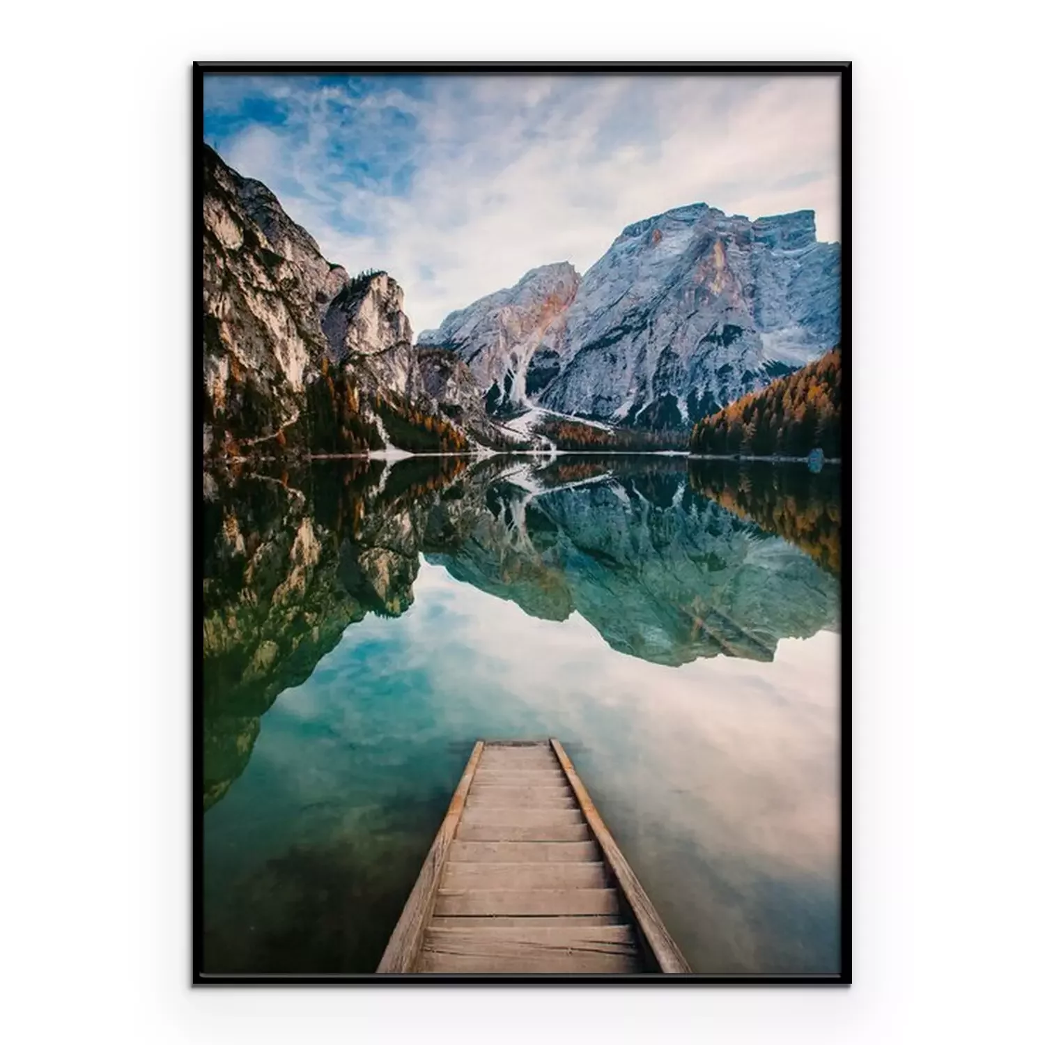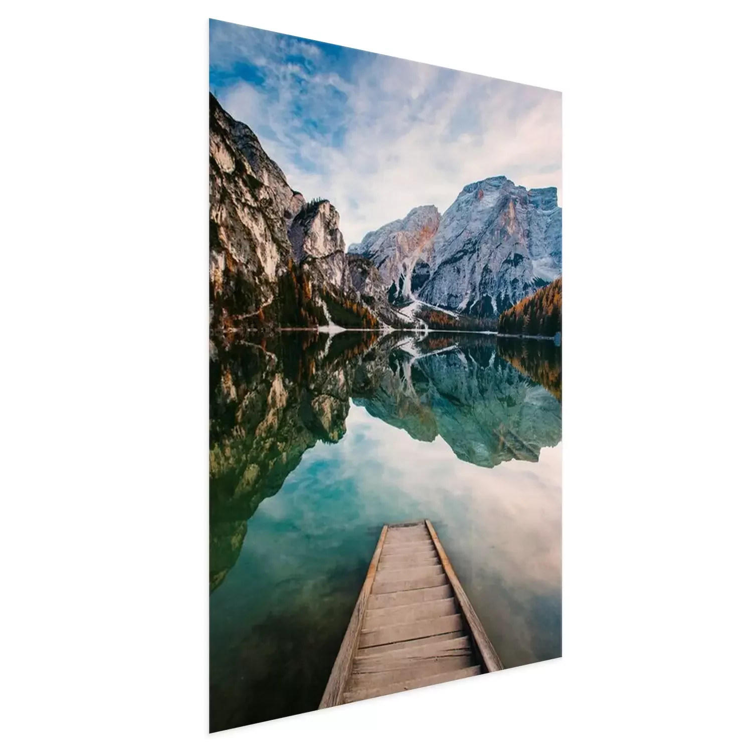 Poster Amazing view of Lago di Braies (Pragser Wildsee), most beautiful lake in South Tirol, Dolomites mountains, Italy. Popular tourist attraction. Beautiful Europe.