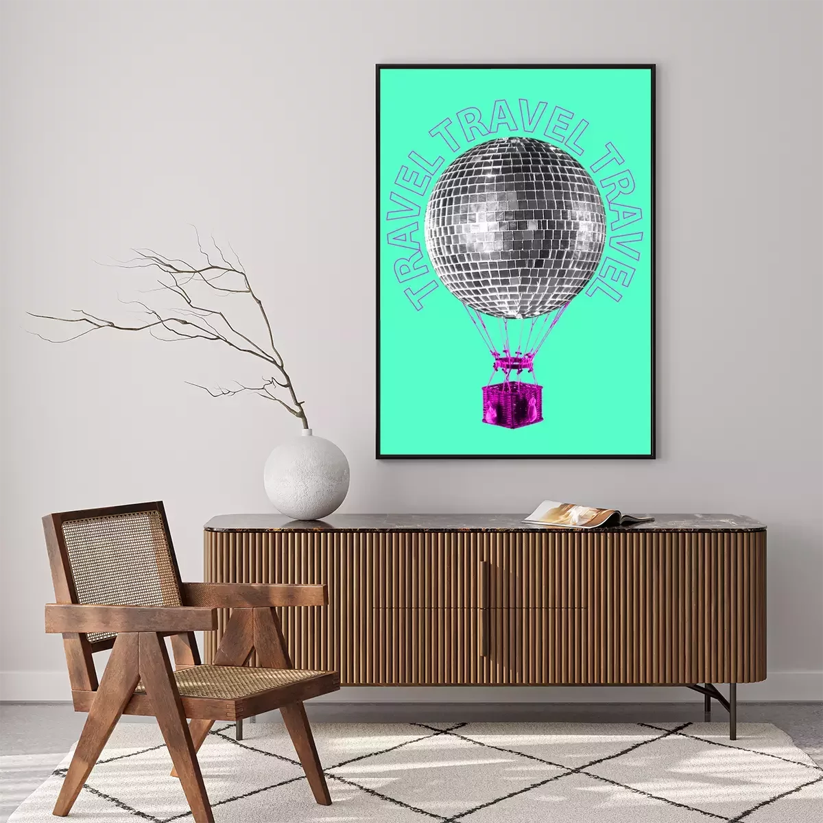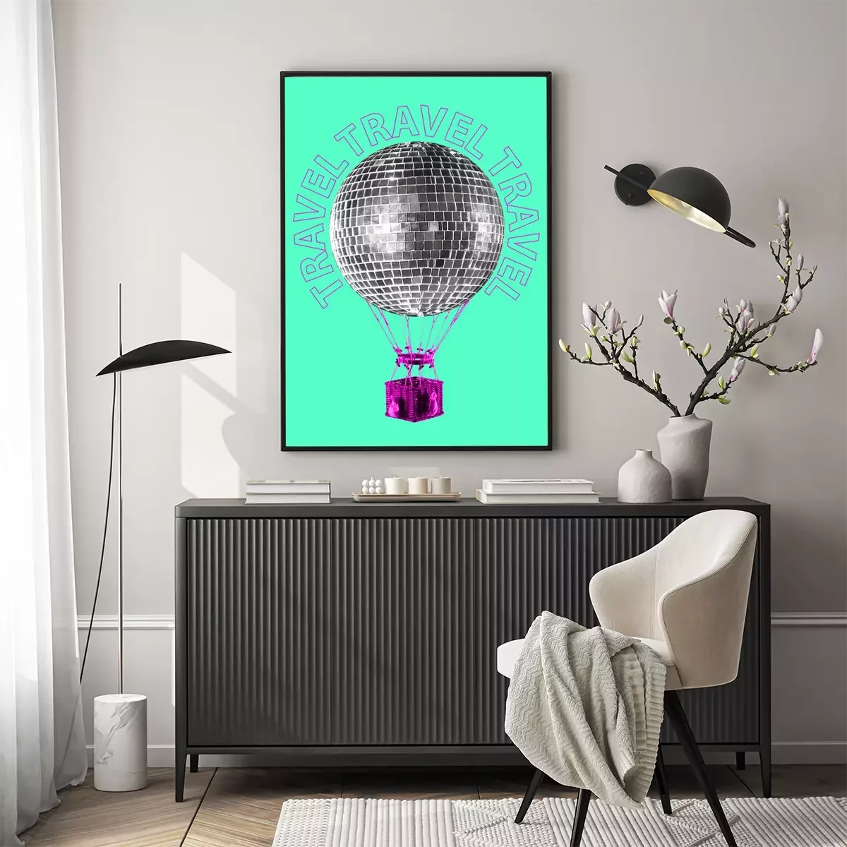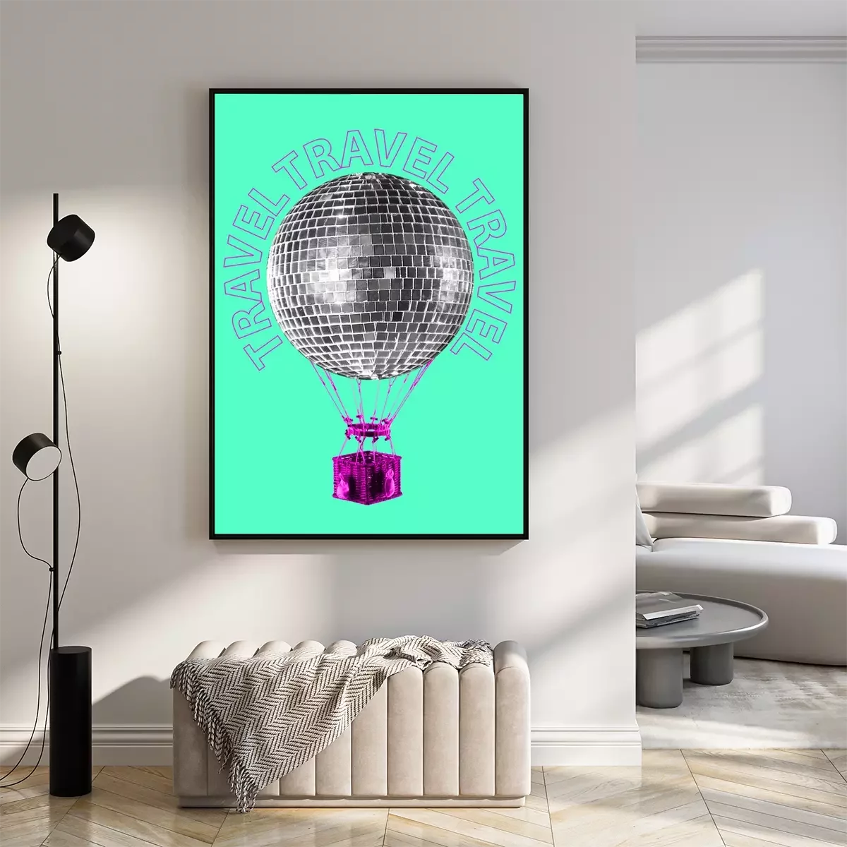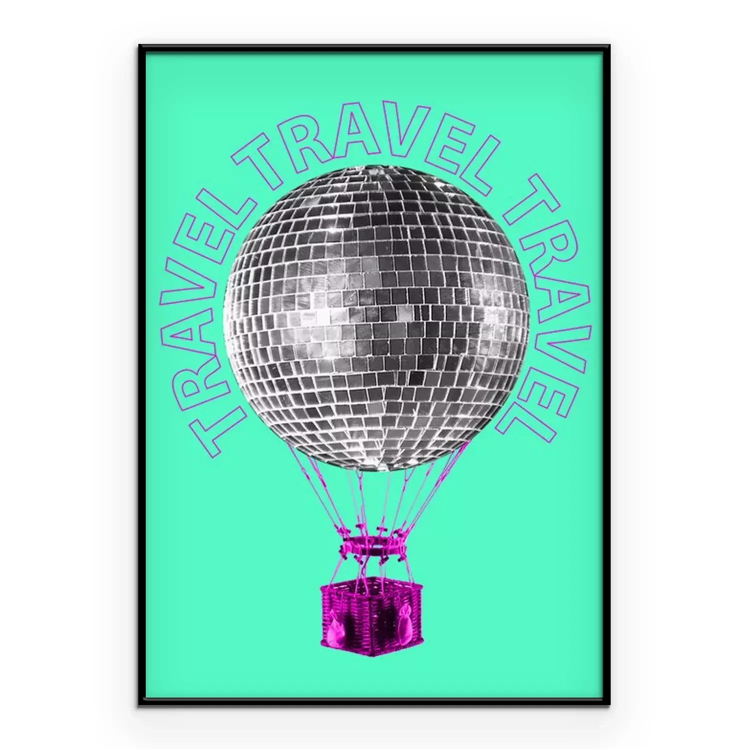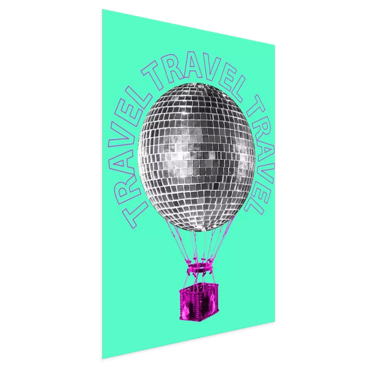 Poster An alternative trip. A journey to the dance music world. Silver disco ball shaped balloon flying up with the pink basket against mint background. Modern design. Contemporary art collage.