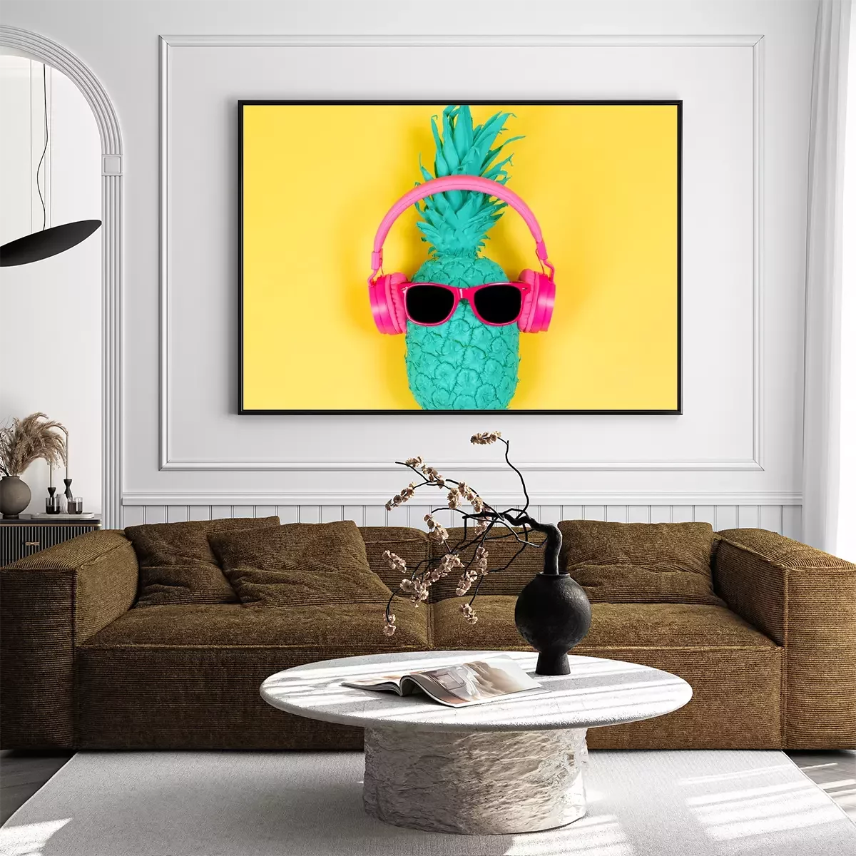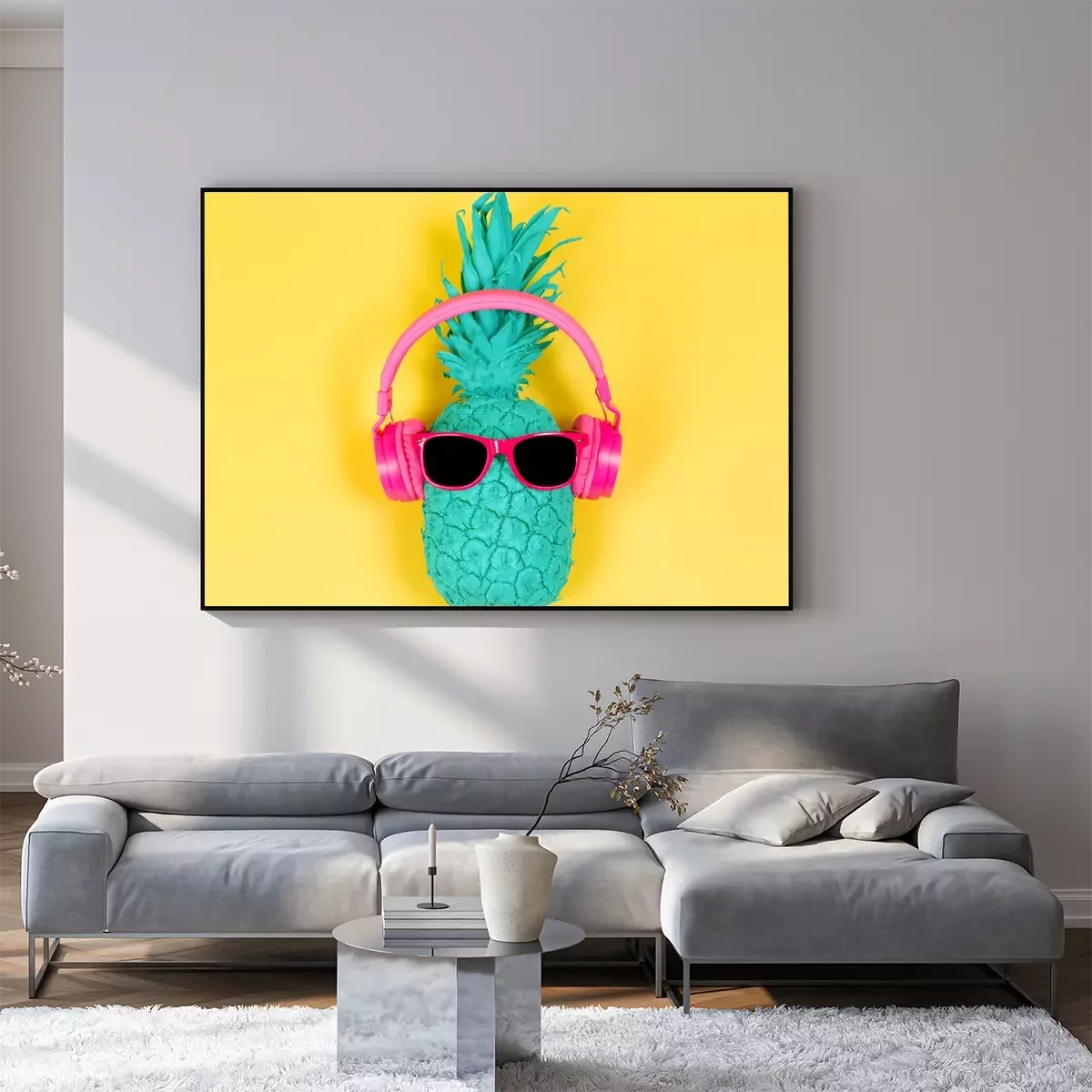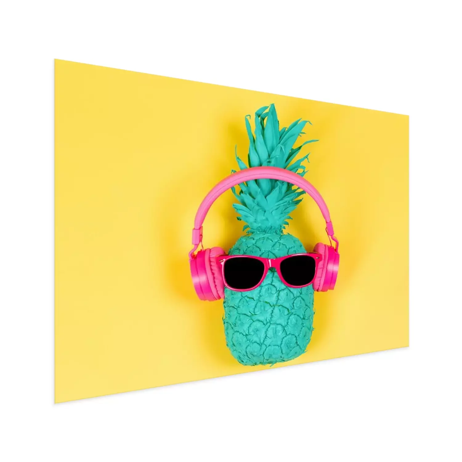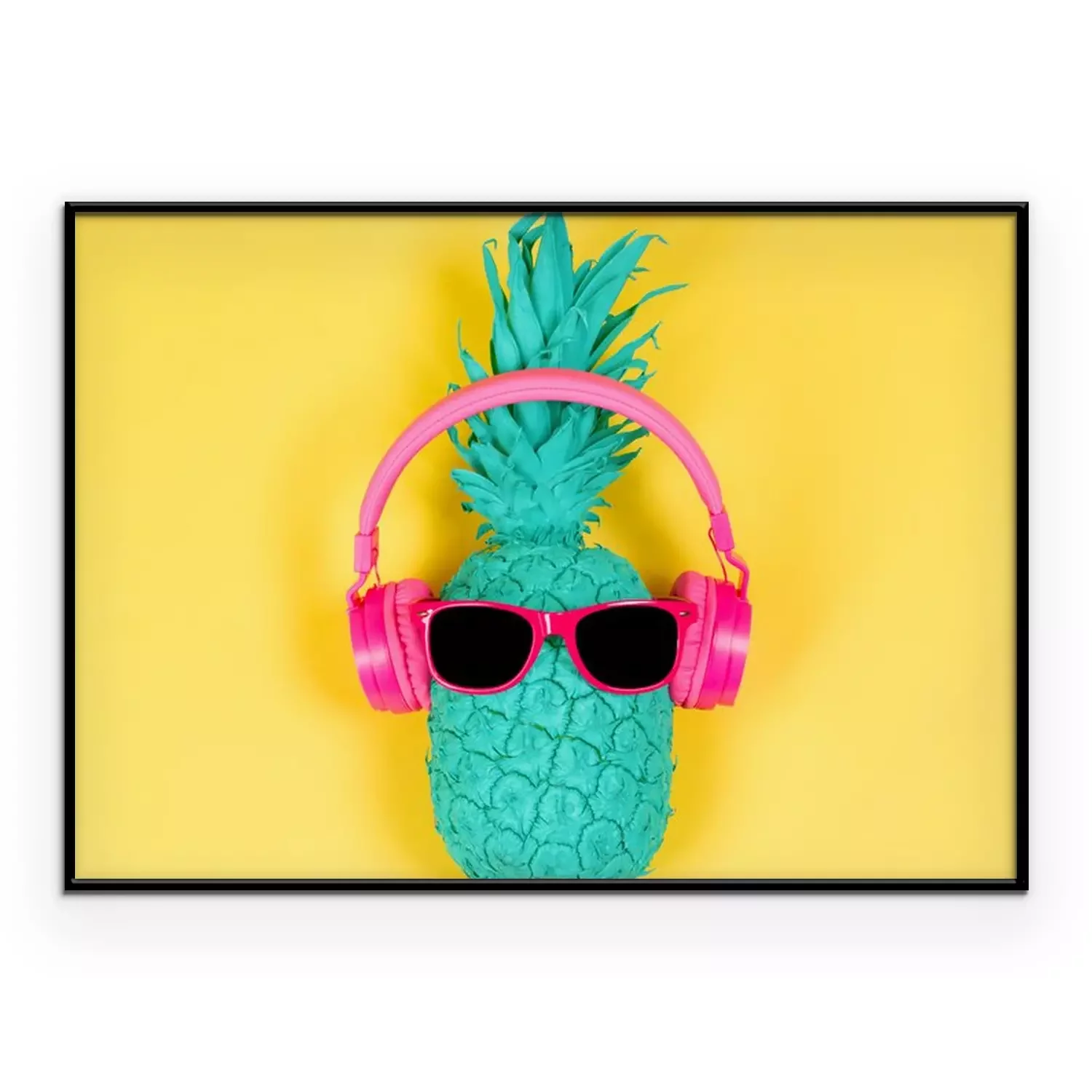 Poster: Ananas in roze hoofdtelefoons en glazen op een gele achtergrond