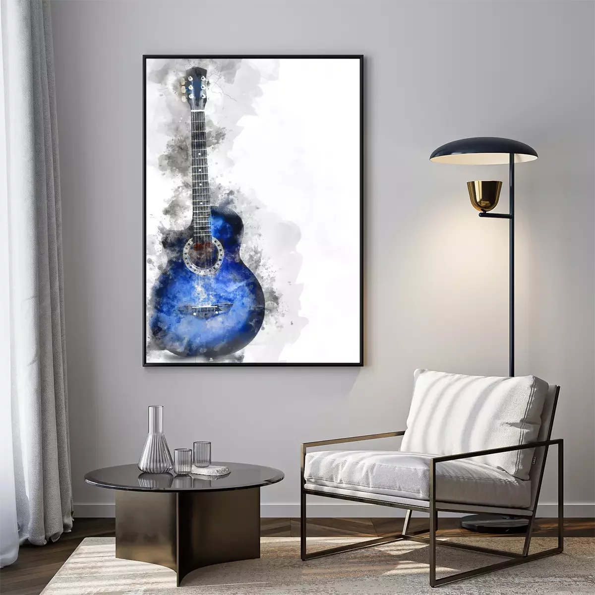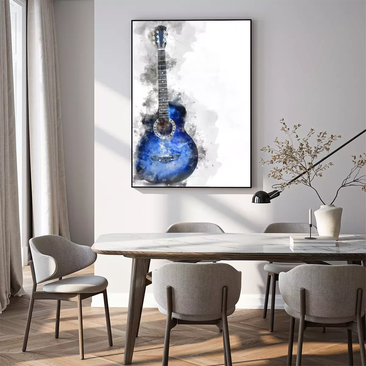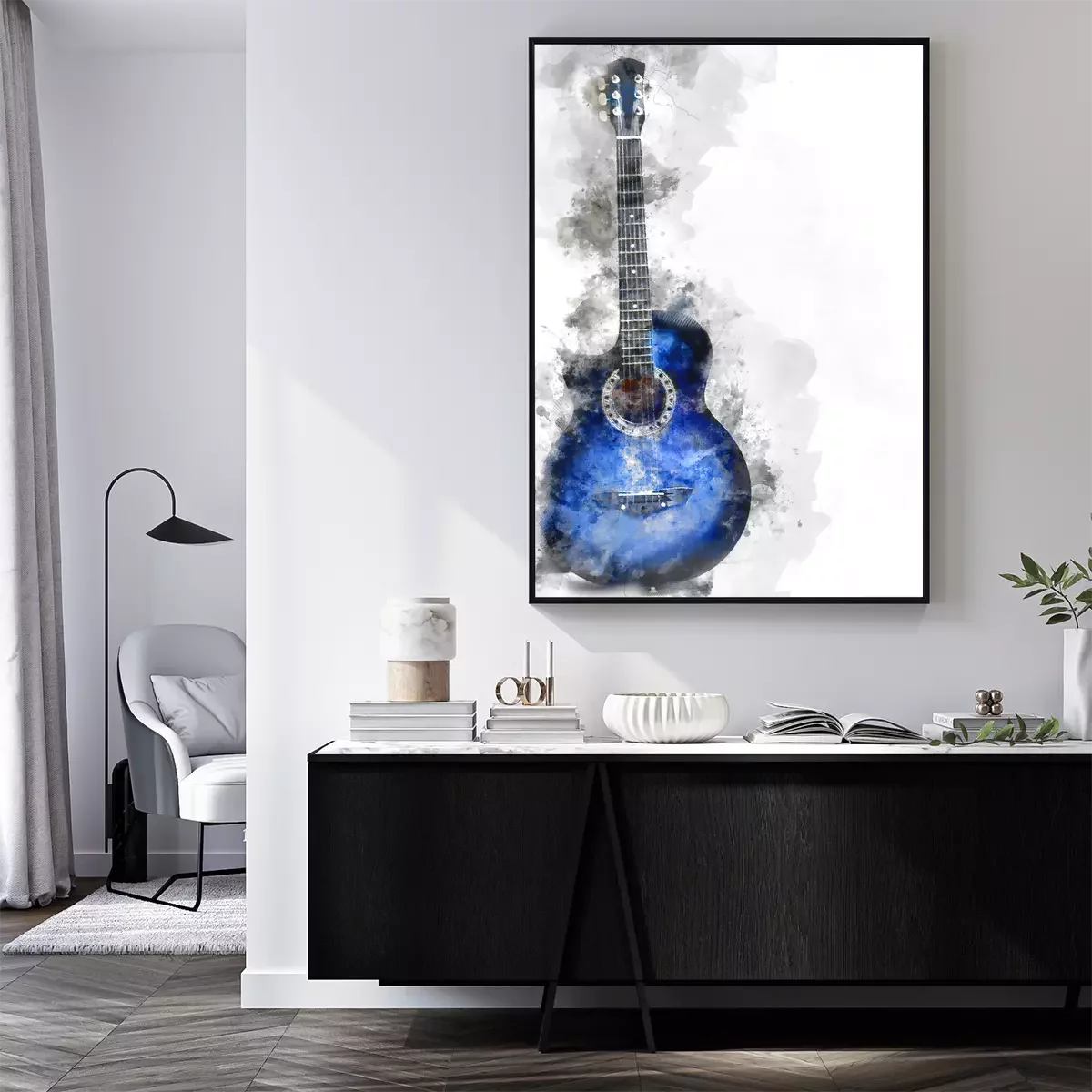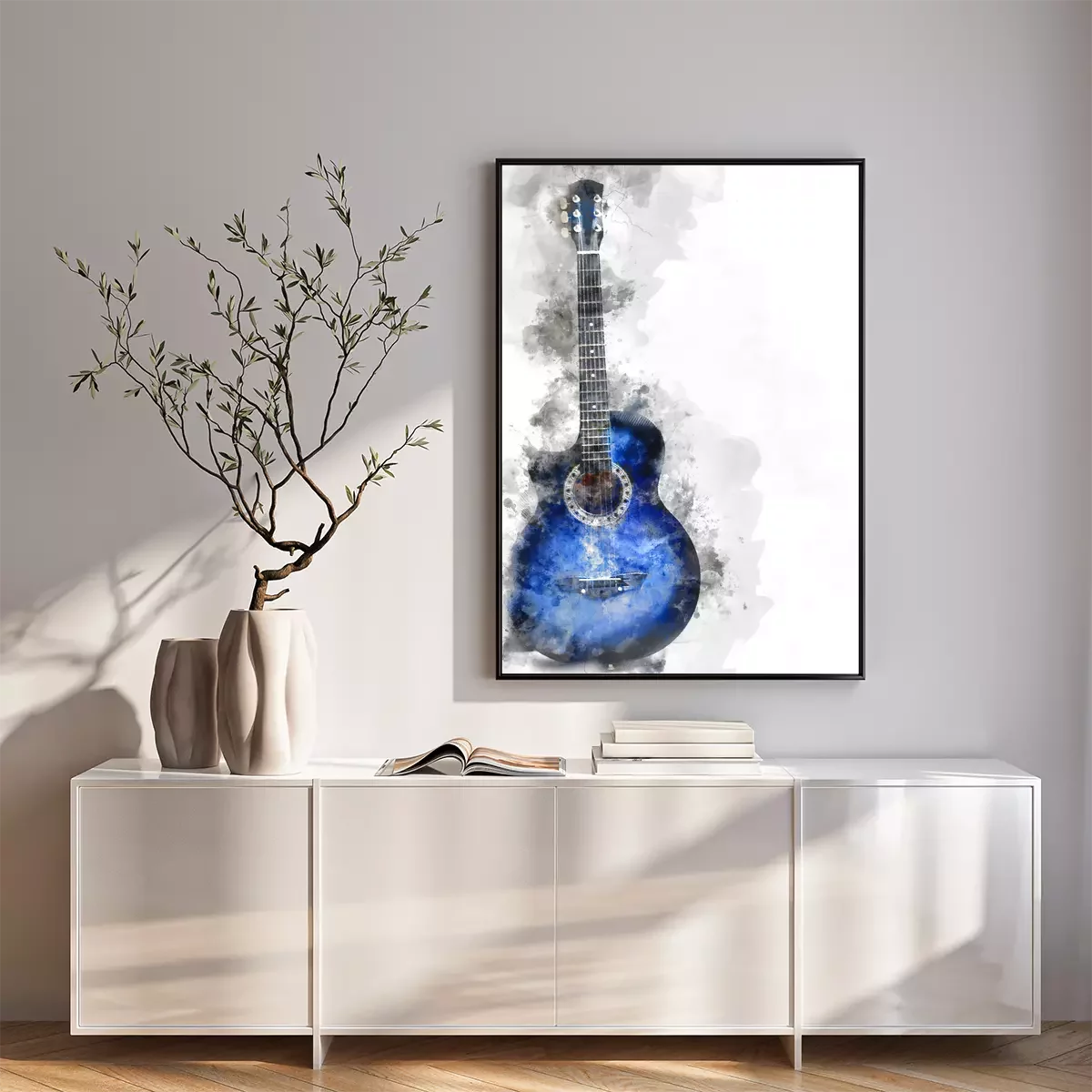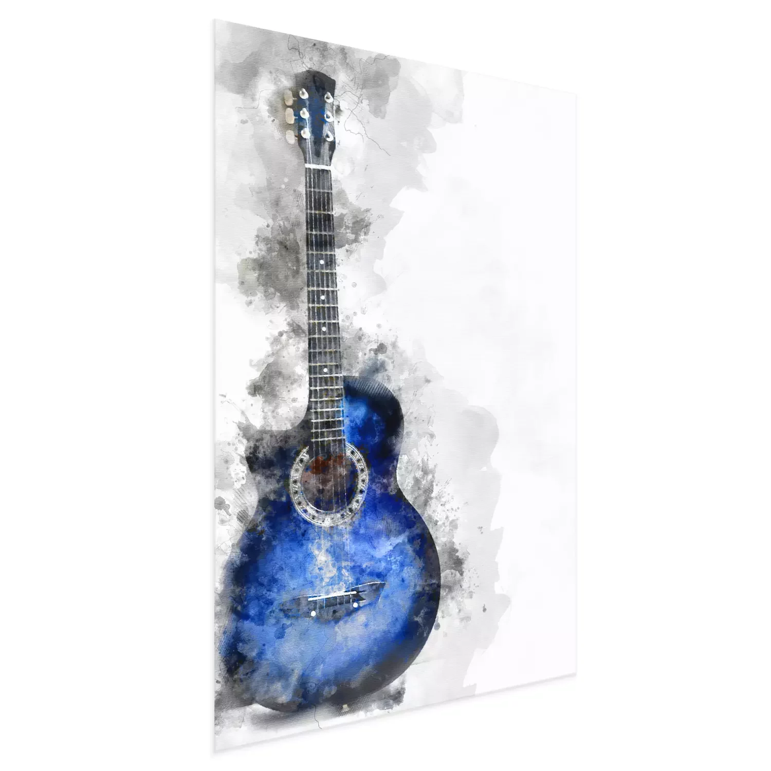 Poster Aquarel blauwe gitaar op een artistieke achtergrond