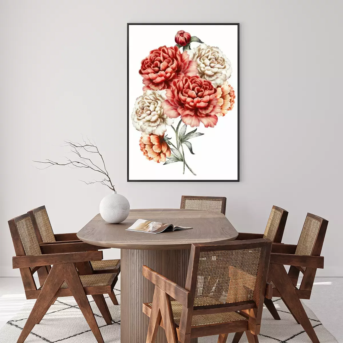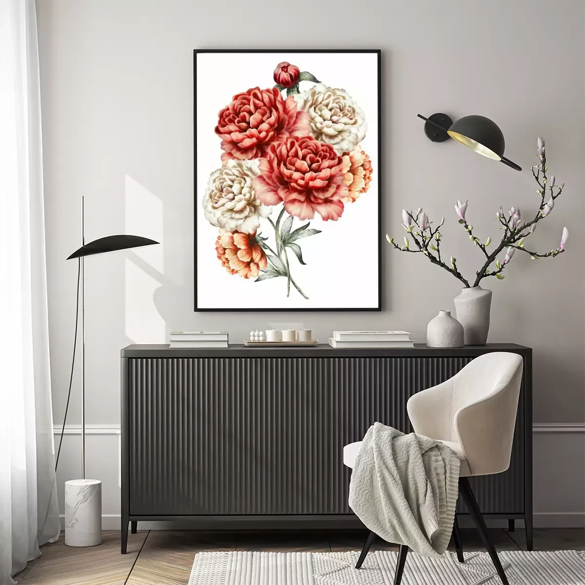 Drie pioenrozen verweven met stengels