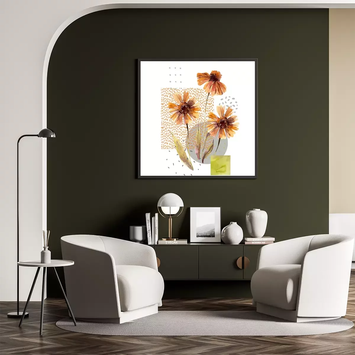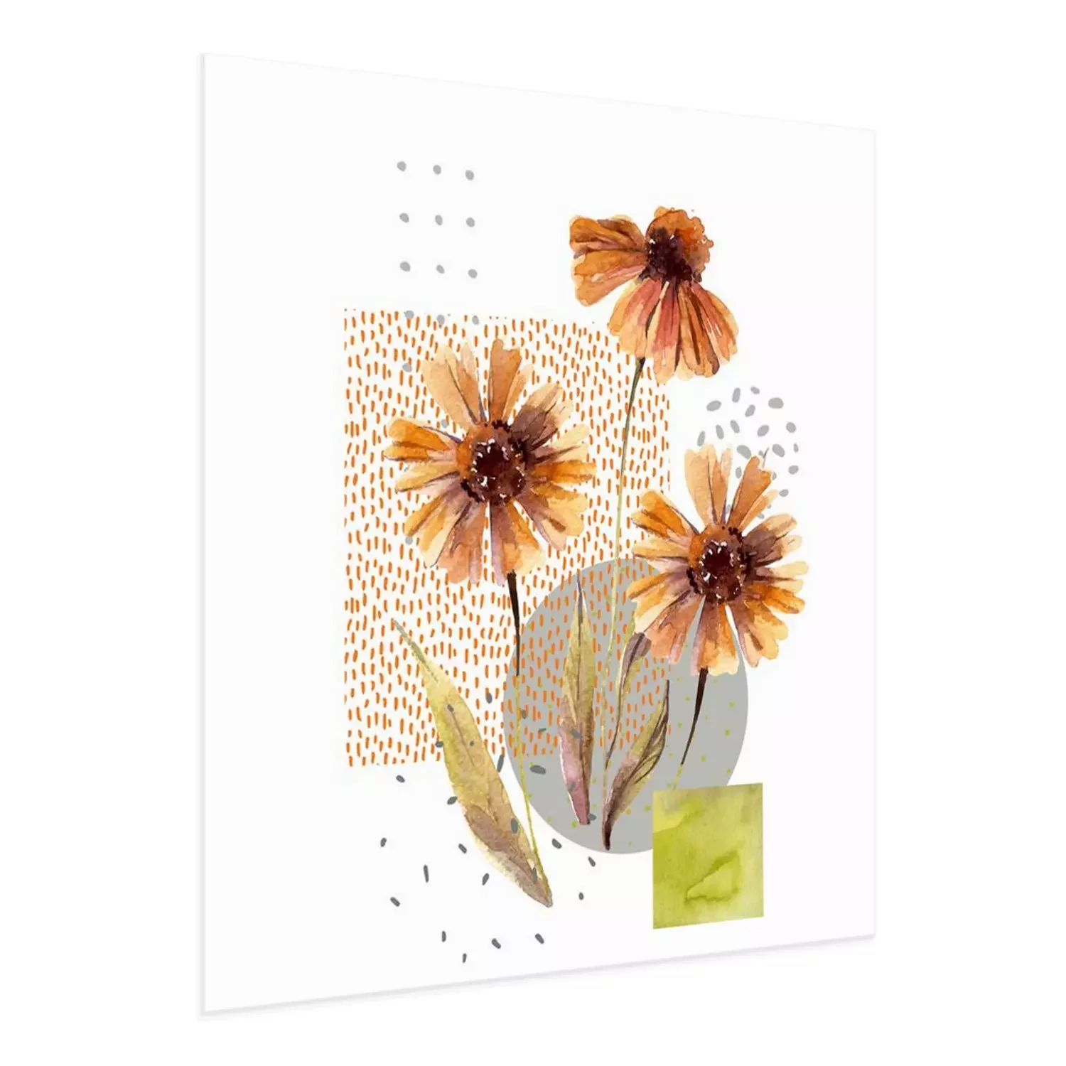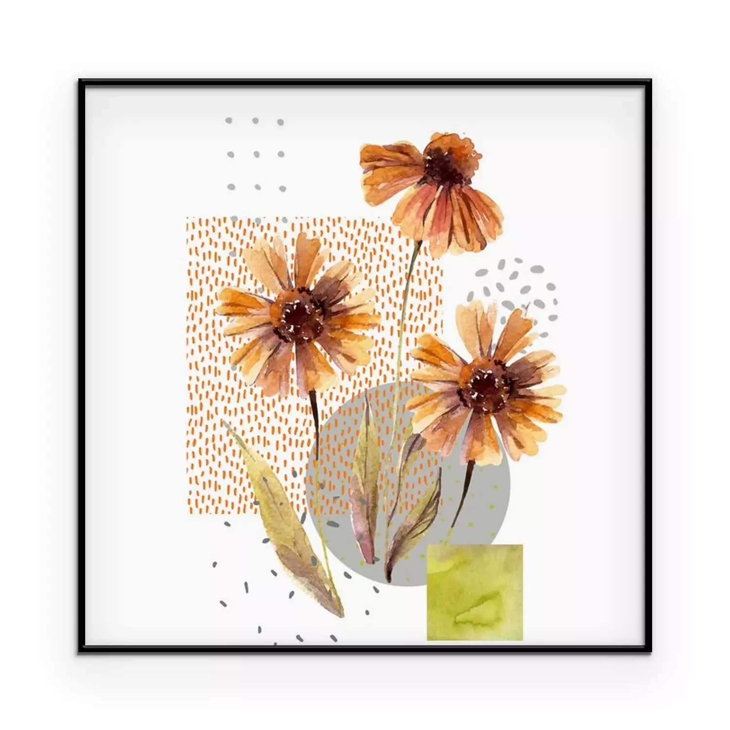 Poster: Aquarel bloemen en bladeren, cirkel, vierkante vormen, minimale doodle texturen