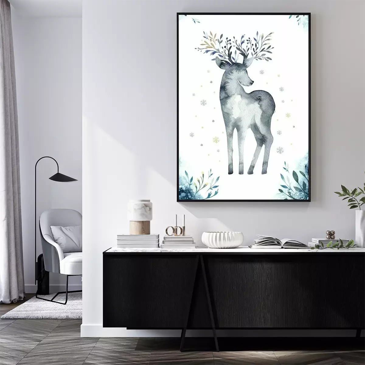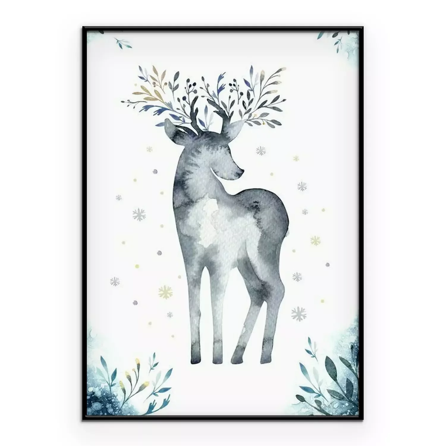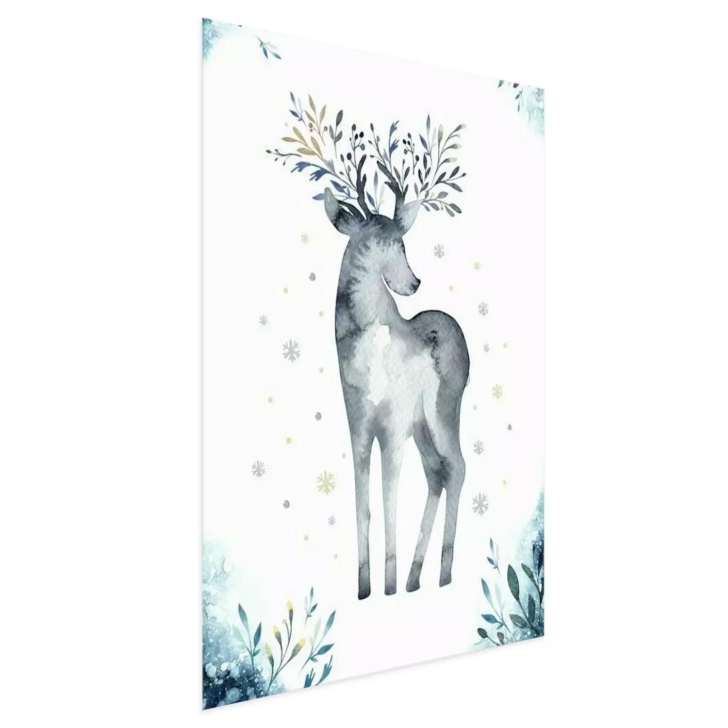 Poster: Aquarel close-up portret van blauwe herten. Geïsoleerd op witte achtergrond Hand getrokken Kerstmis indigo illustratie. Wenskaart dierlijke winter ontwerp decoratie