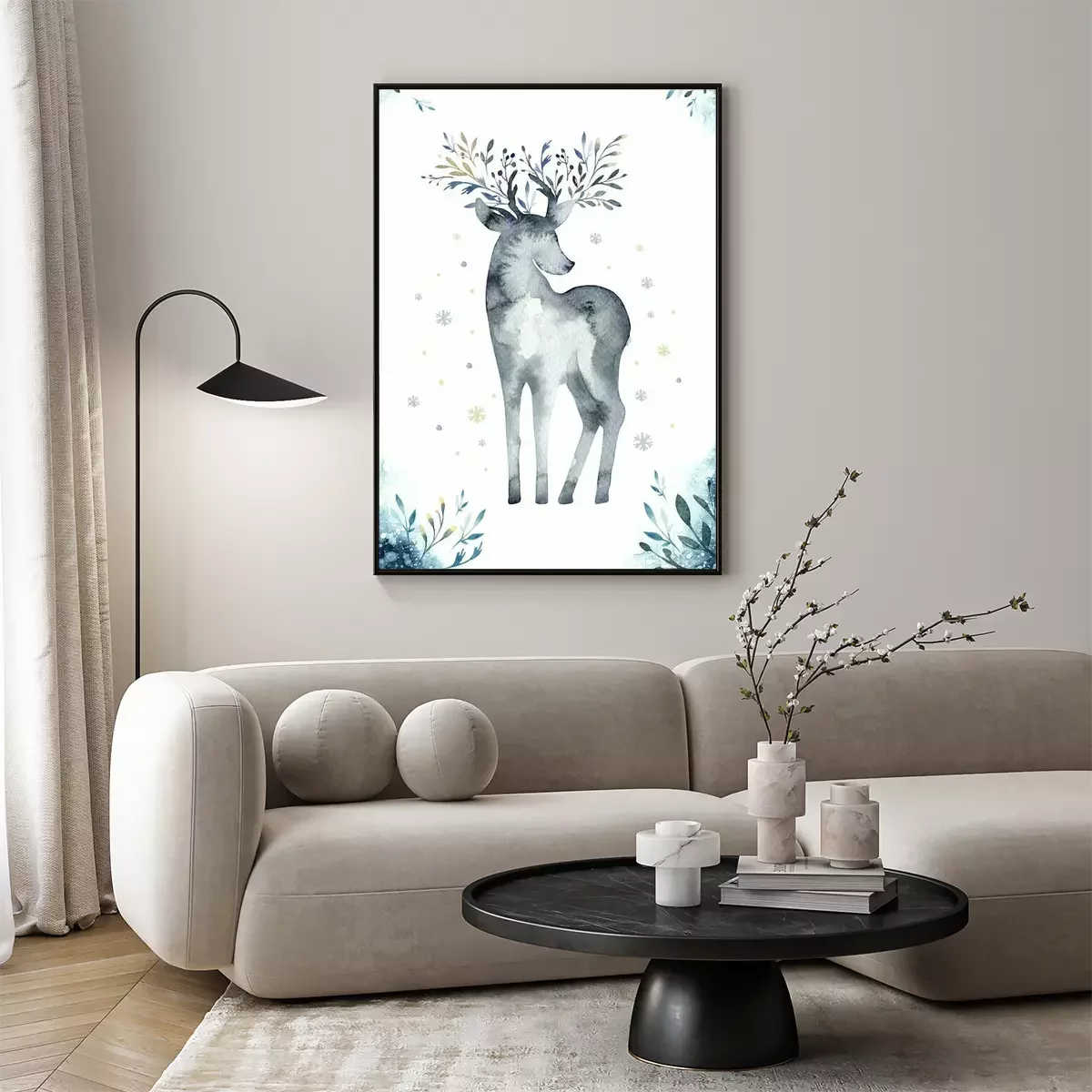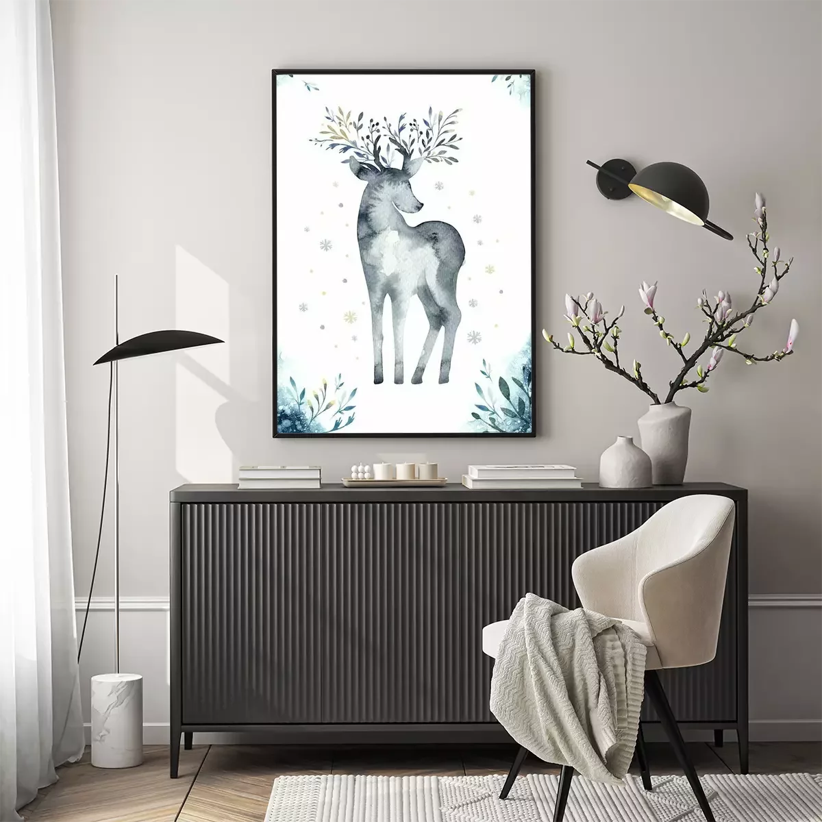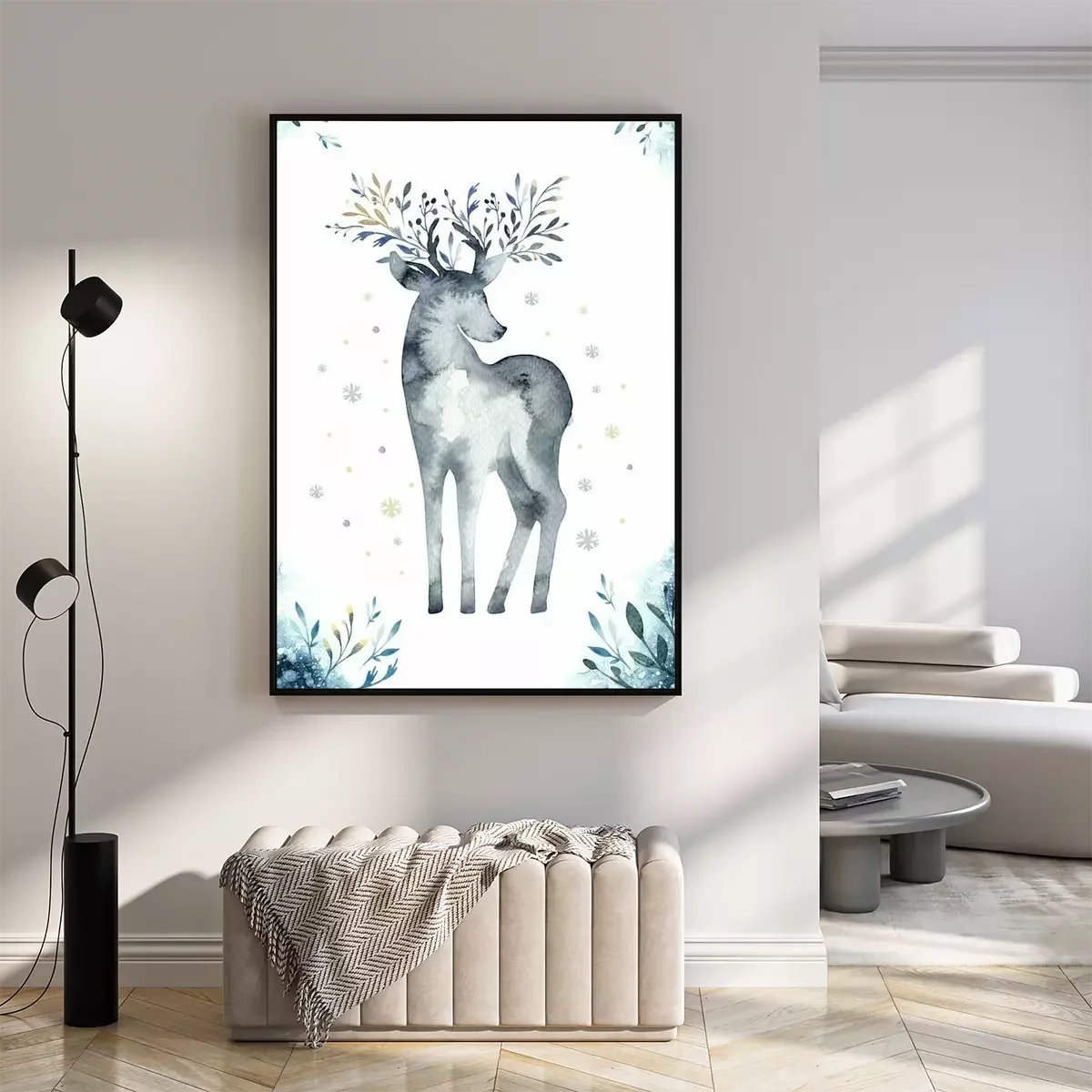 Poster: Aquarel close-up portret van blauwe herten. Geïsoleerd op witte achtergrond Hand getrokken Kerstmis indigo illustratie. Wenskaart dierlijke winter ontwerp decoratie