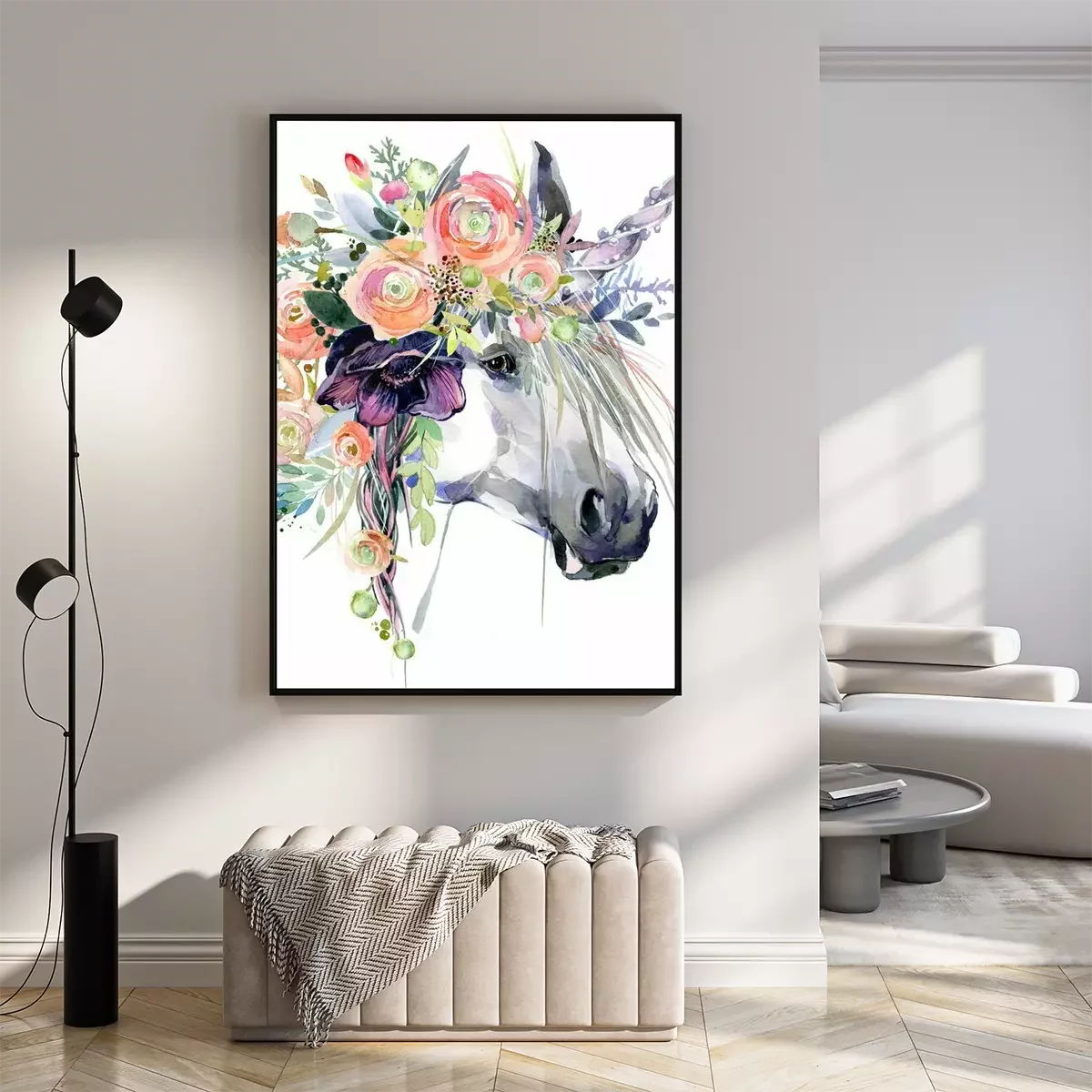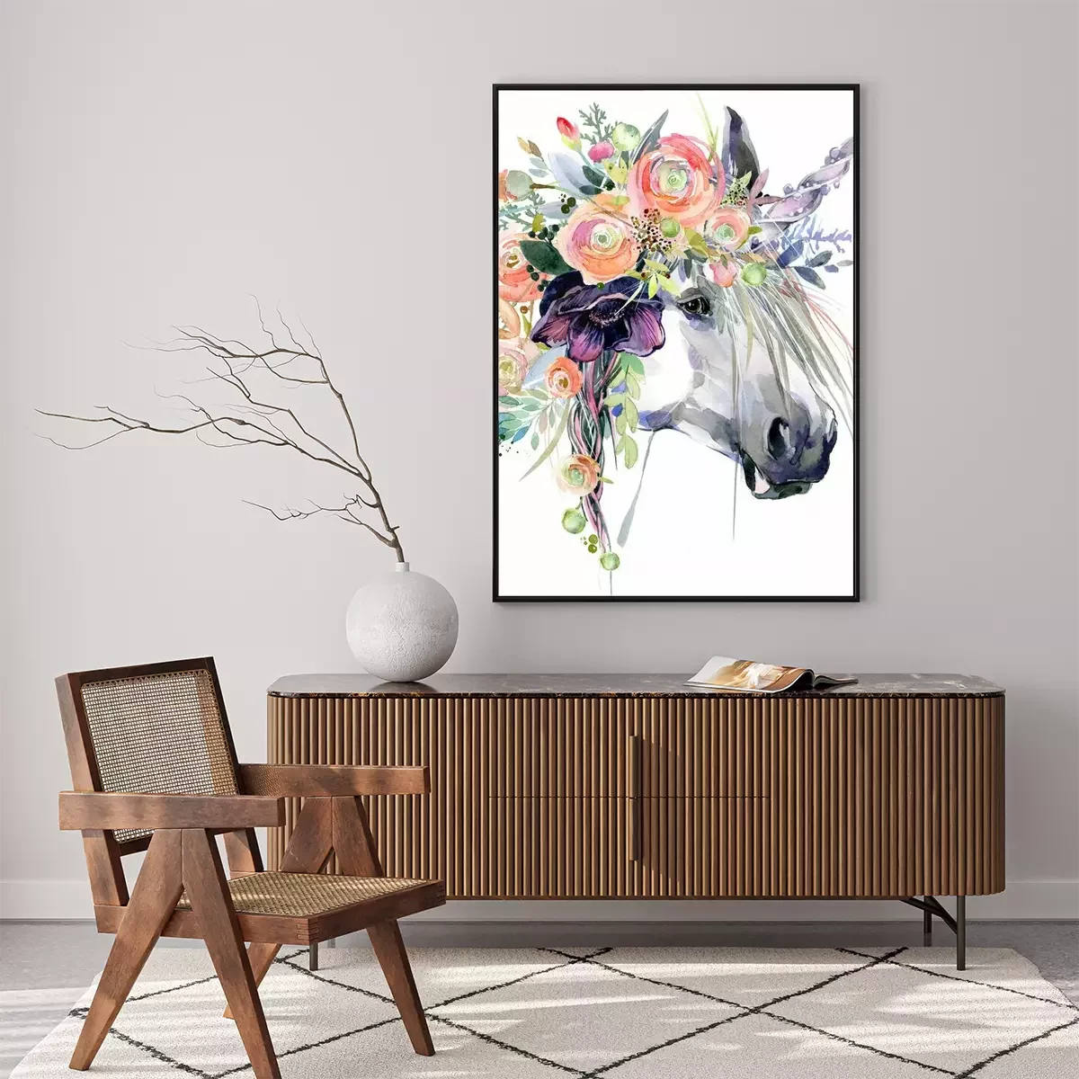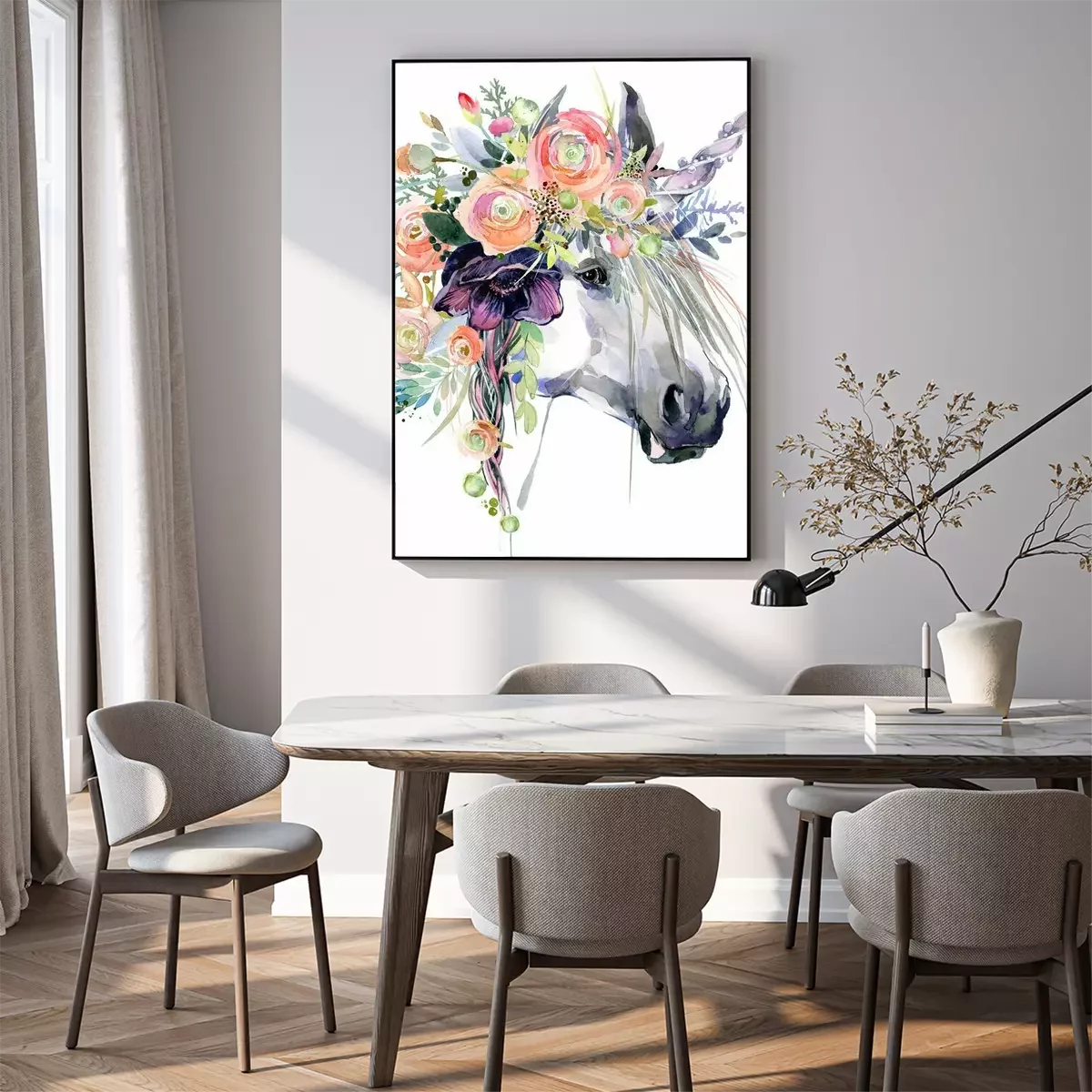 Poster: Aquarel eenhoorn met bloemen in de manen