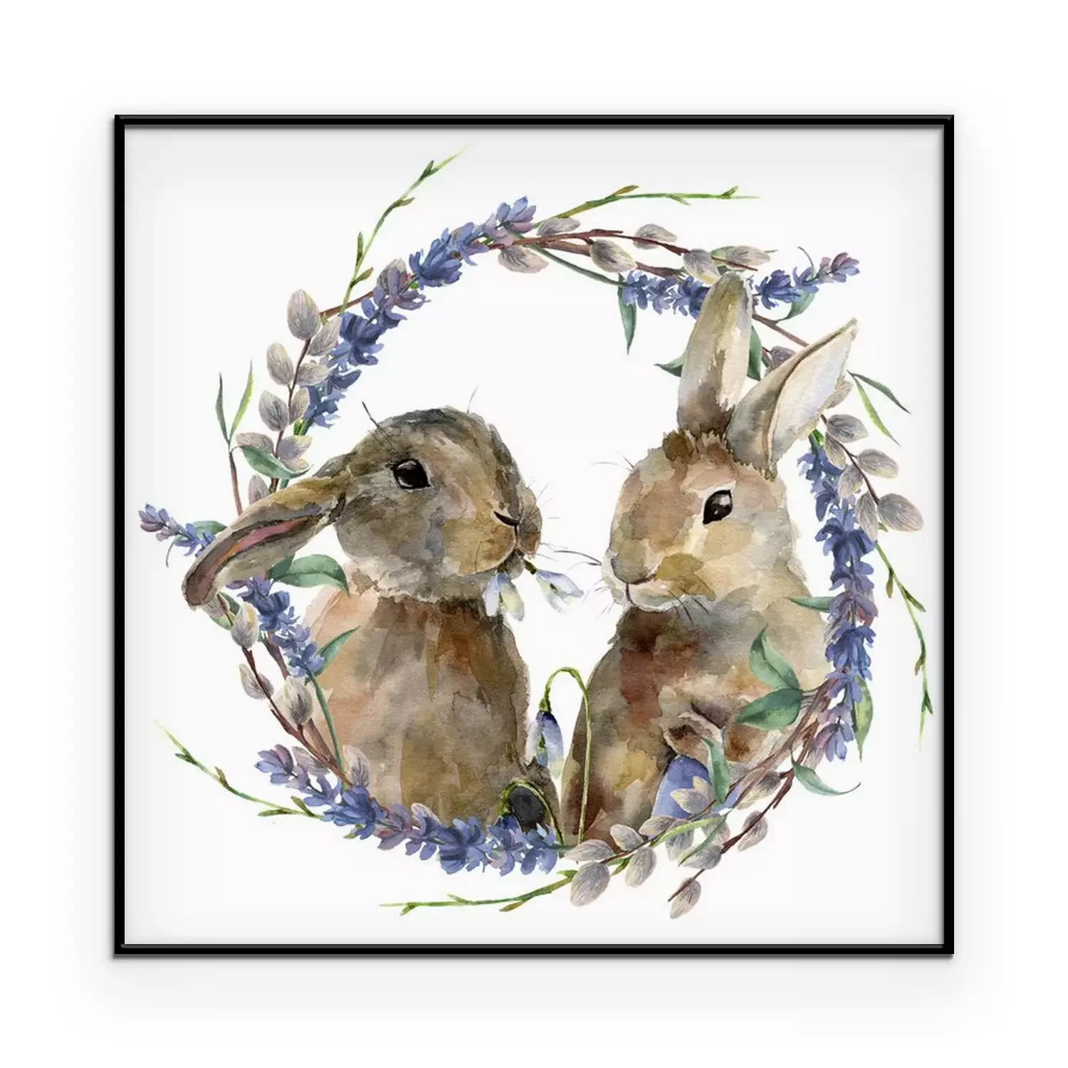 Poster Aquarel konijnen tussen lavendel en wilgentakken
