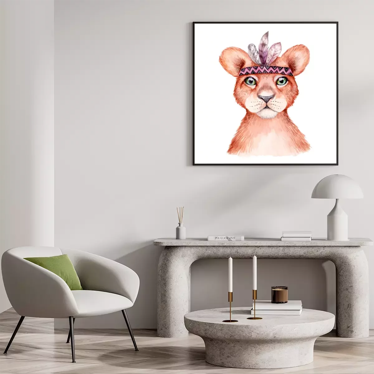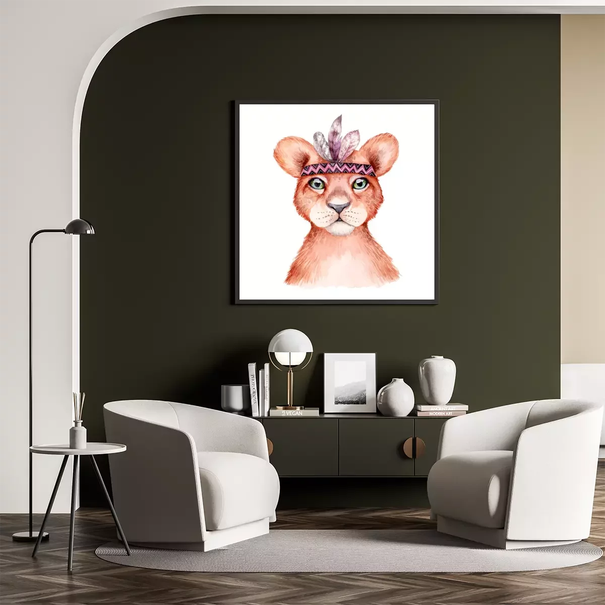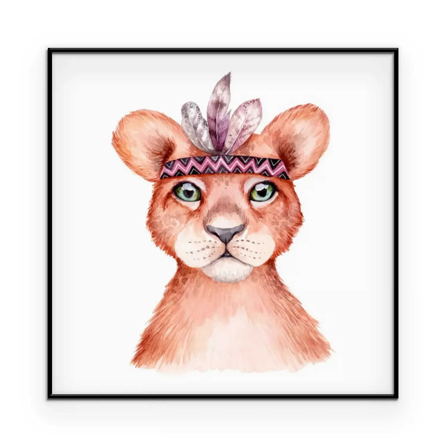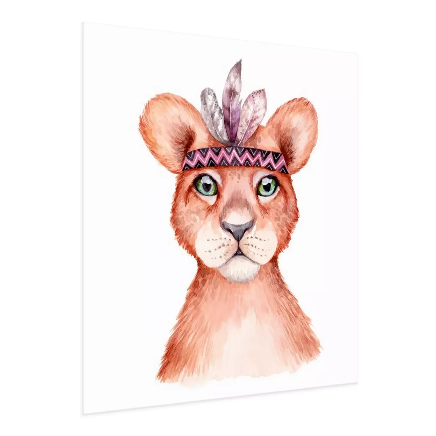 Poster: Aquarel leeuwenwelp met veren hoofdband