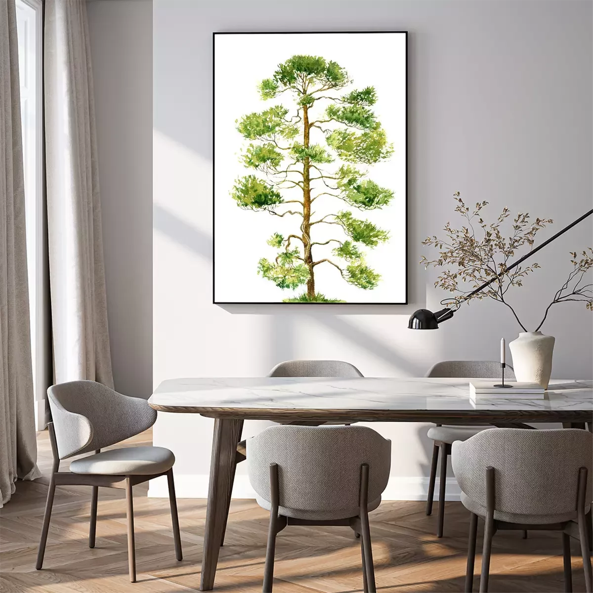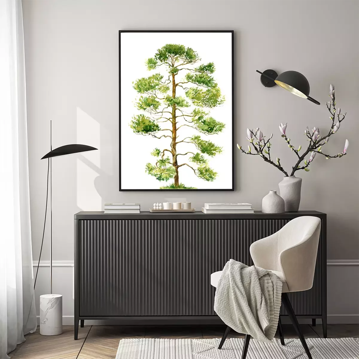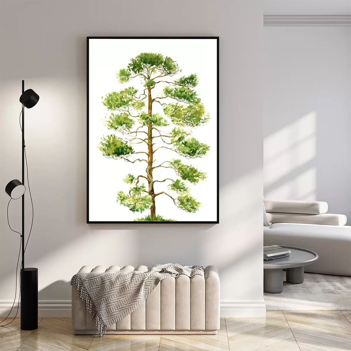 Poster: Aquarel schilderij van een dennenboom op een witte achtergrond
