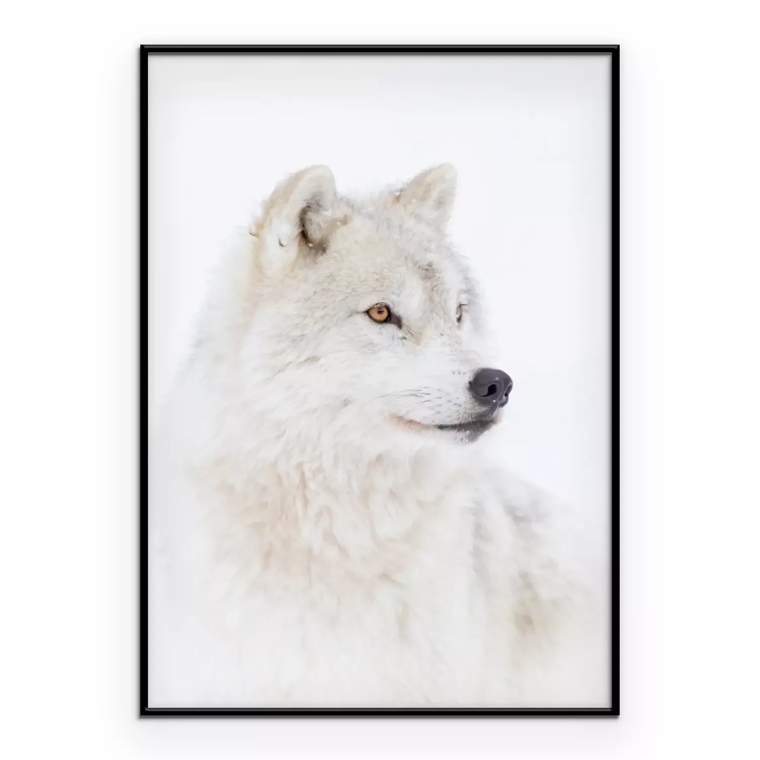 Poster: Arctic wolf headshot isolated on white background closeup in the winter snow in Canada