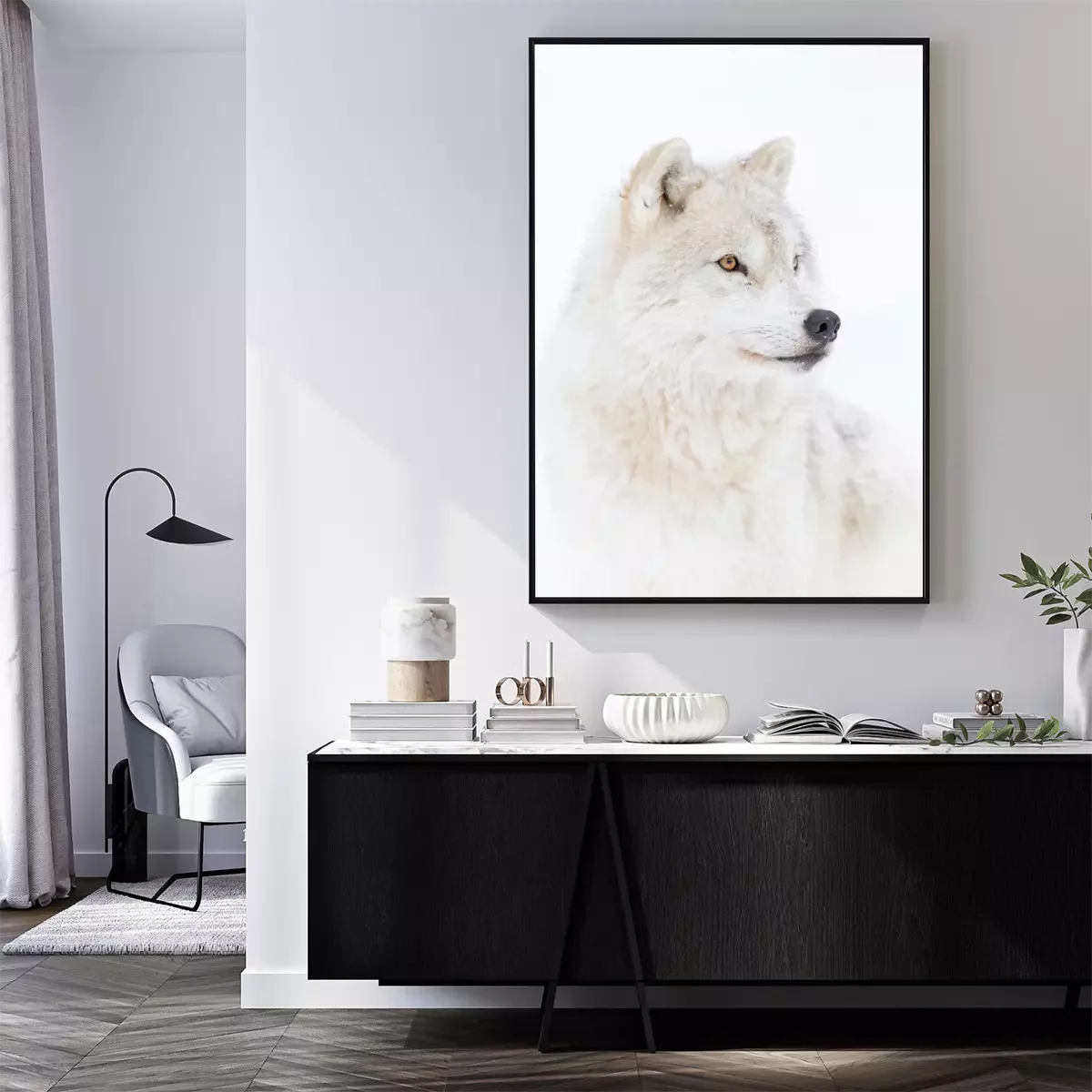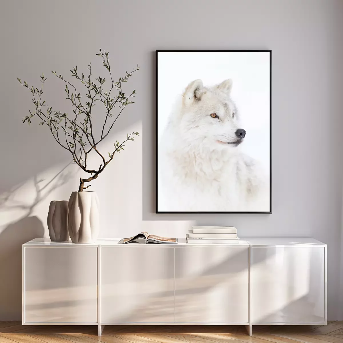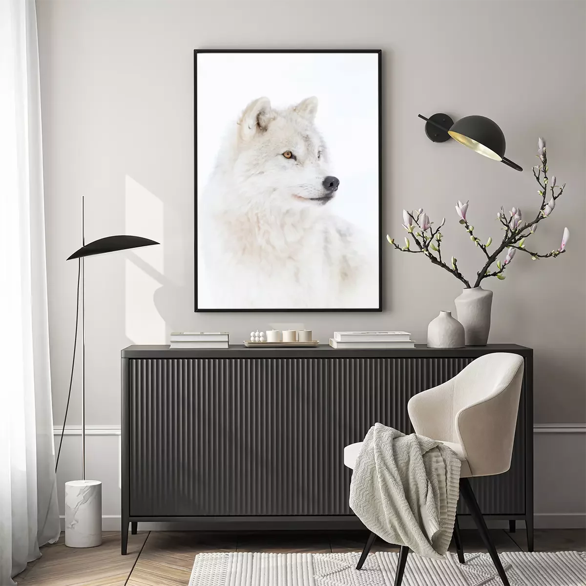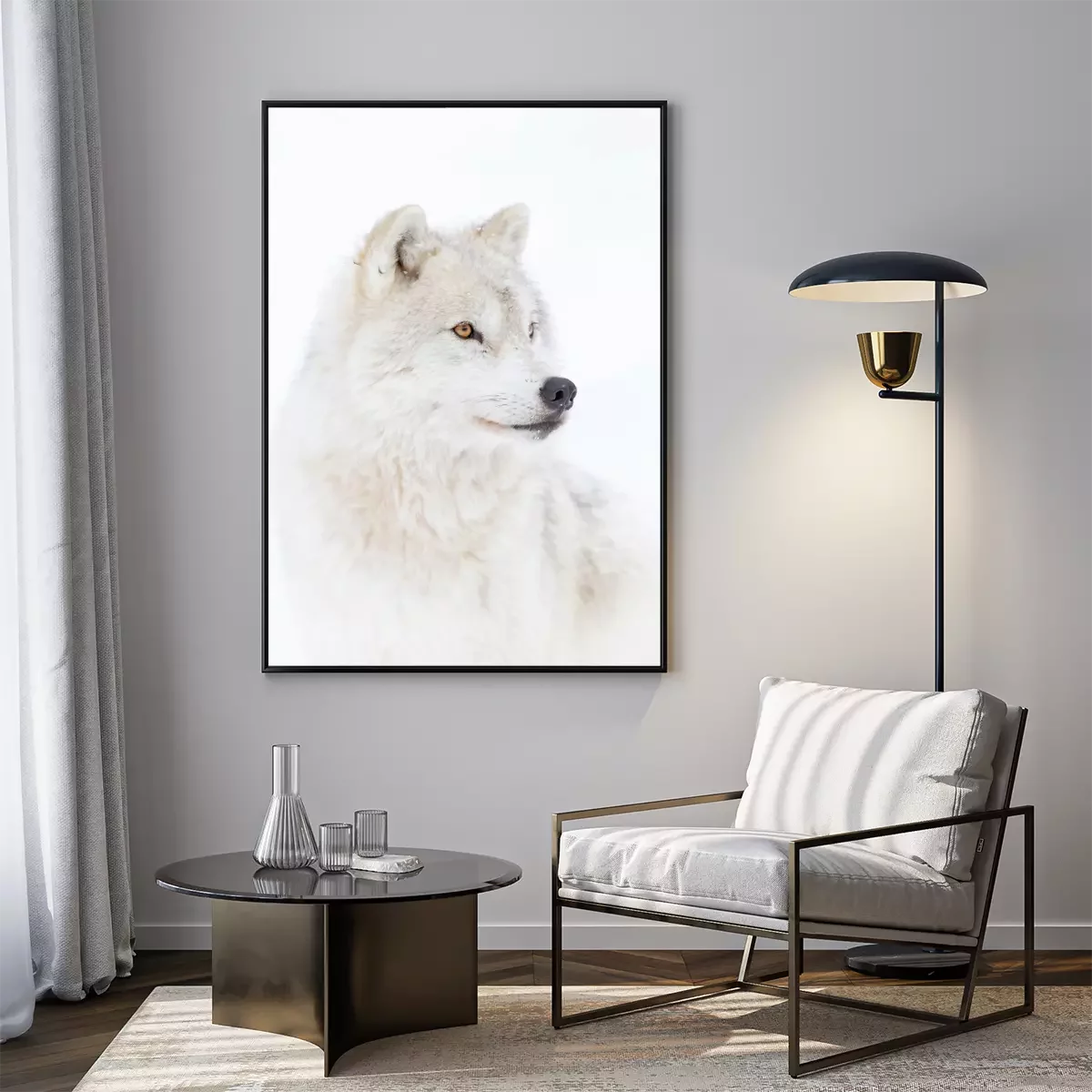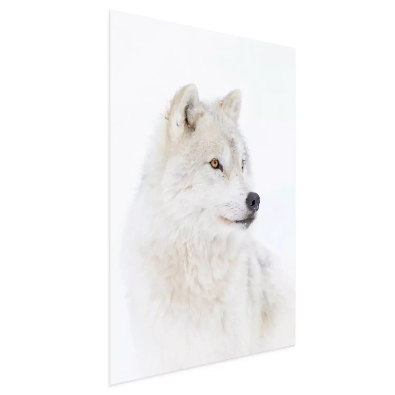 Poster Arctic wolf headshot isolated on white background closeup in the winter snow in Canada