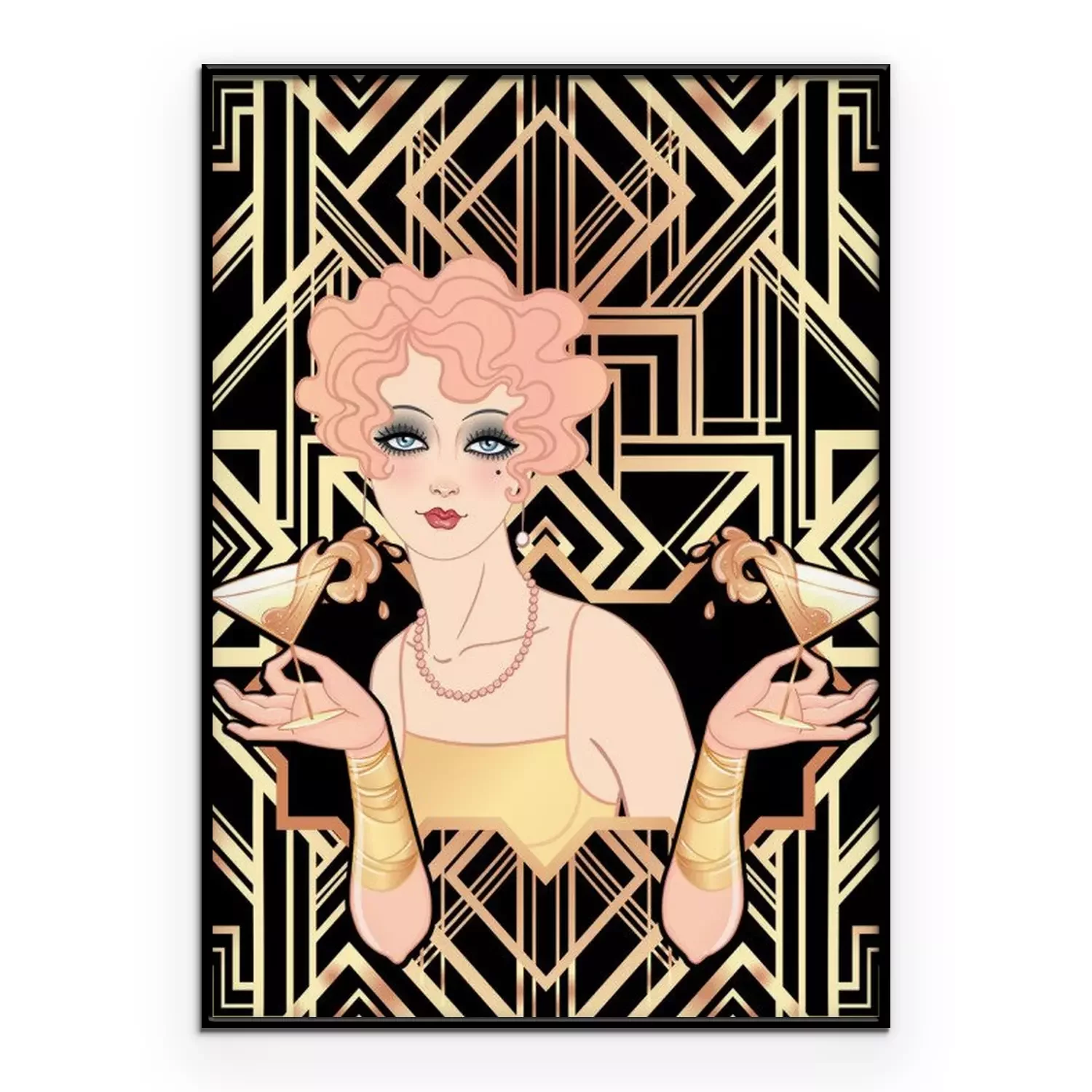 Little party never killed nobody. Female hand holding cocktail glass with splash. Art deco 1920s style vintage invitation template design for drink list, bar menu, glamour event, thematic wedding.