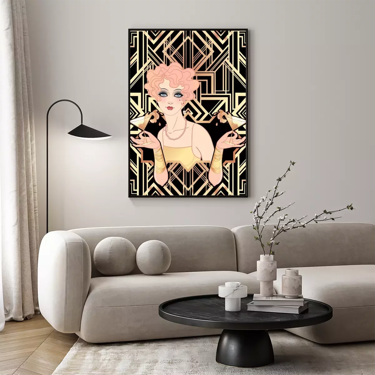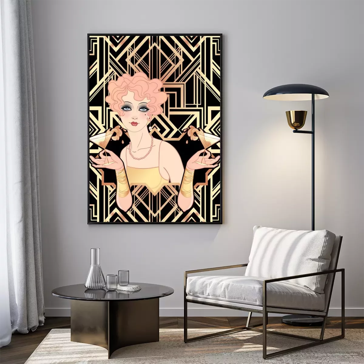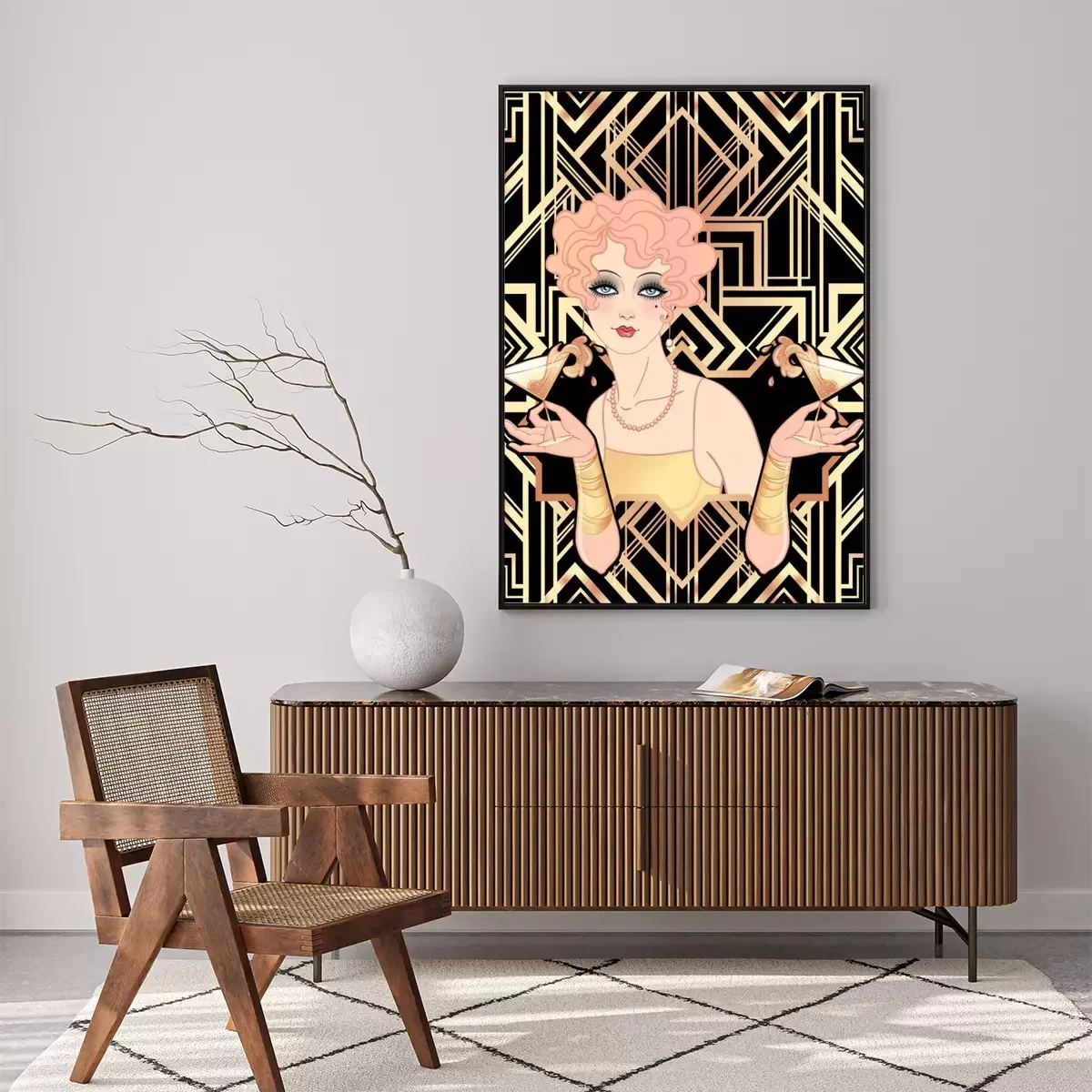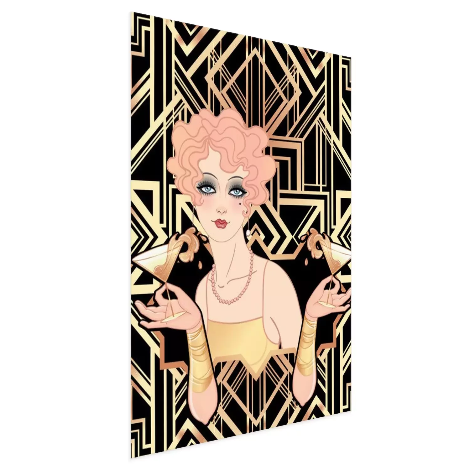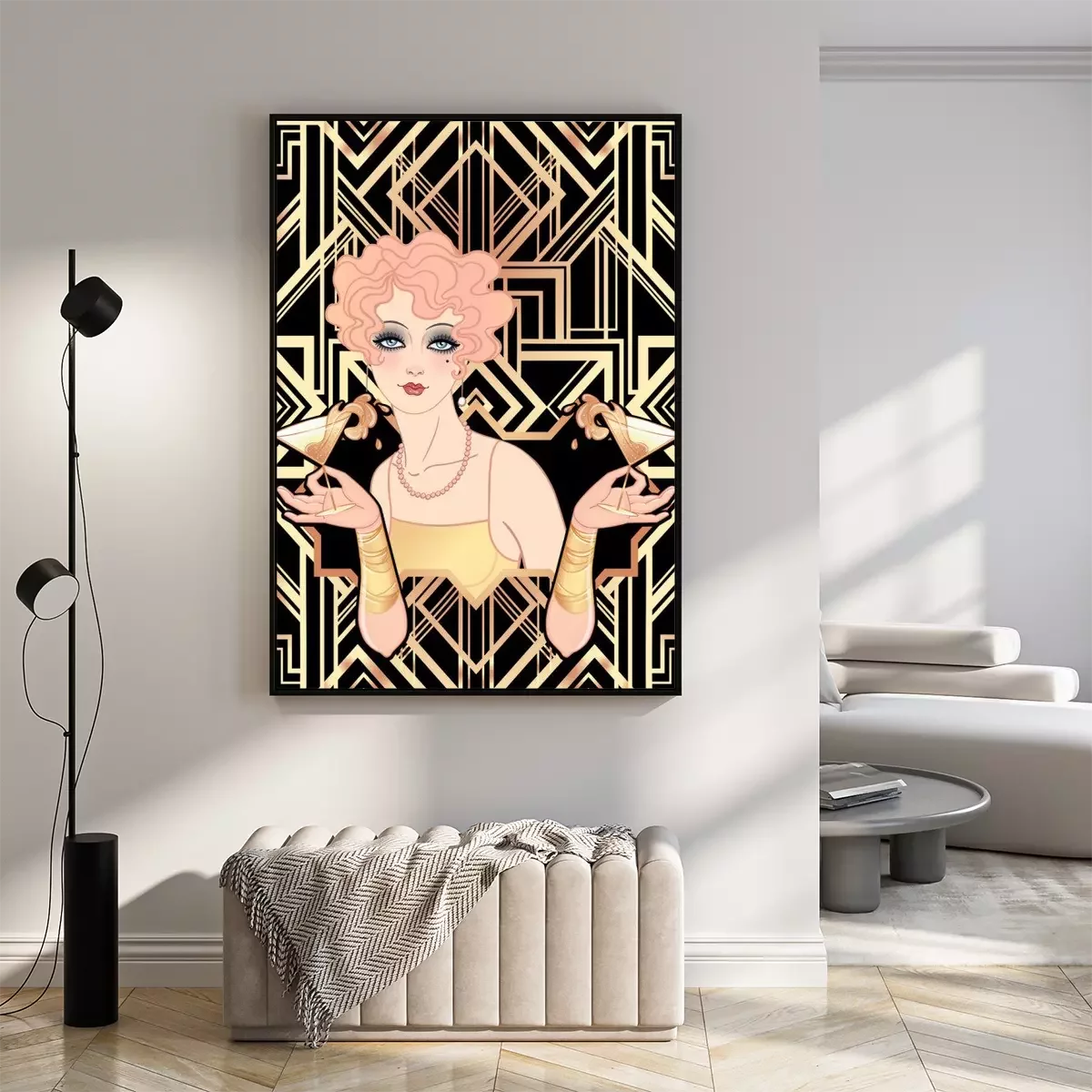 Female hand holding cocktail glass with splash. Art deco (1920's style) vintage invitation template design for drink list, bar menu, glamour event, thematic wedding, jazz party flyer.