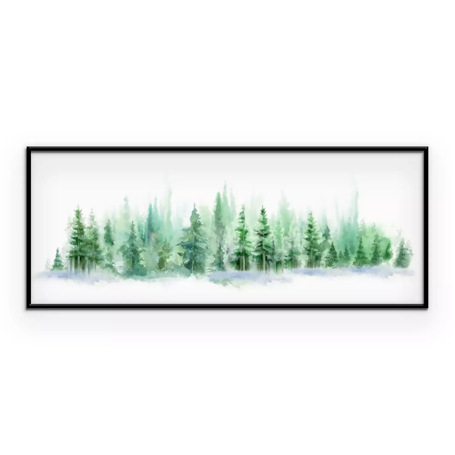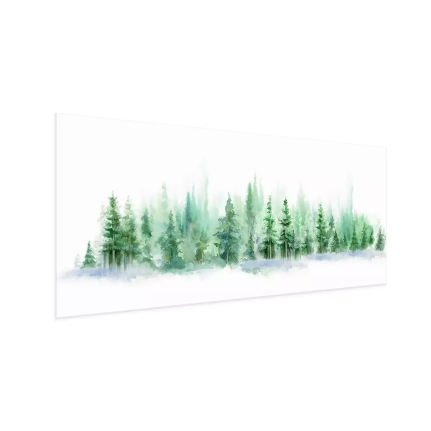 Groen landschap van mistig bos, de winterheuvel. Wilde natuur, bevroren, mistig, taiga. aquarel achtergrond