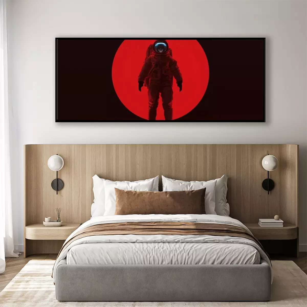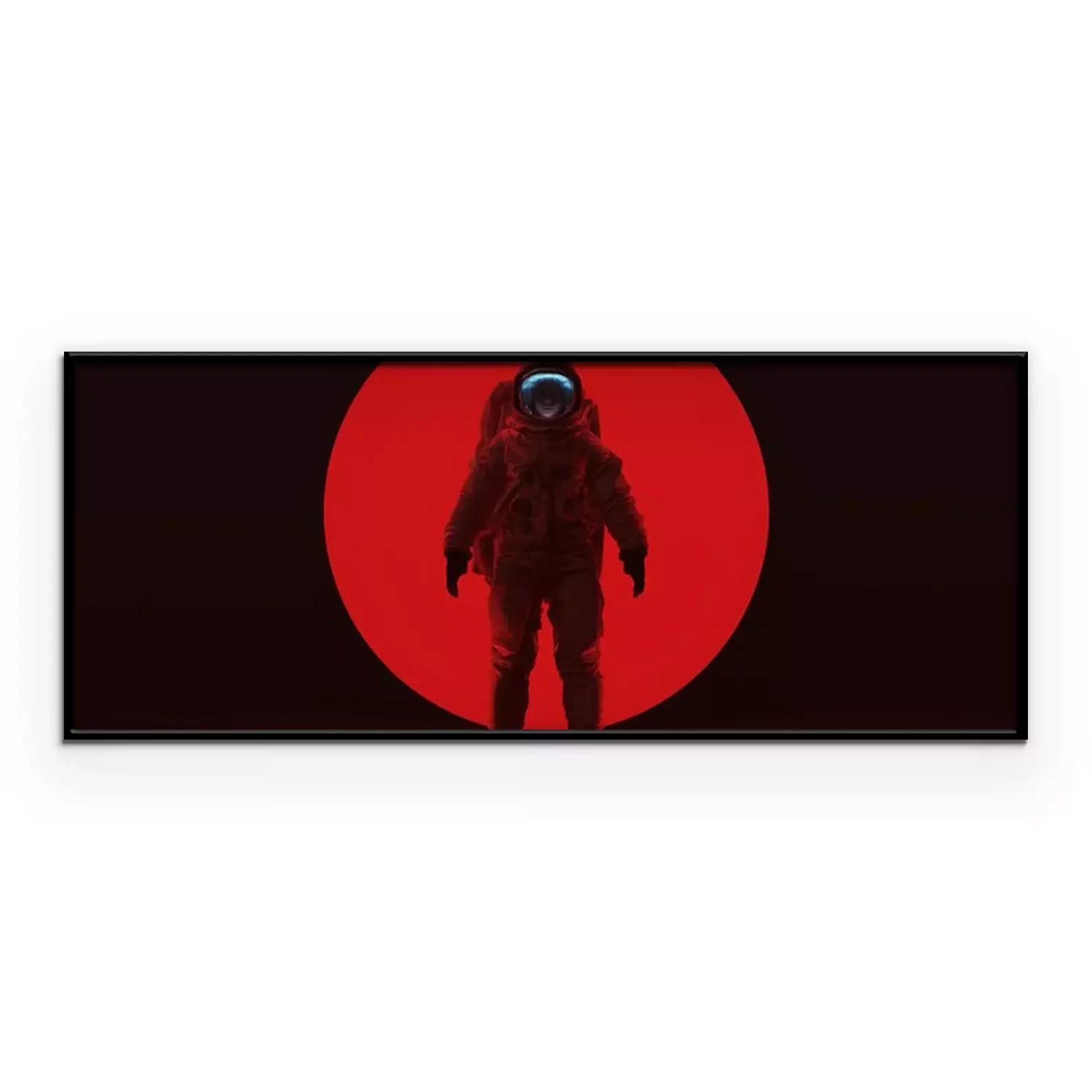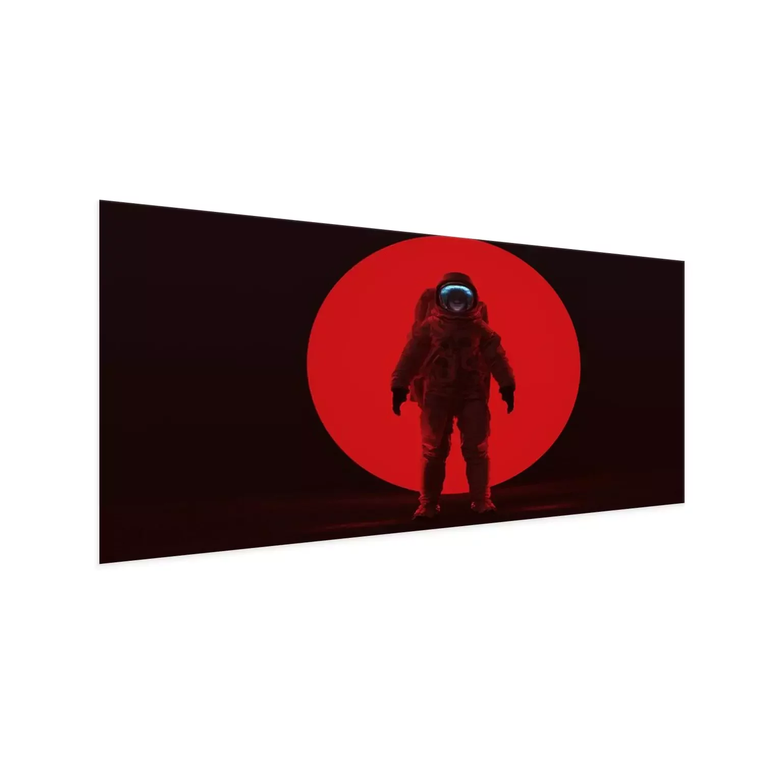 Poster Astronaut in a Red Space Suit Standing in a Alien Void with a Clear Visor Woman's Face with a Big Red Alien Sphere in a Dark foggy void Front View 3d Illustration 3d render
