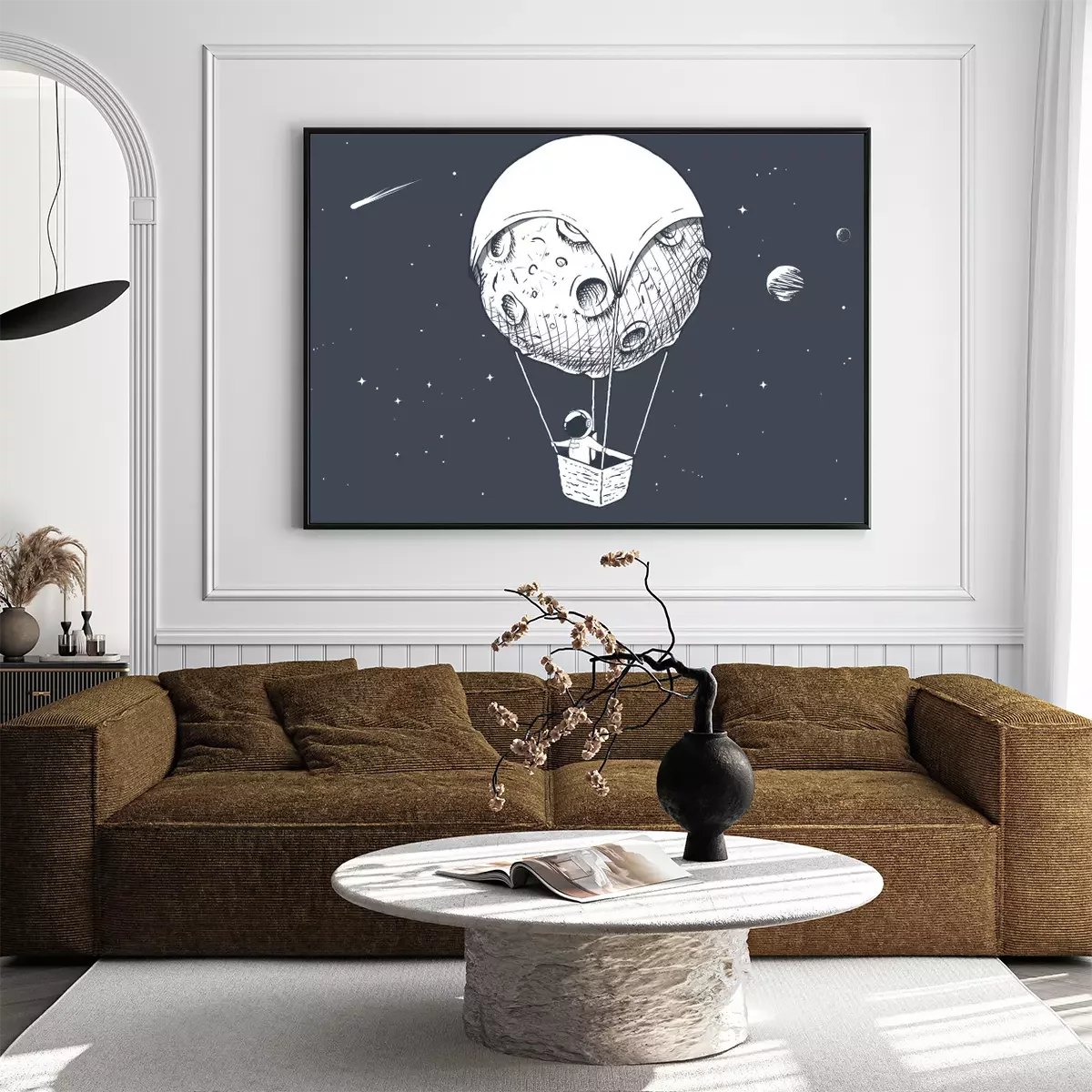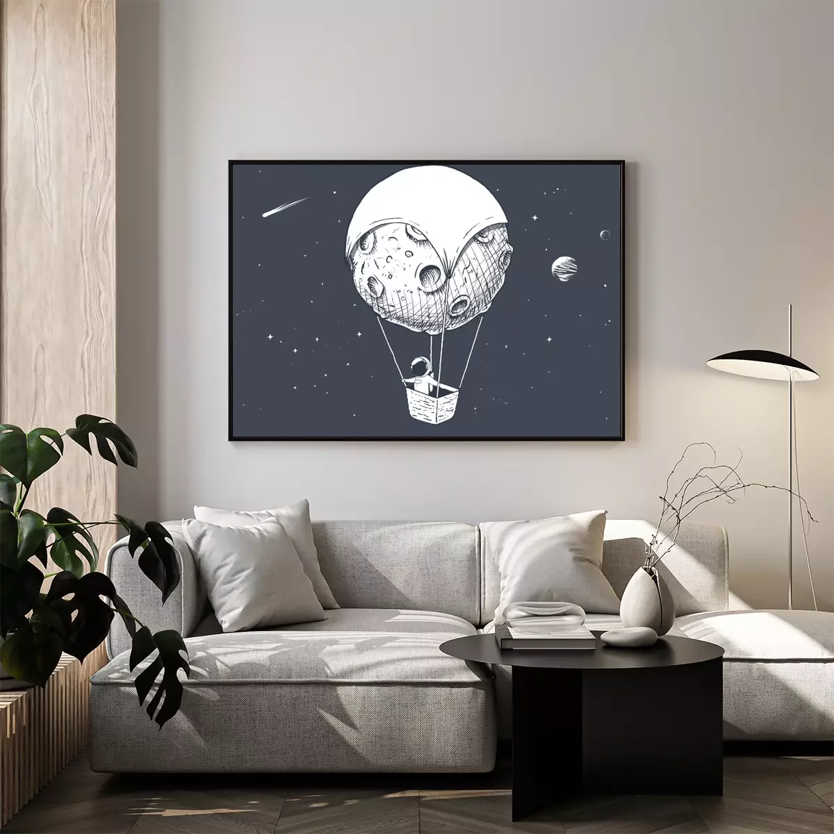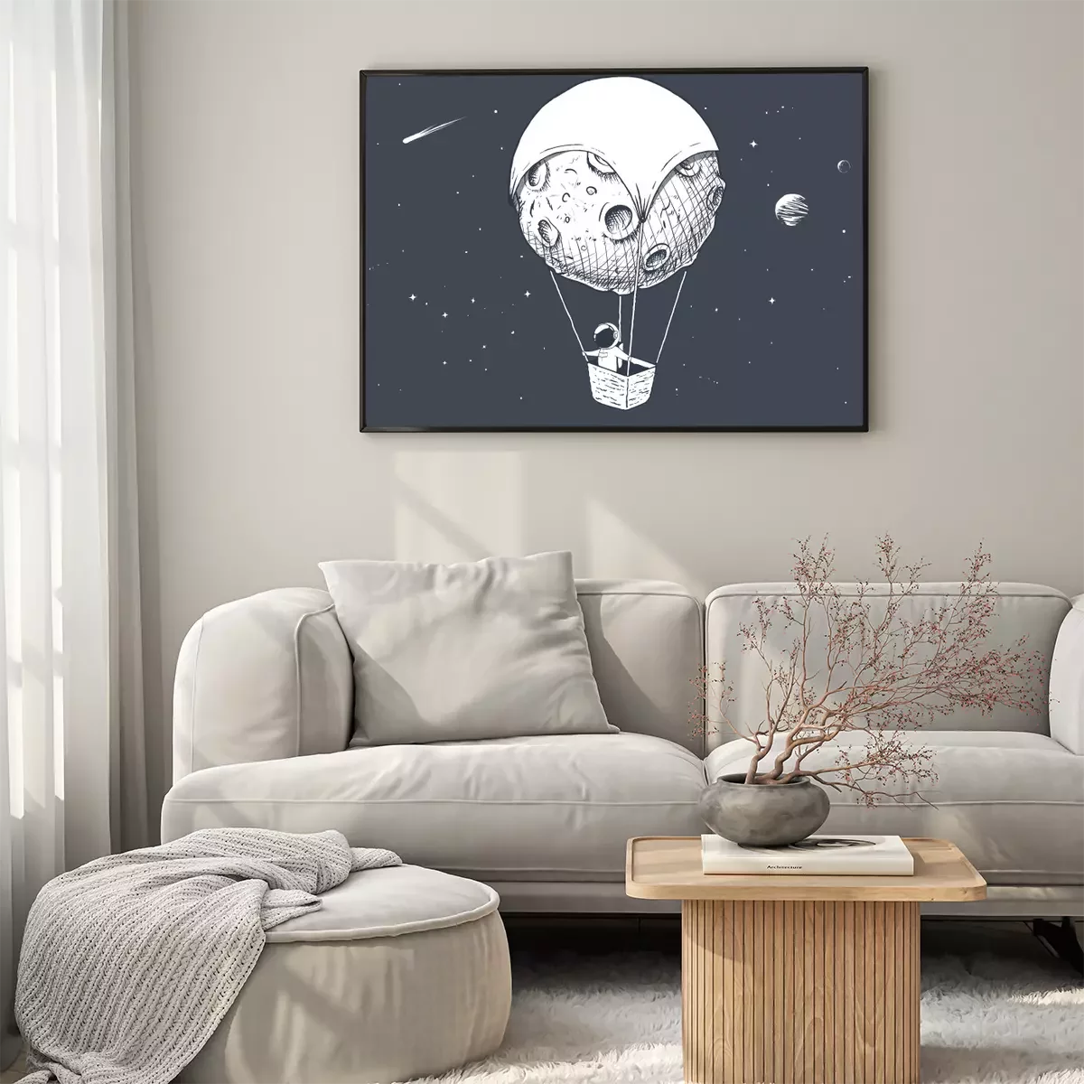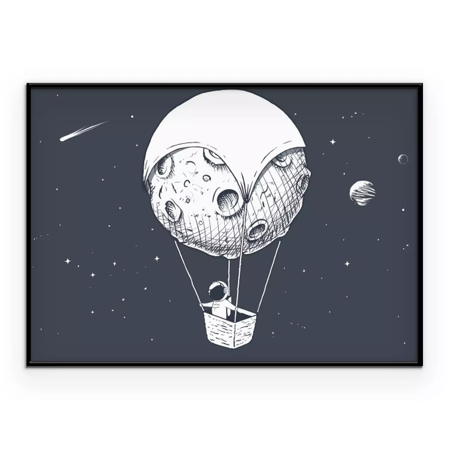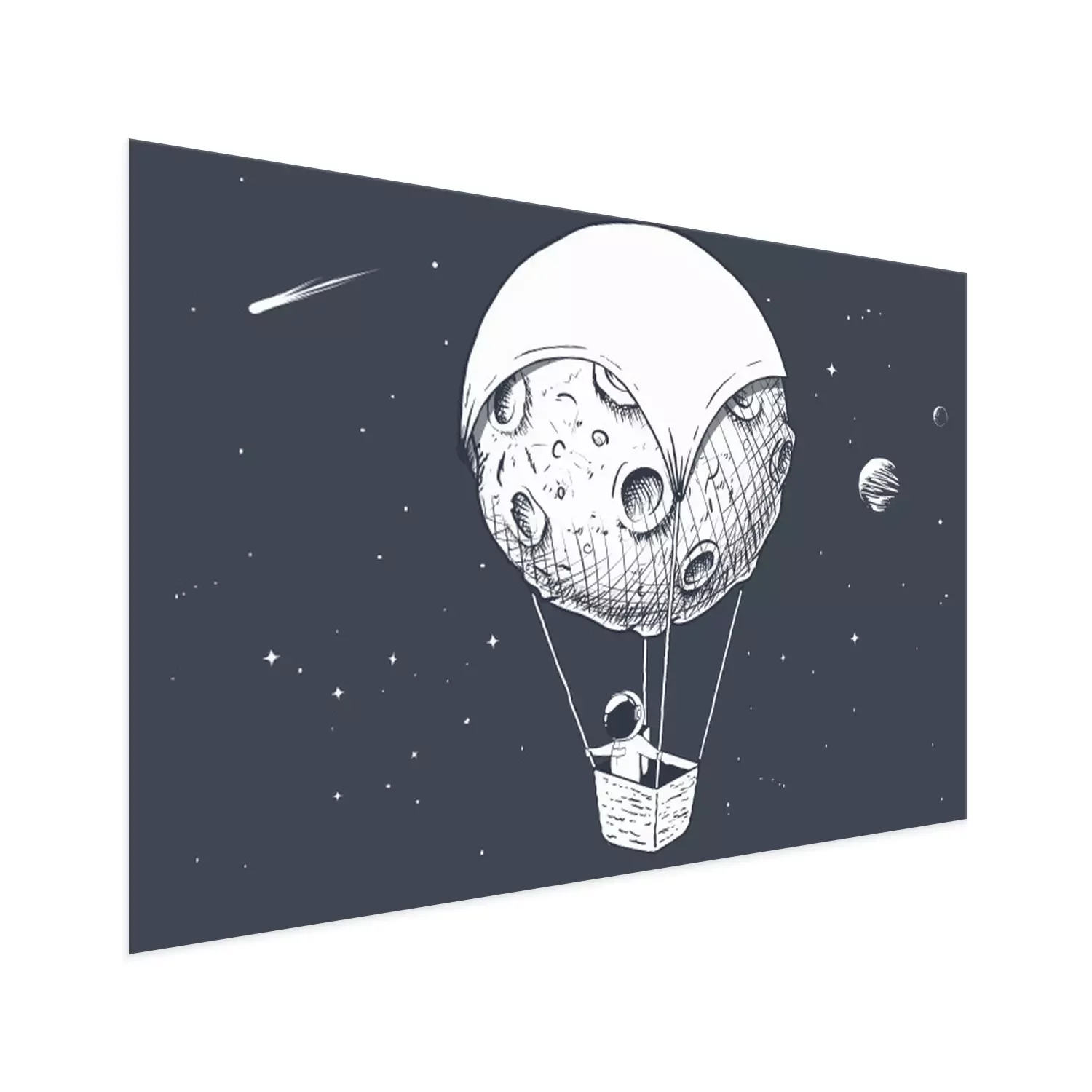 Poster: astronaut reist voorbij op een aerostaat gemaakt van maan