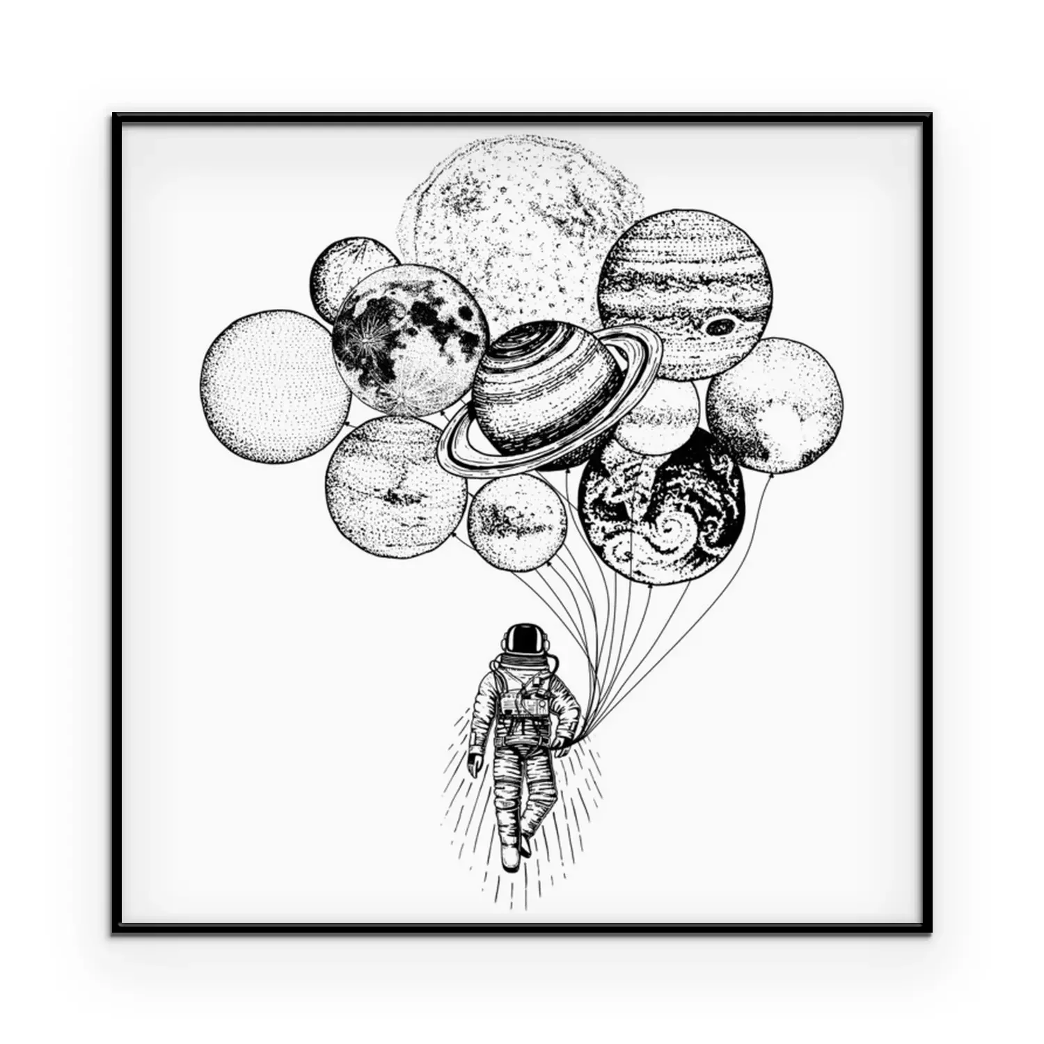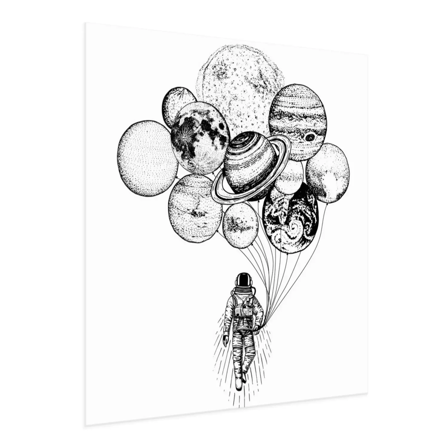 Poster: astronaut ruimtevaarder. planeten in het zonnestelsel. astronomische melkwegruimte. kosmonaut ontdek avontuur. gegraveerde hand getekend in oude schets. maan en de zon en aarde, mars en venus, ballonn