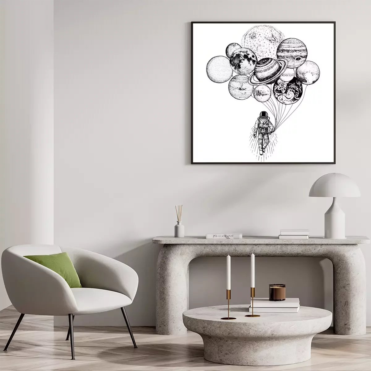 Kunstwerk van astronauten en planeten in het zonnestelsel