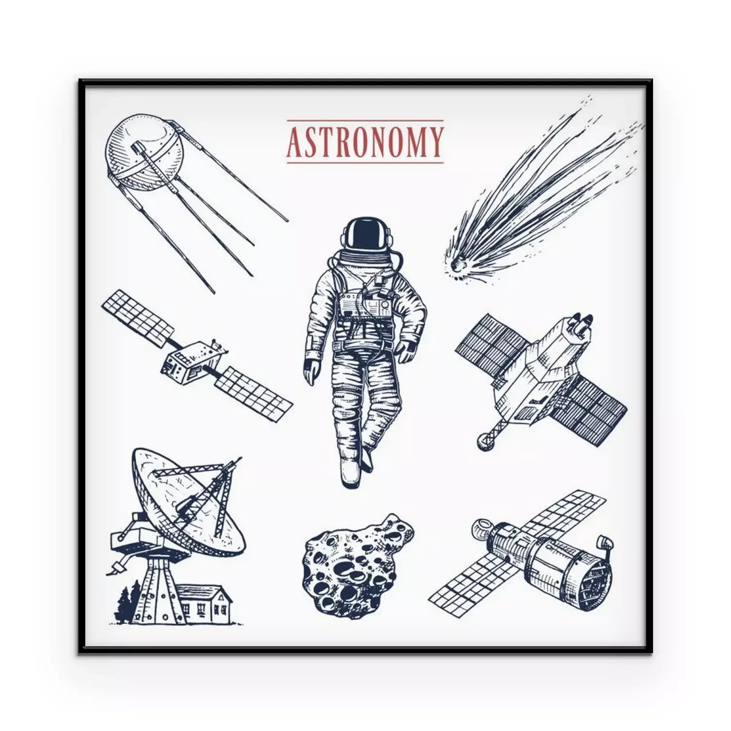 Poster: astronaut ruimtevaarder. planeten in het zonnestelsel. astronomische melkweg. kosmonaut ontdek avontuur. gegraveerde hand getekend in oude schets, vintage stijl. spaceshuttle, radiotelescoop en komeet