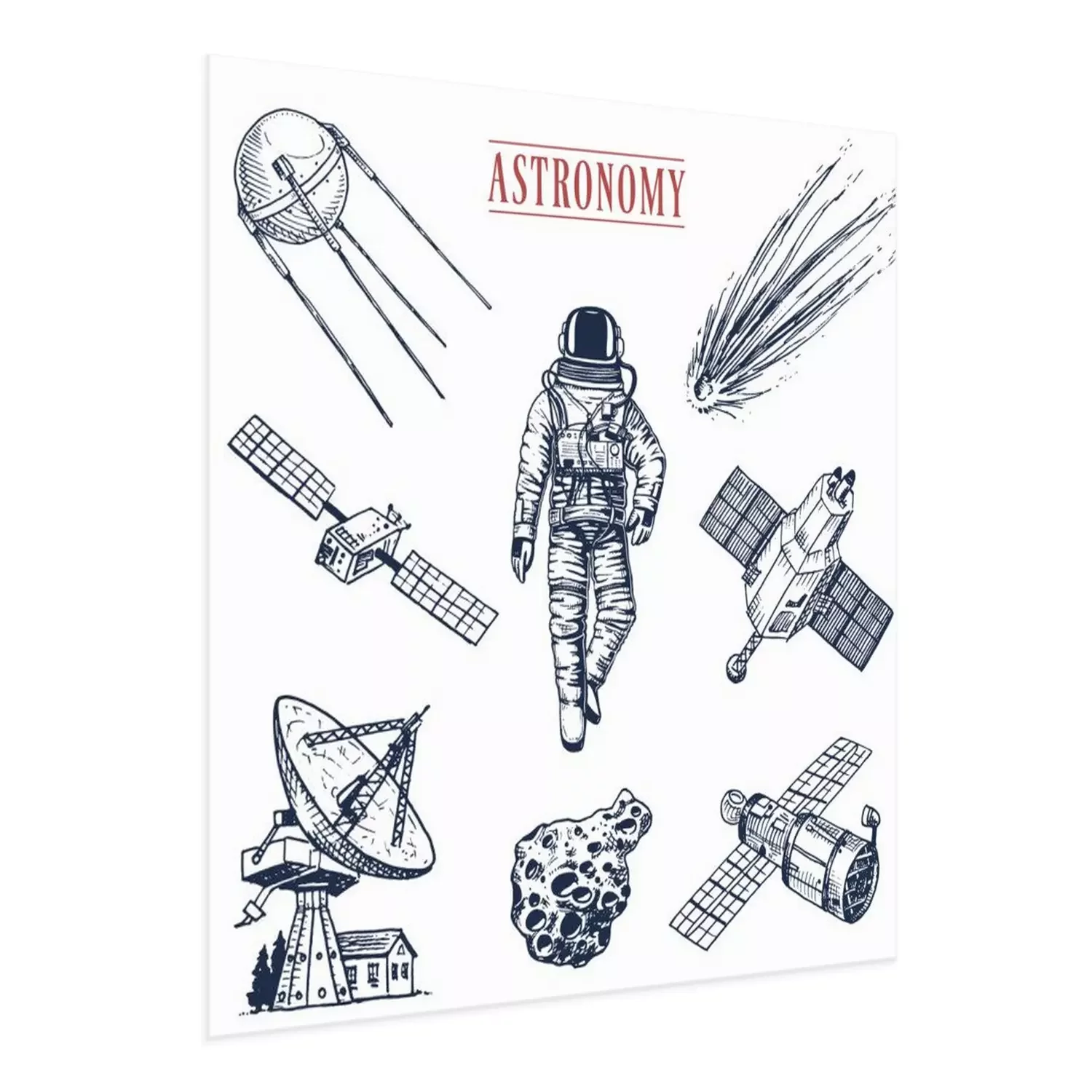 Poster astronaut ruimtevaarder. planeten in het zonnestelsel. astronomische melkweg. kosmonaut ontdek avontuur. gegraveerde hand getekend in oude schets, vintage stijl. spaceshuttle, radiotelescoop en komeet