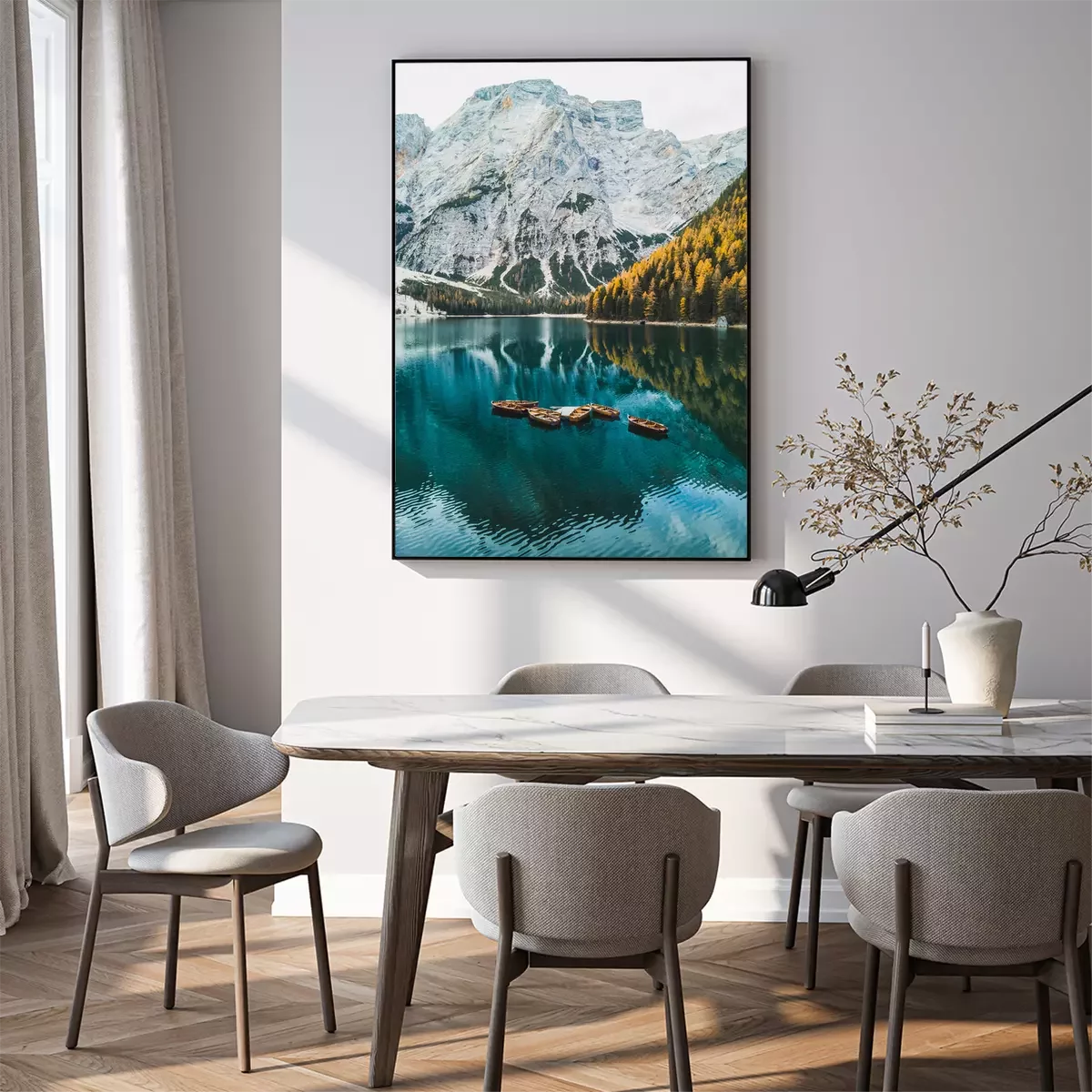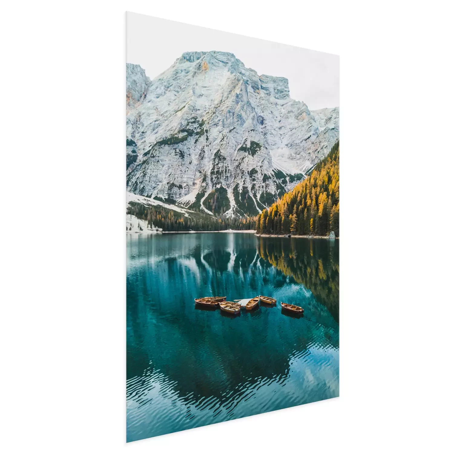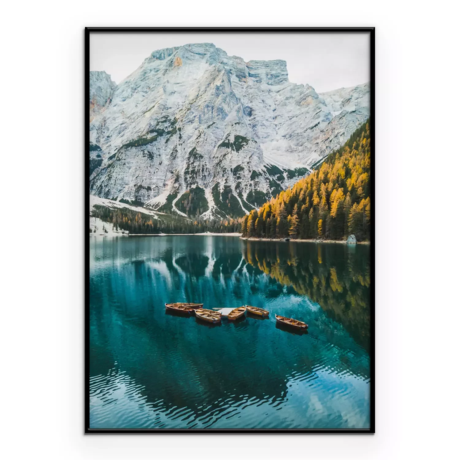 Poster: Autumn landscape of Lago di Braies Lake in italian Dolomites mountains in northern Italy. Drone aerial photo with Wooden boats and beautiful reflection in calm water at sunrise. Pragser Wildsee
