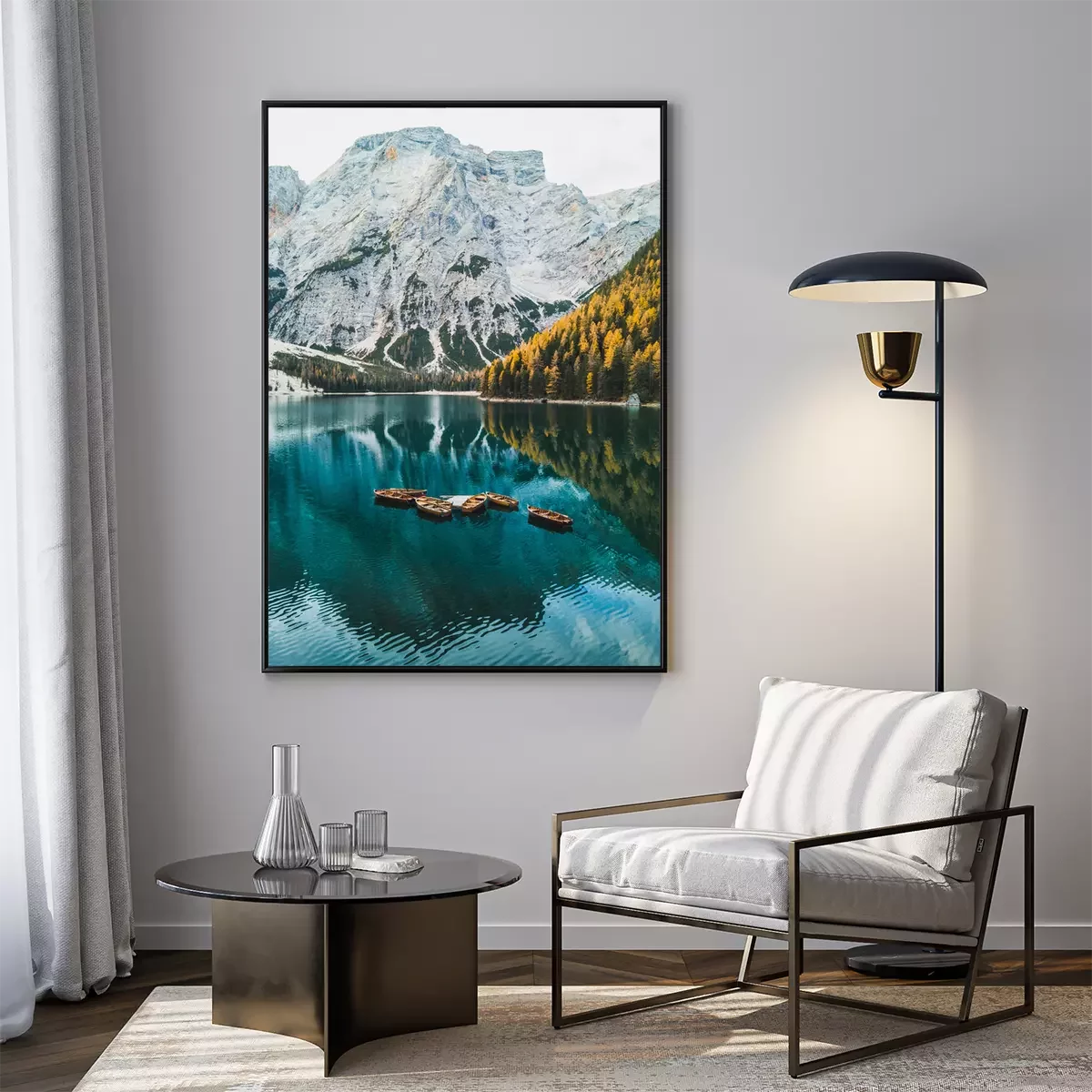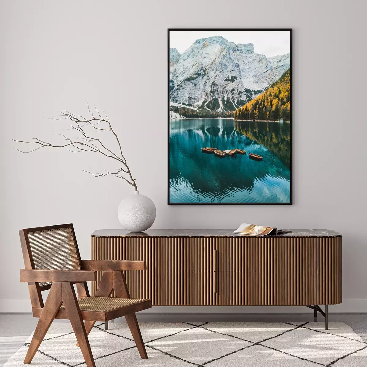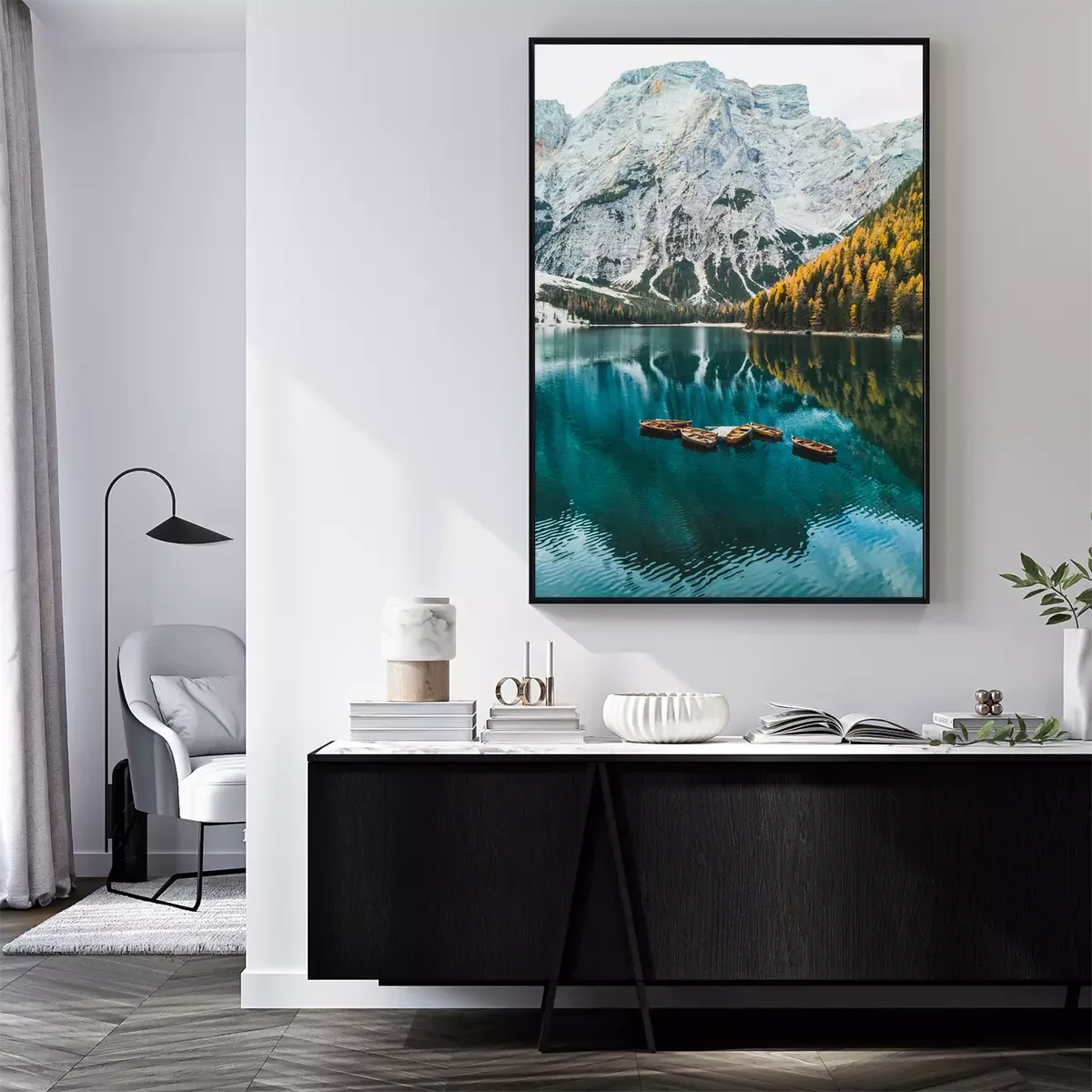 Poster: Autumn landscape of Lago di Braies Lake in italian Dolomites mountains in northern Italy. Drone aerial photo with Wooden boats and beautiful reflection in calm water at sunrise. Pragser Wildsee
