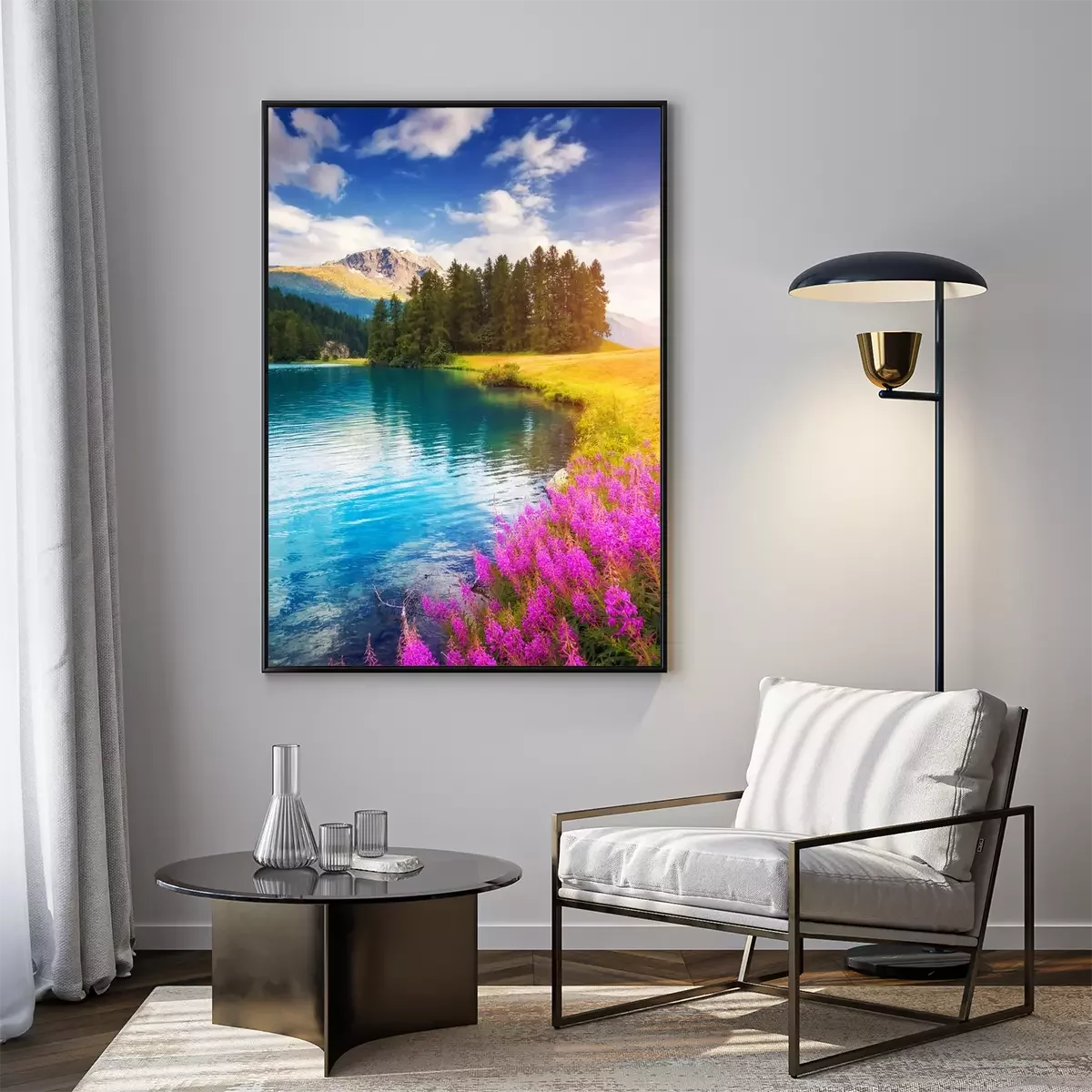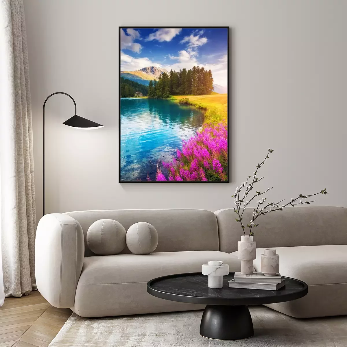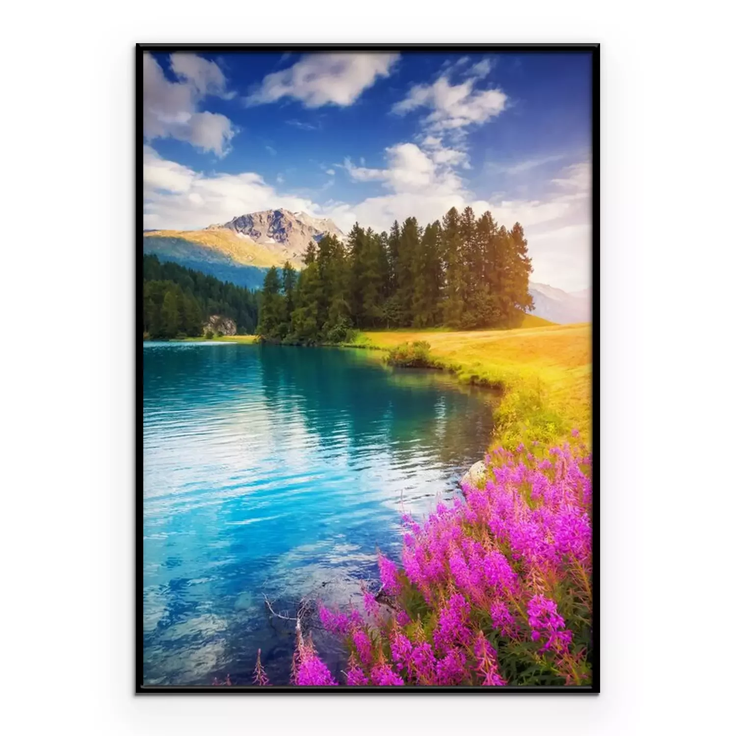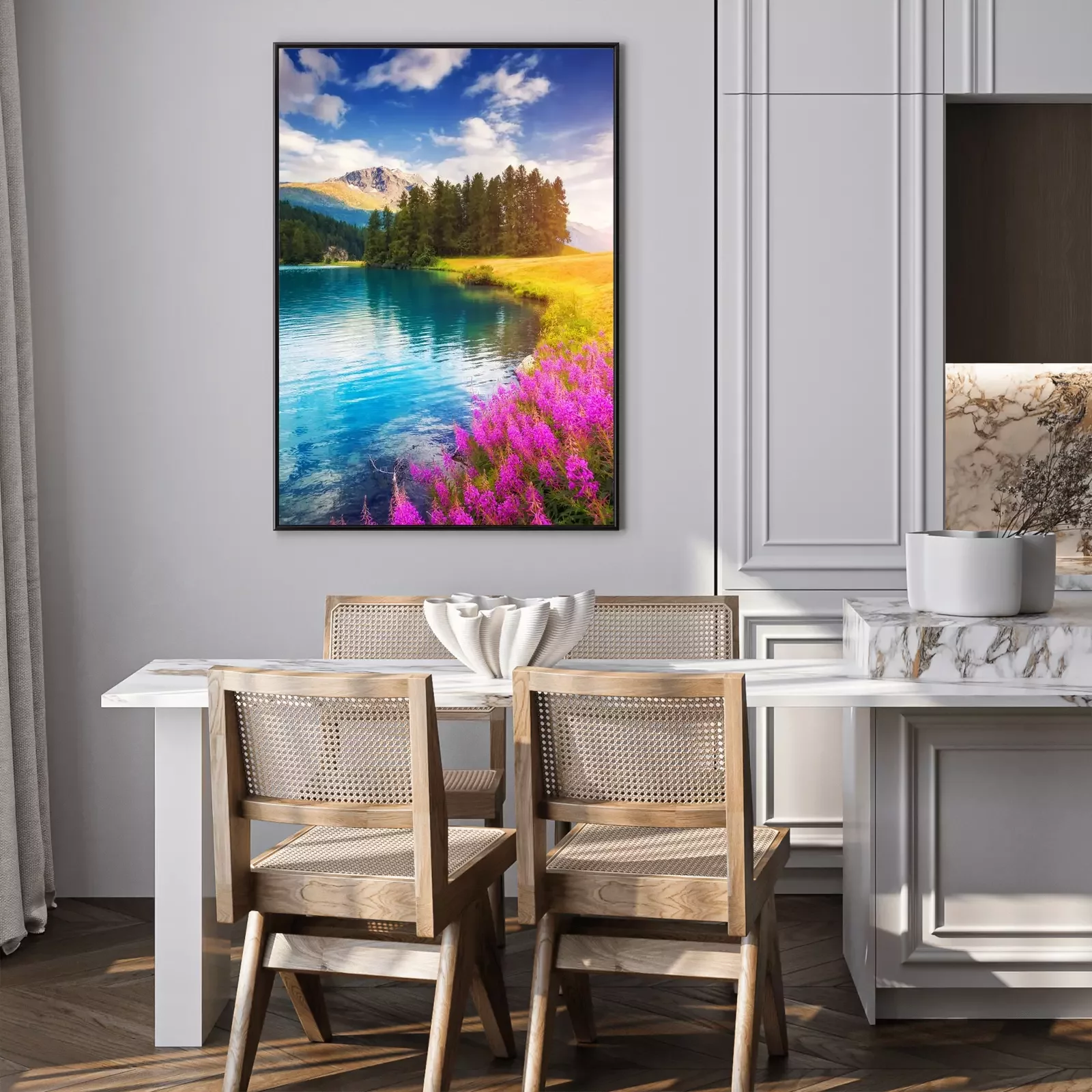 Poster Azure pond Champfer is a unique place. Location Silvaplana village, Swiss alps.