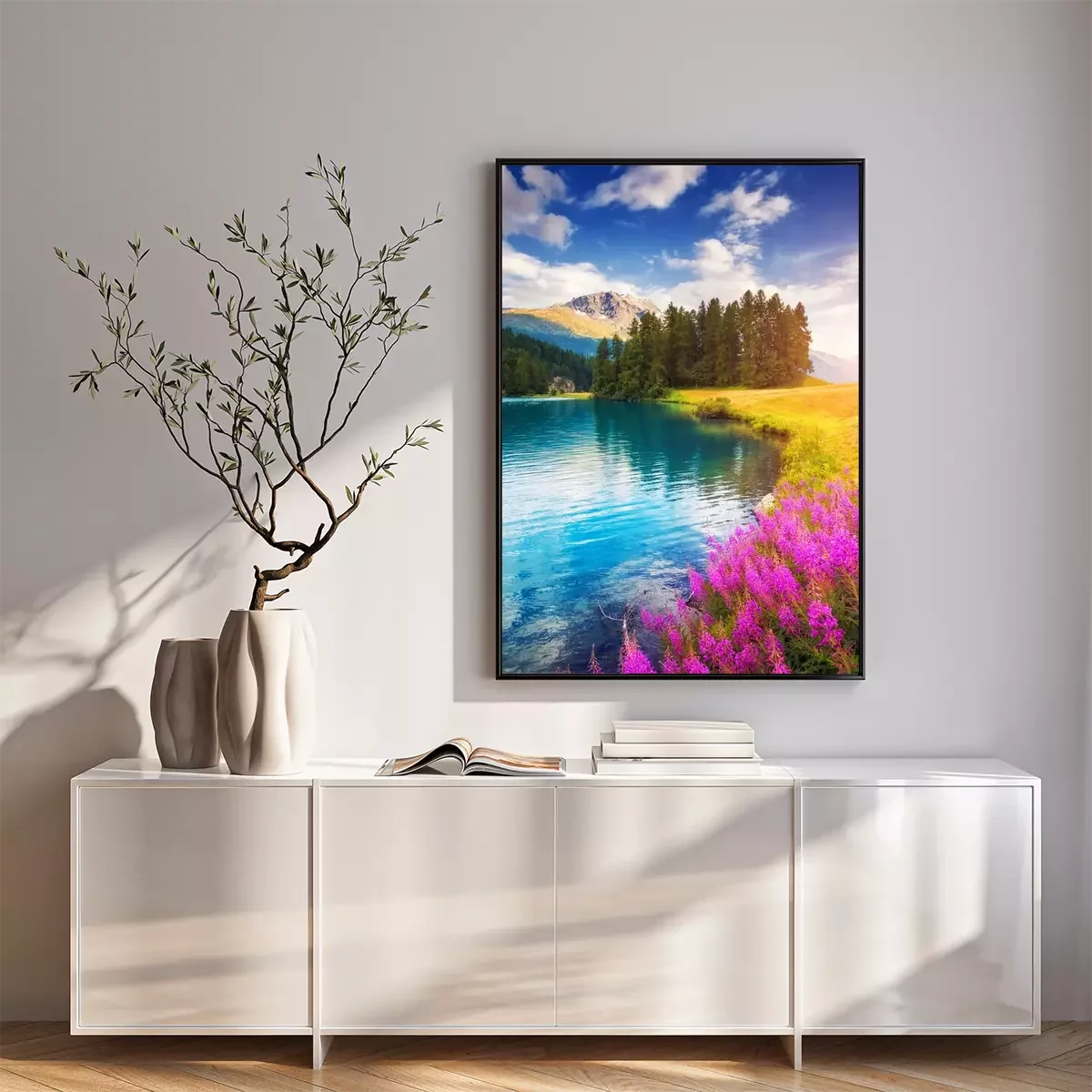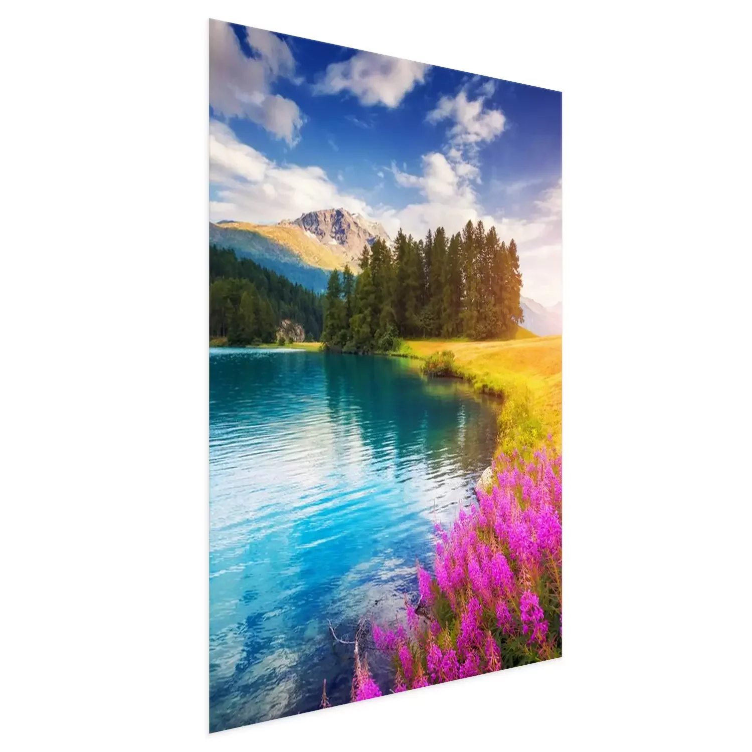 Poster: Azure pond Champfer is a unique place. Location Silvaplana village, Swiss alps.