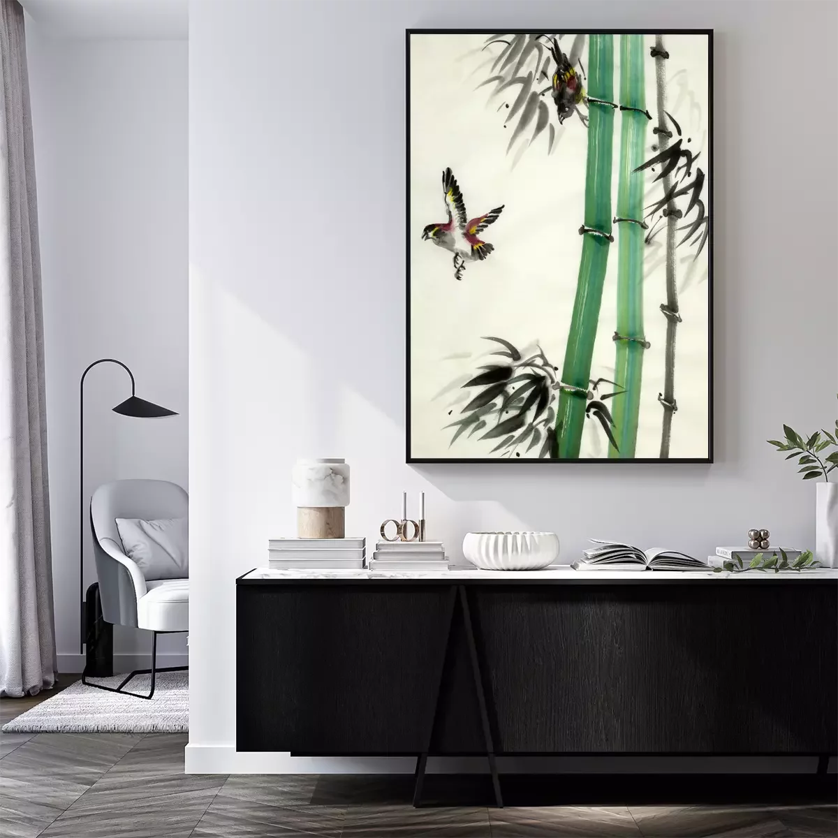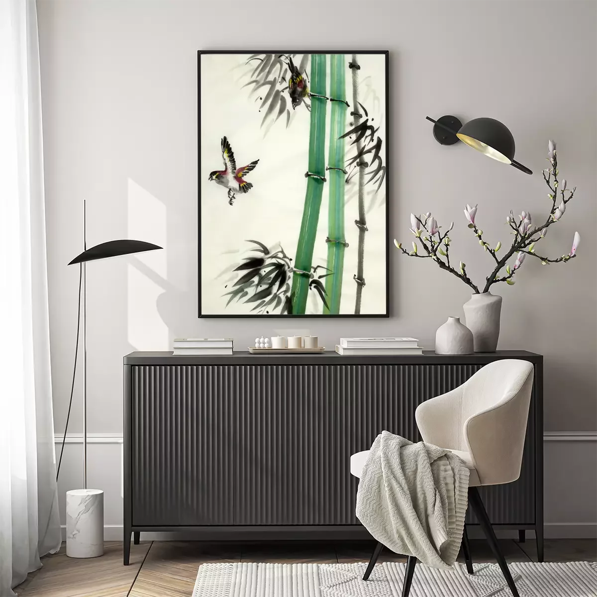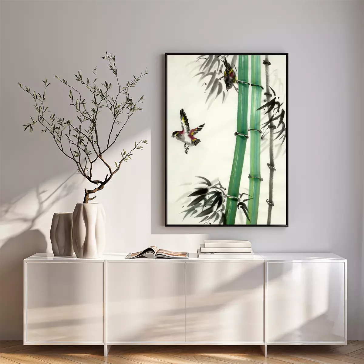 Poster: Bamboe en beschilderde vogels