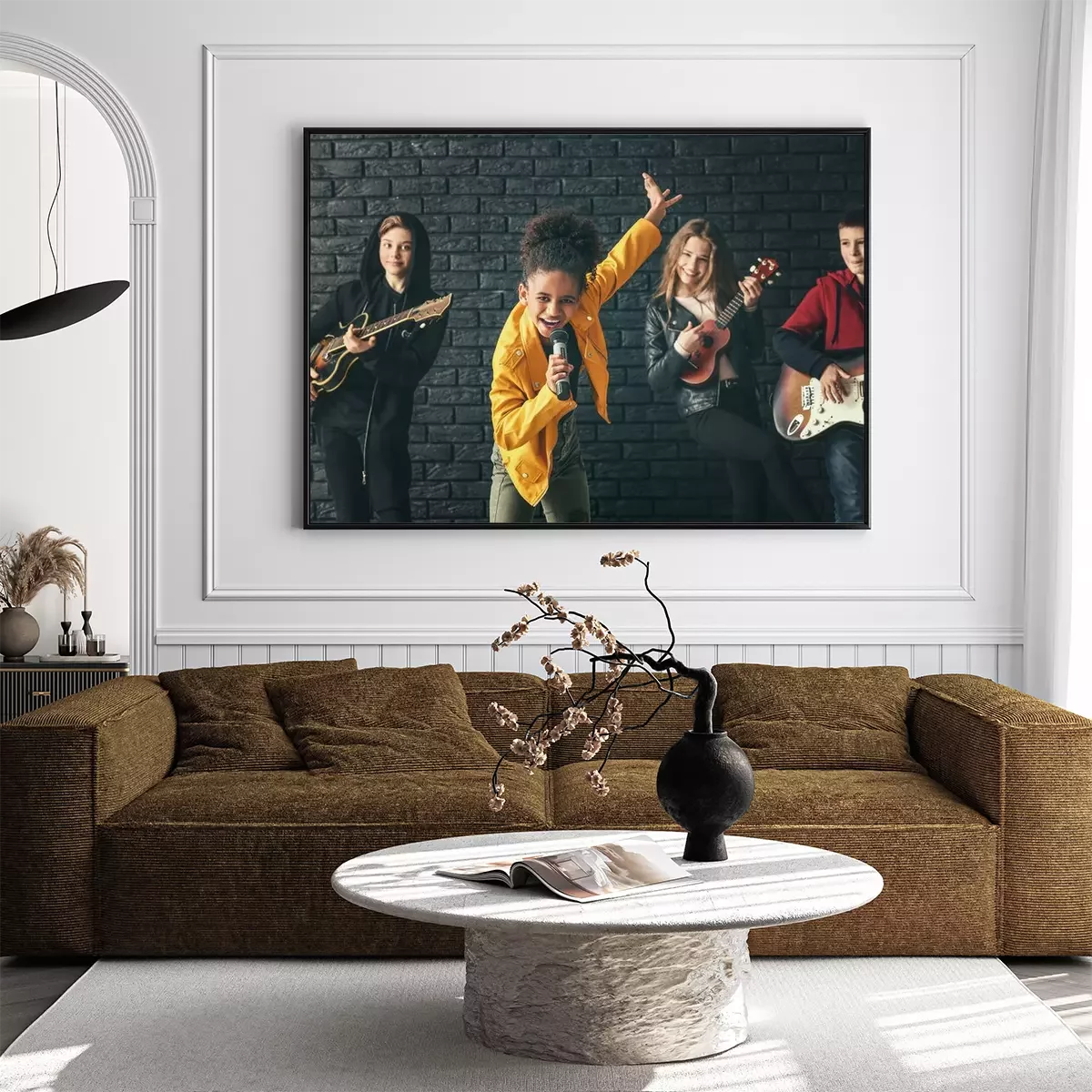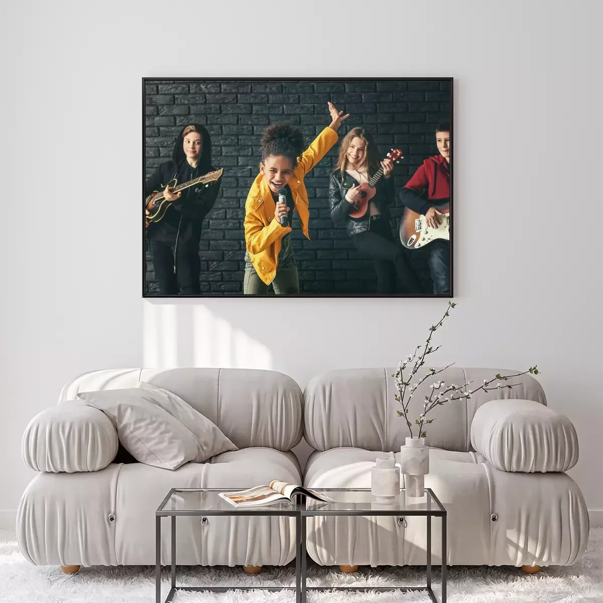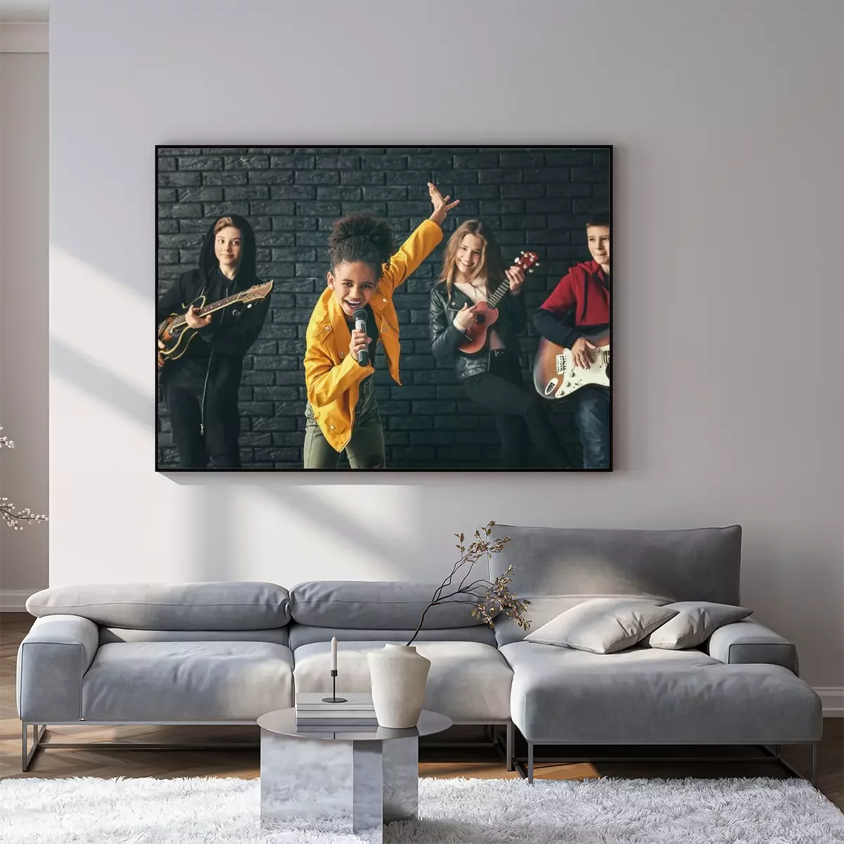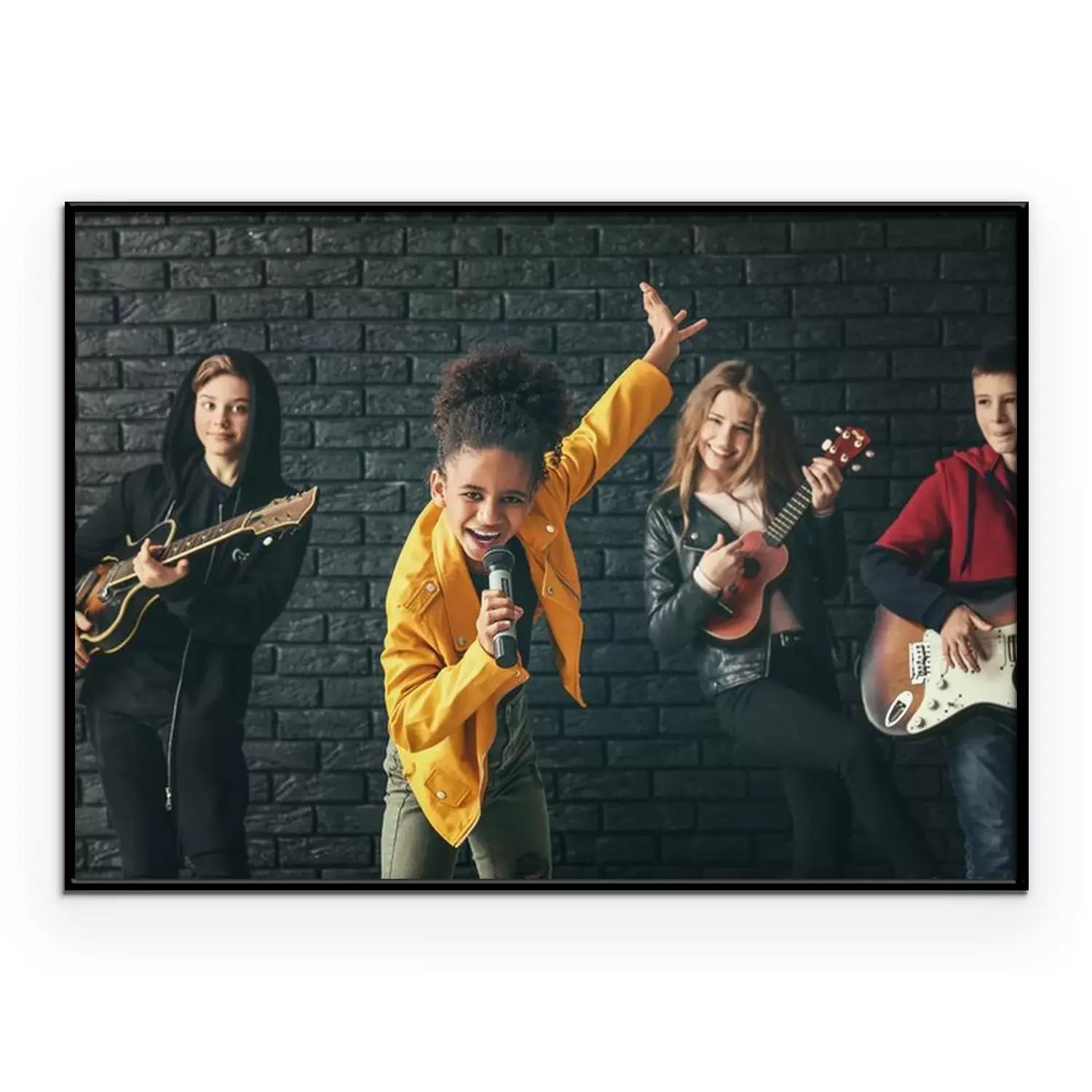 Poster Band of teenage musicians playing against dark wall