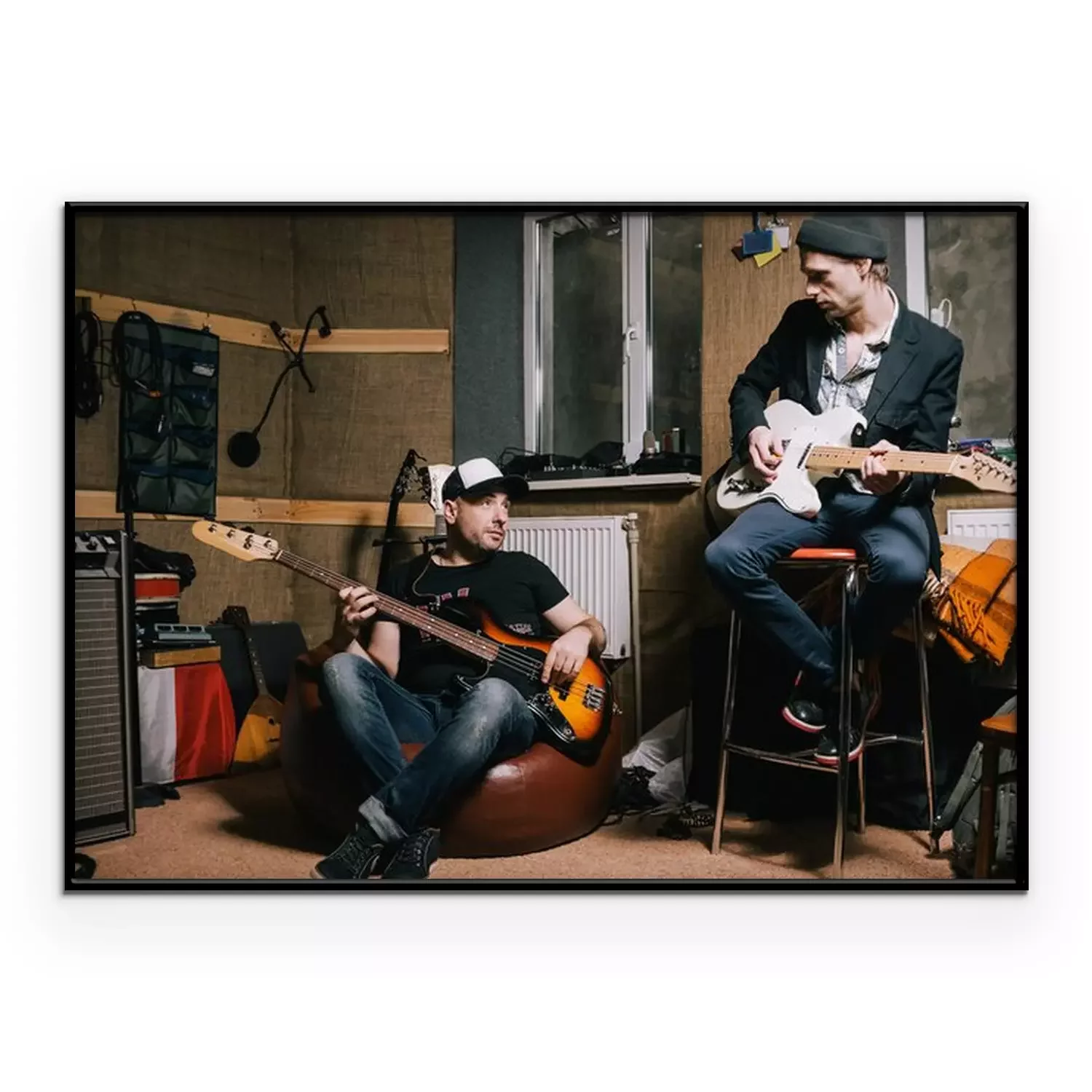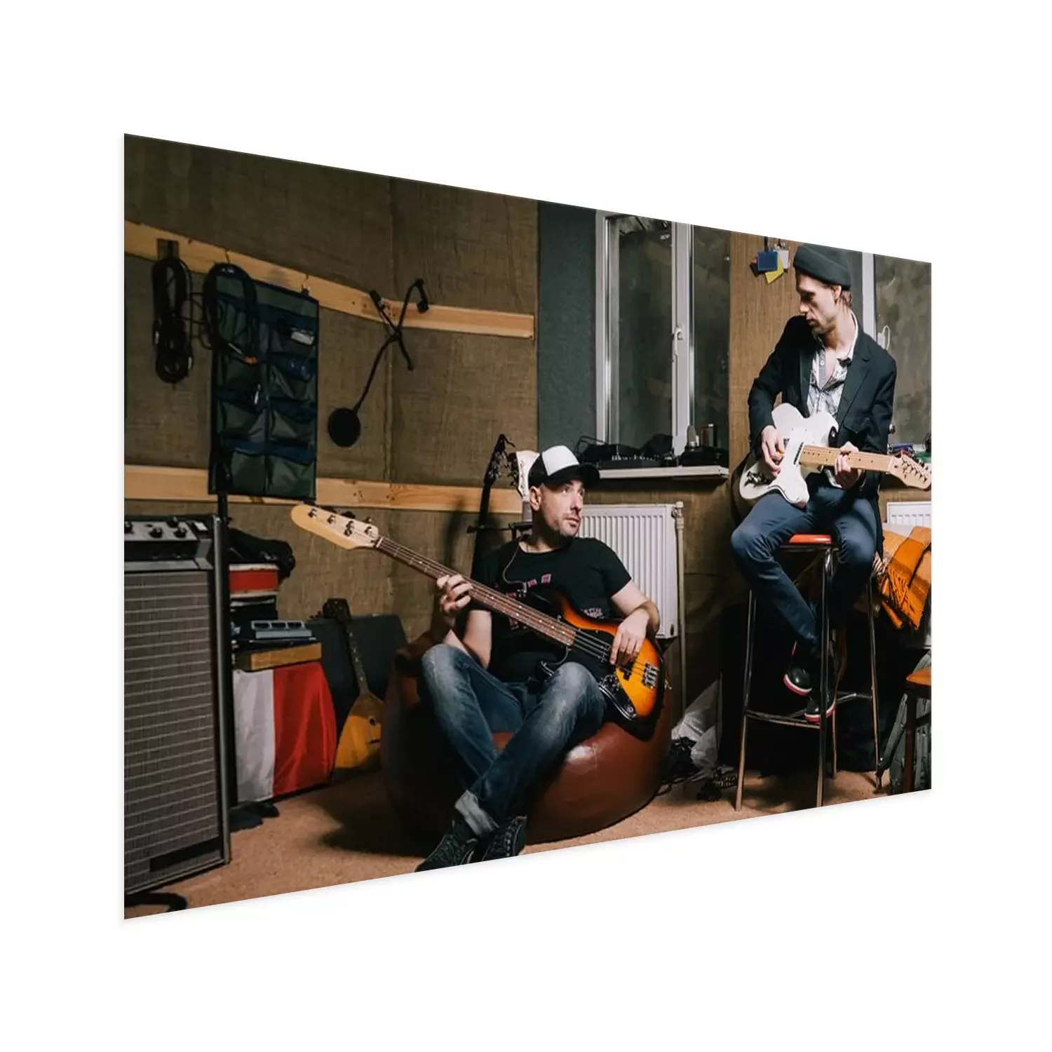 Poster Band van volwassen gitaristen die in de garage repeteren. Opgroeide musici, creatieve hobby voor hipsters, muziekherhaling