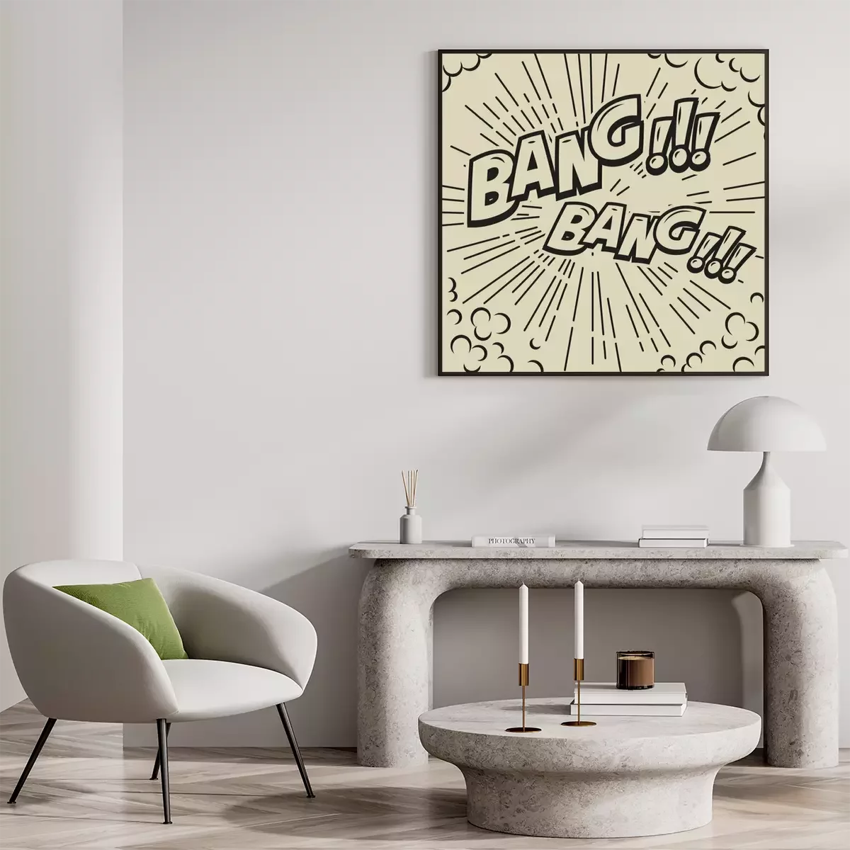 Poster: Bang. Grappige stijluitdrukking op achtergrond met snelheidslijnen. Ontwerpelement voor poster, kaart, flyer, banner.