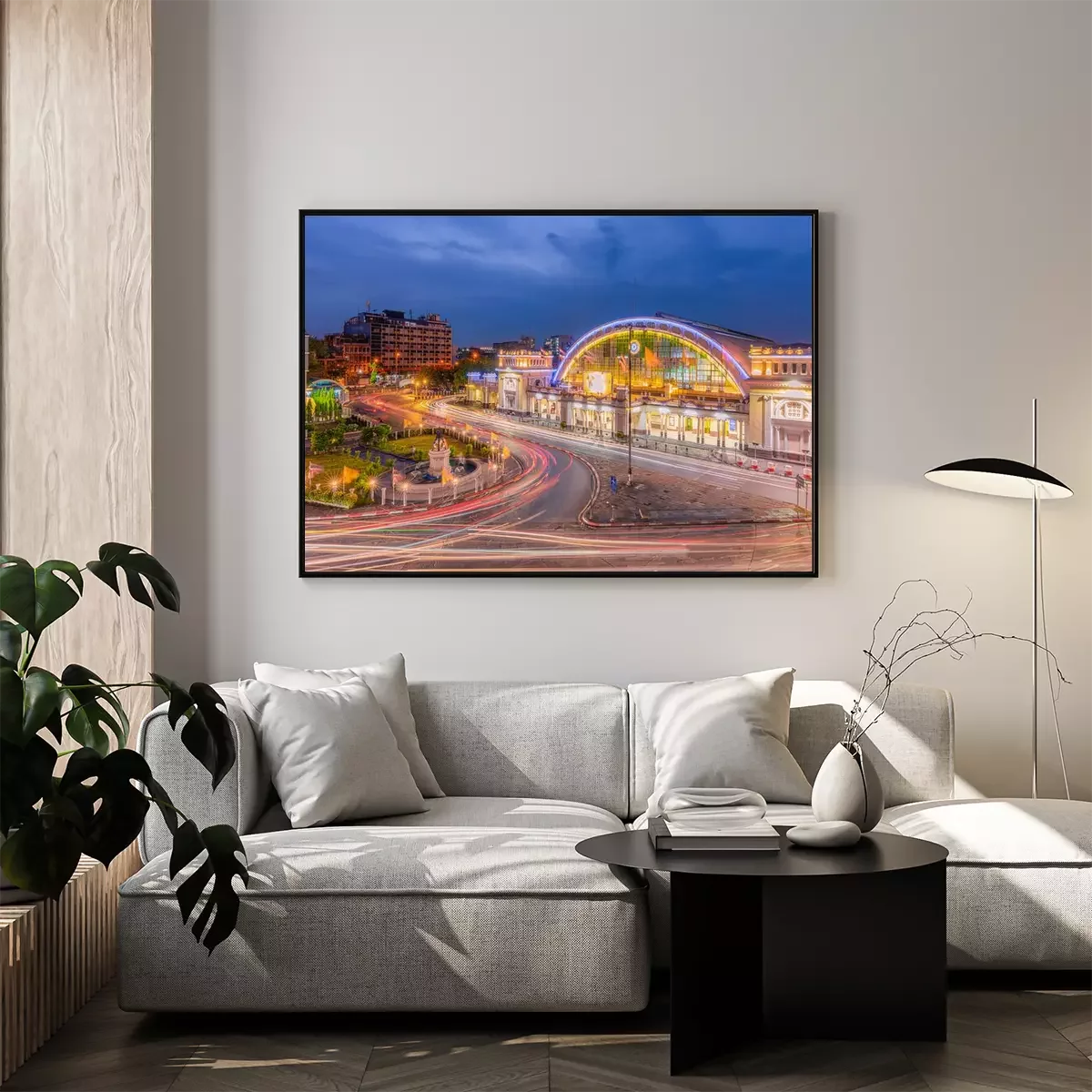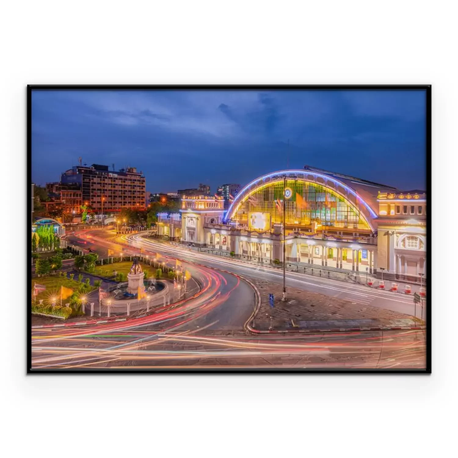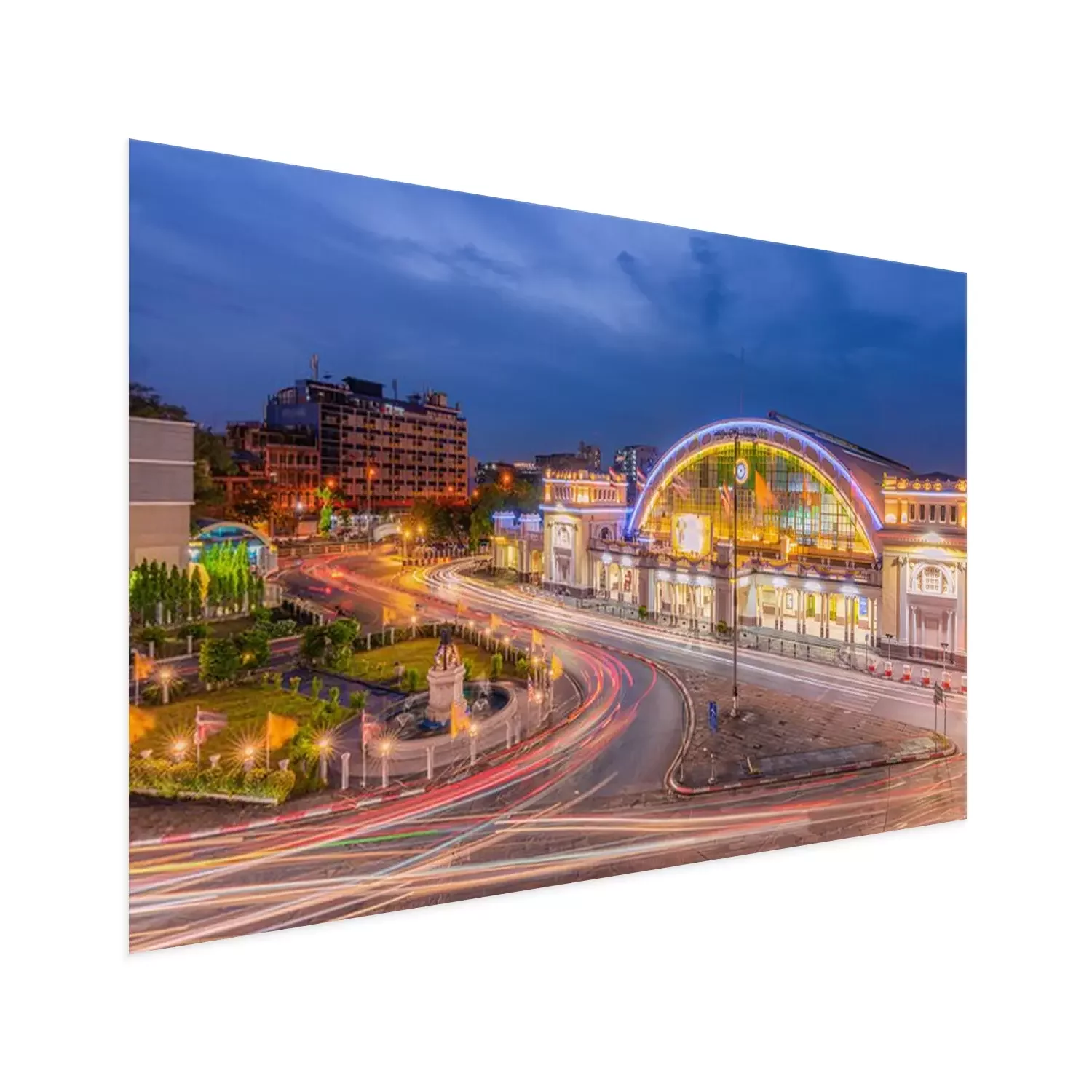 Poster: Bangkok Railway Station (Hua Lamphong Railway Station,MRT) and traffic at night in Bangkok, Thailand.