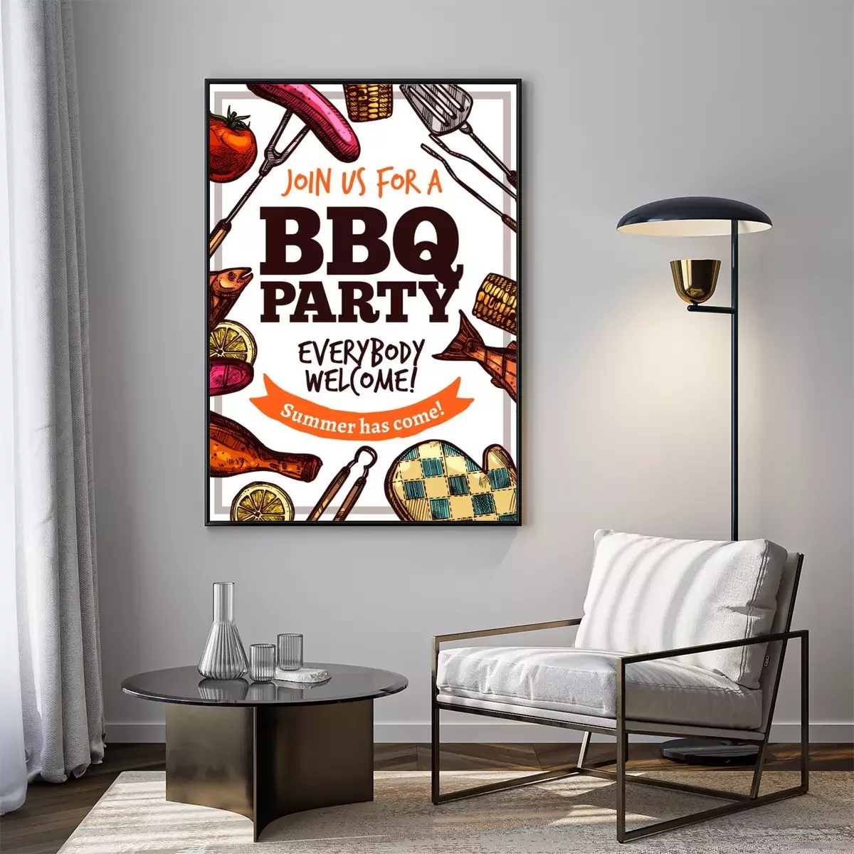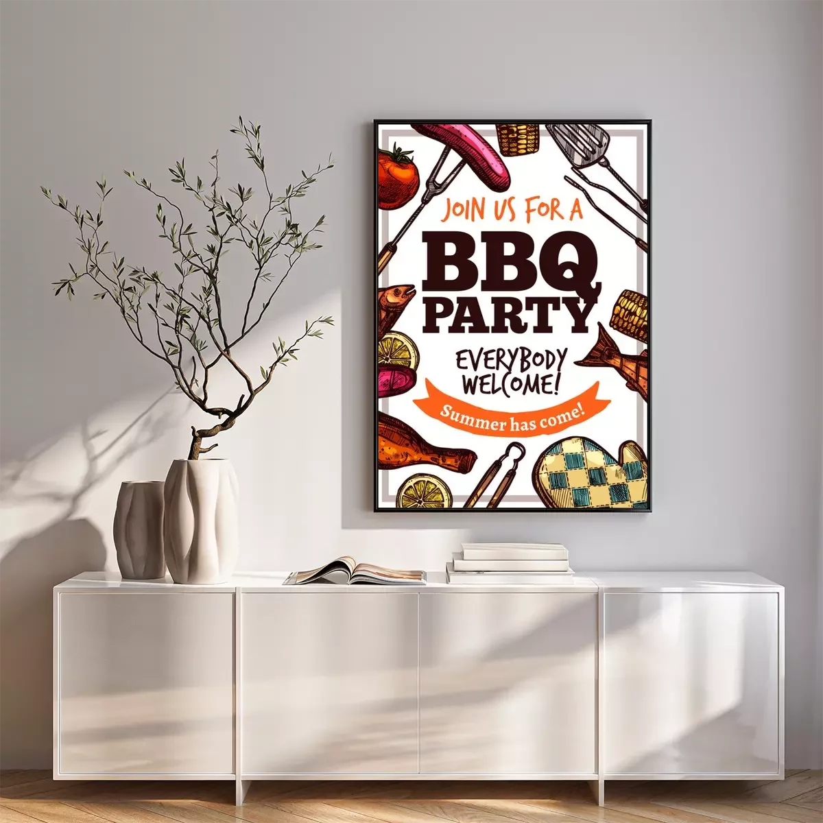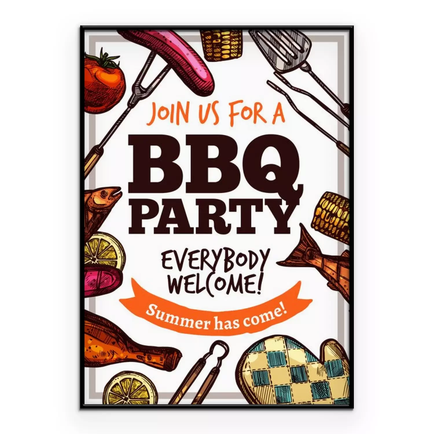 Poster: Barbecue vector hand drawn party poster with grill food. Sketch bbq design with typography
