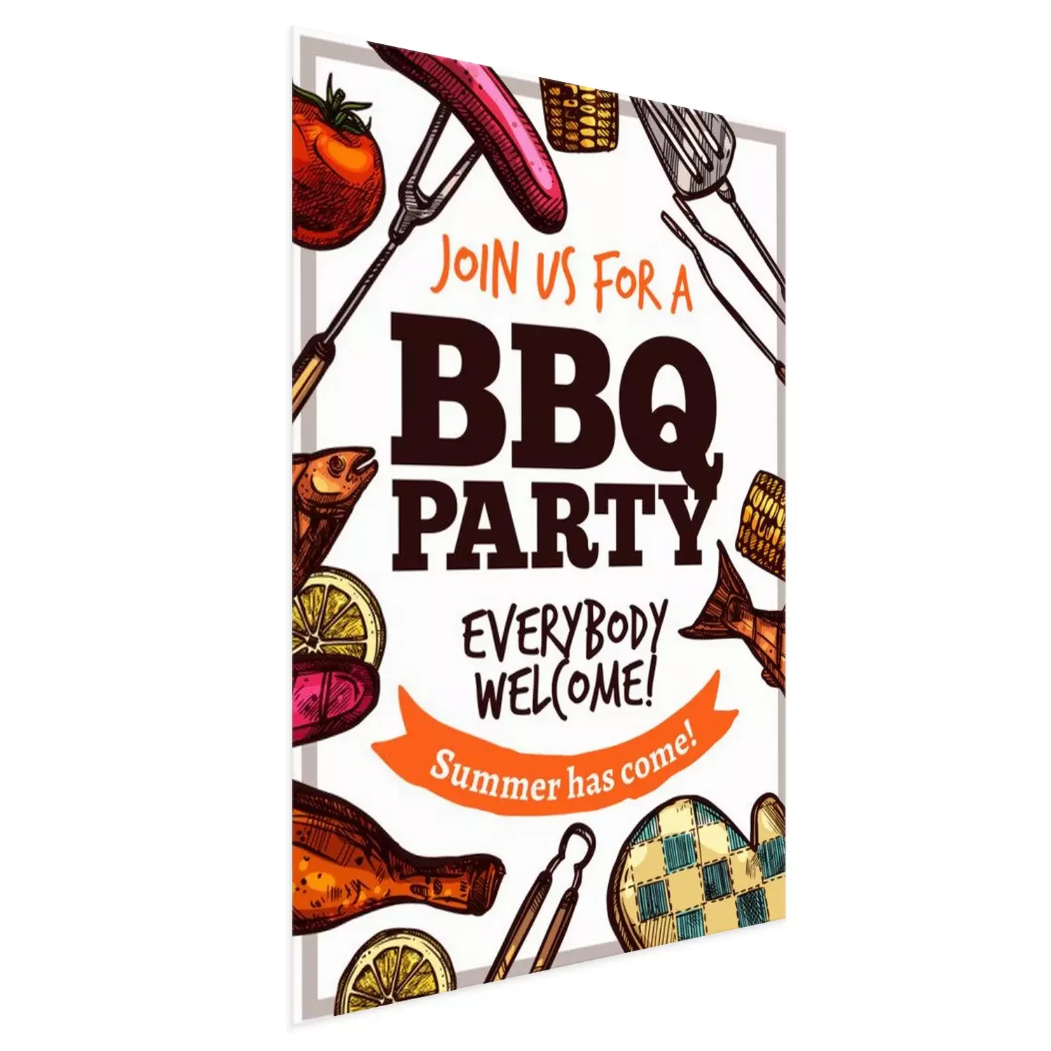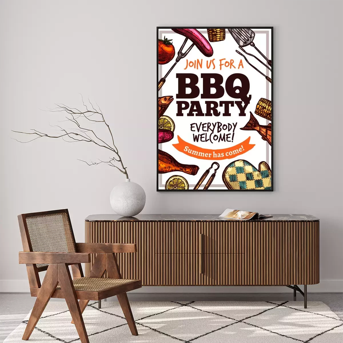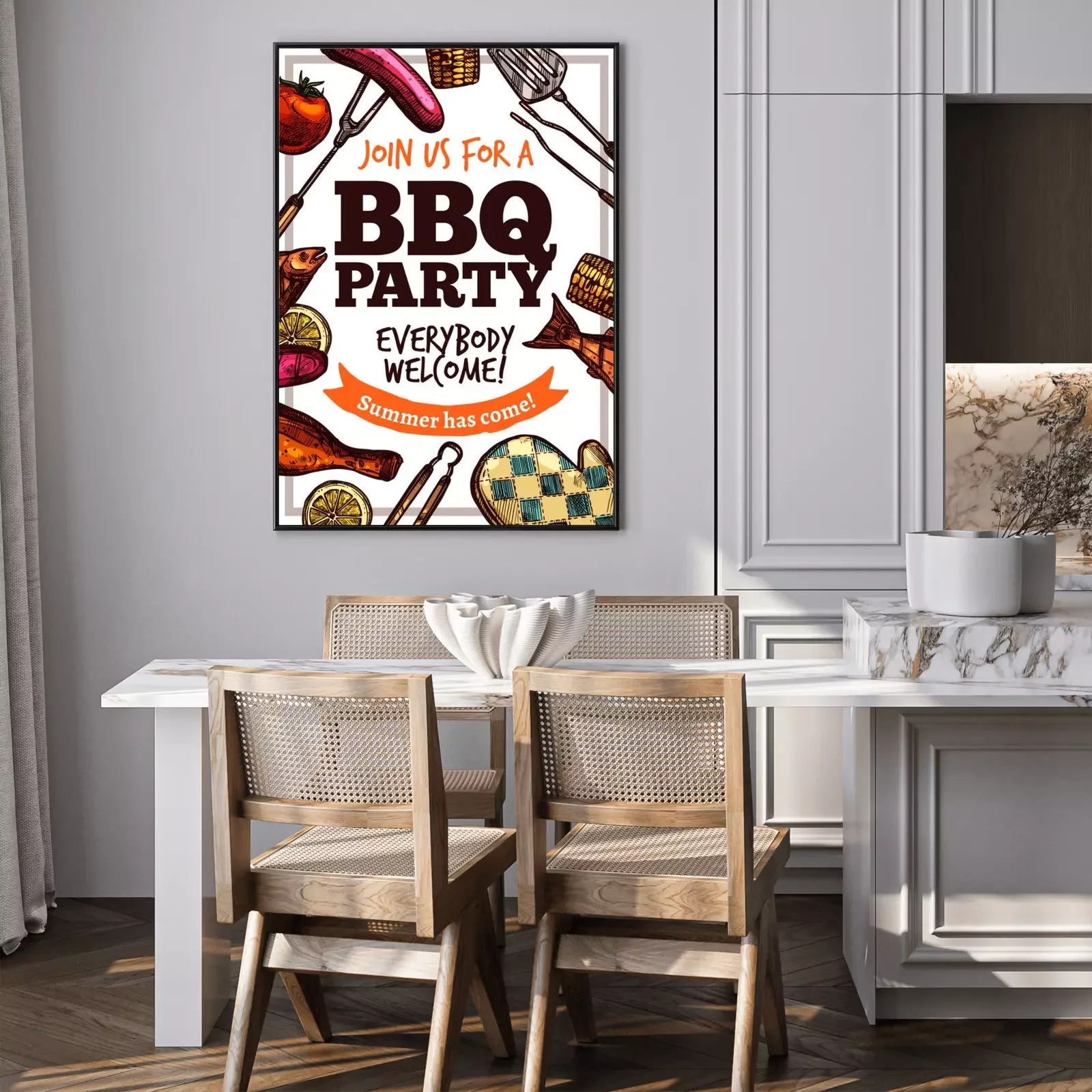 Poster: Barbecue vector hand drawn party poster with grill food. Sketch bbq design with typography