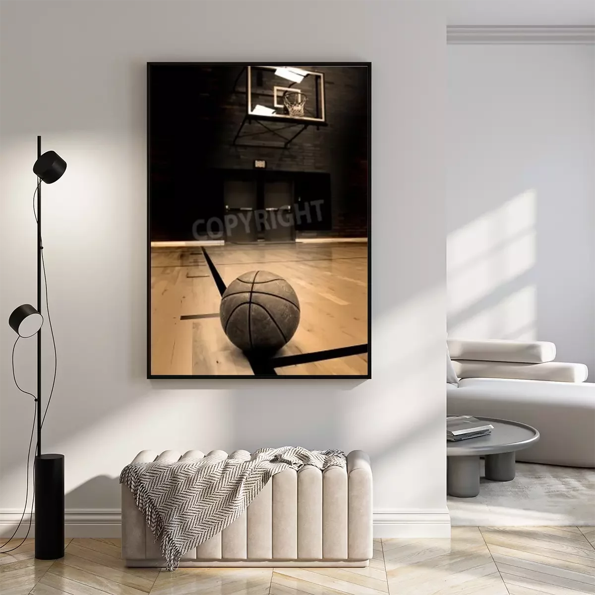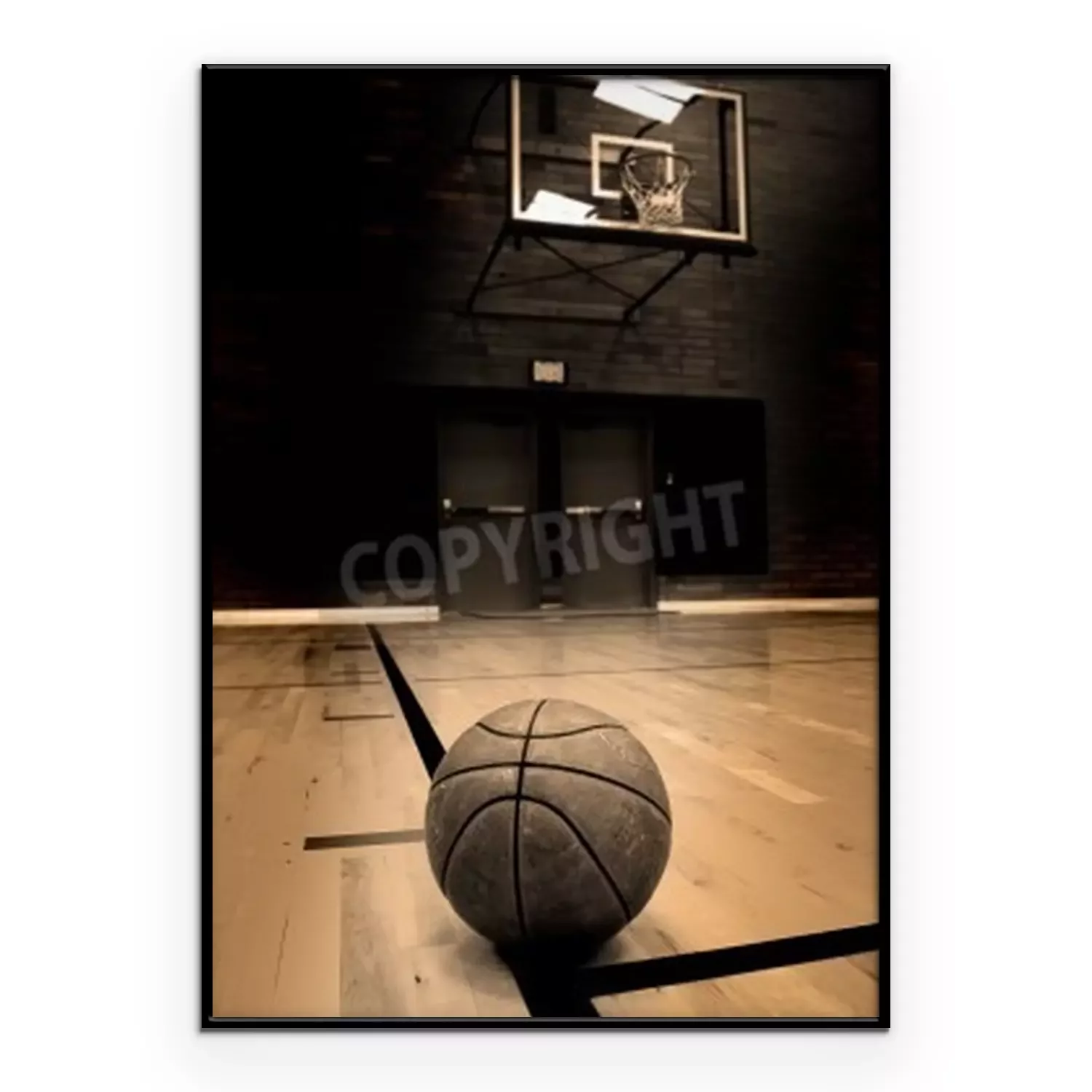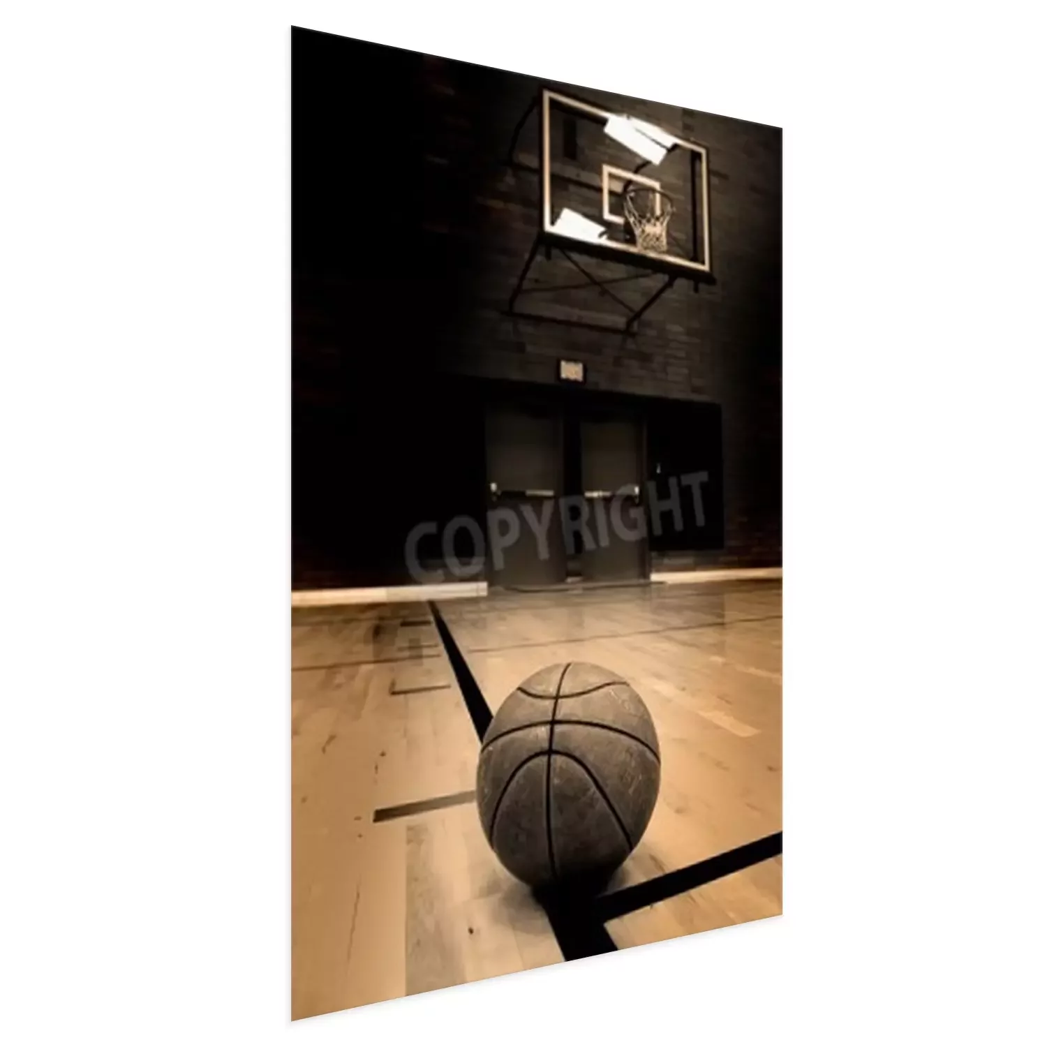 Poster: Basketbal op hof met hoepel op de achtergrond