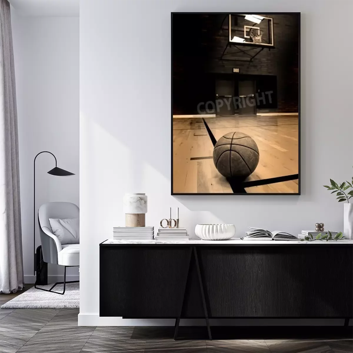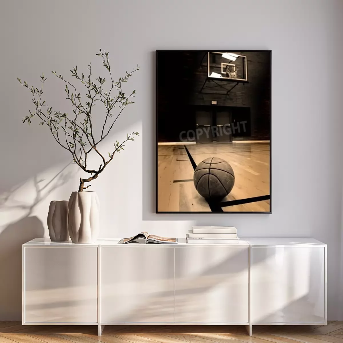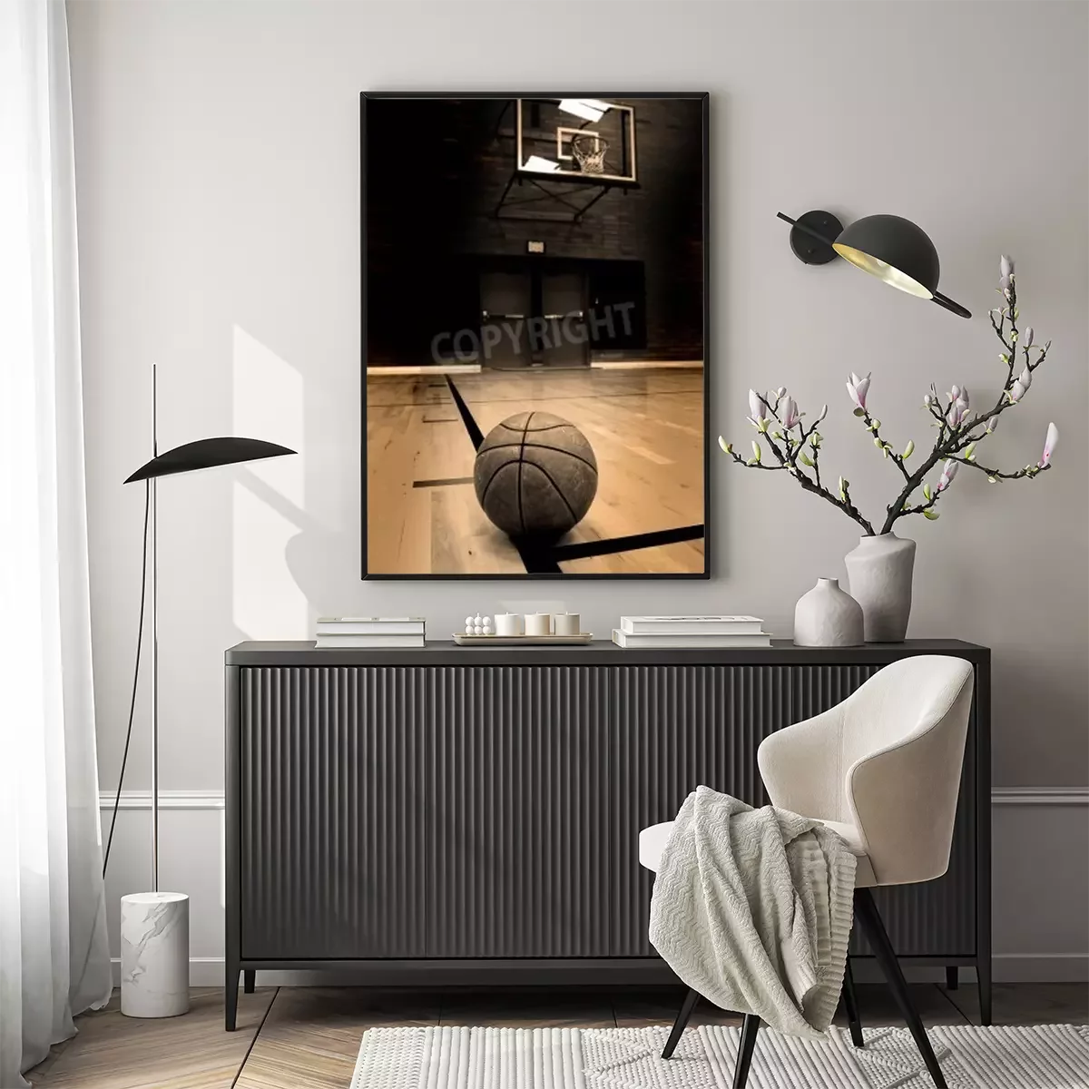 Poster: Basketbal op hof met hoepel op de achtergrond