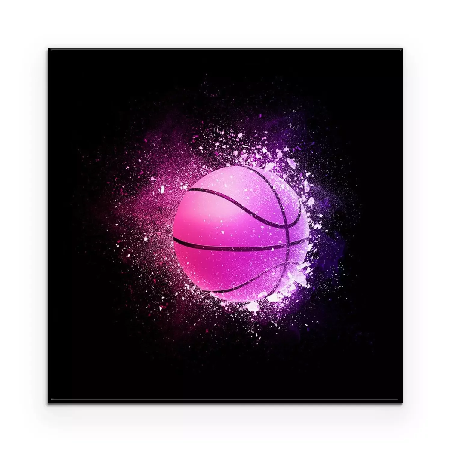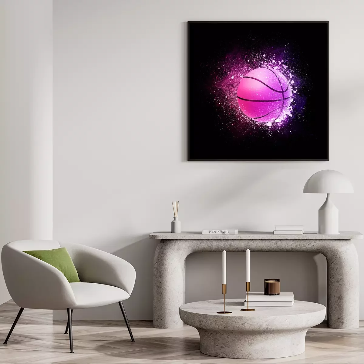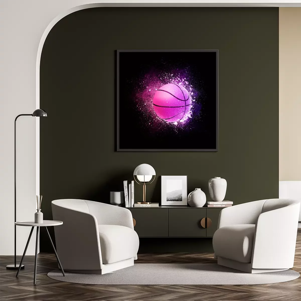 Poster: Basketball Ball flying in violet particles isolated on black background. Sport competition concept for basketball tournament poster, placard, card or banner.
