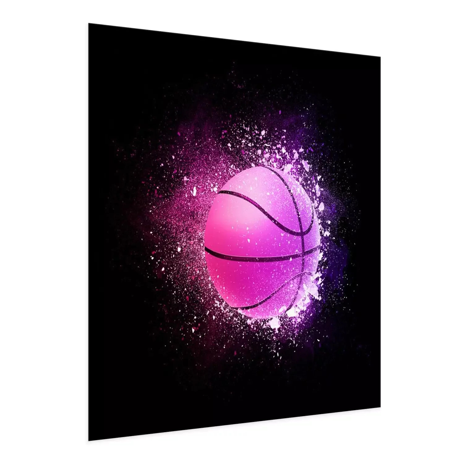 Poster Basketball Ball flying in violet particles isolated on black background. Sport competition concept for basketball tournament poster, placard, card or banner.