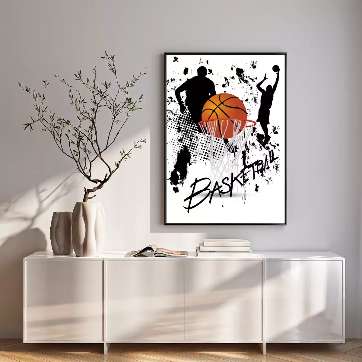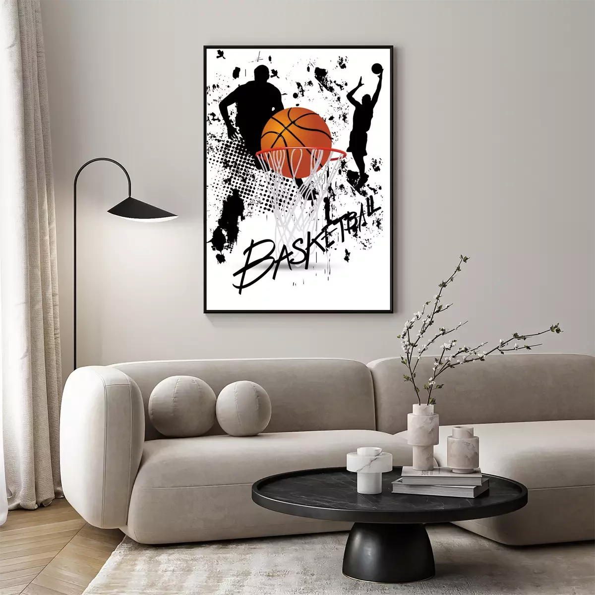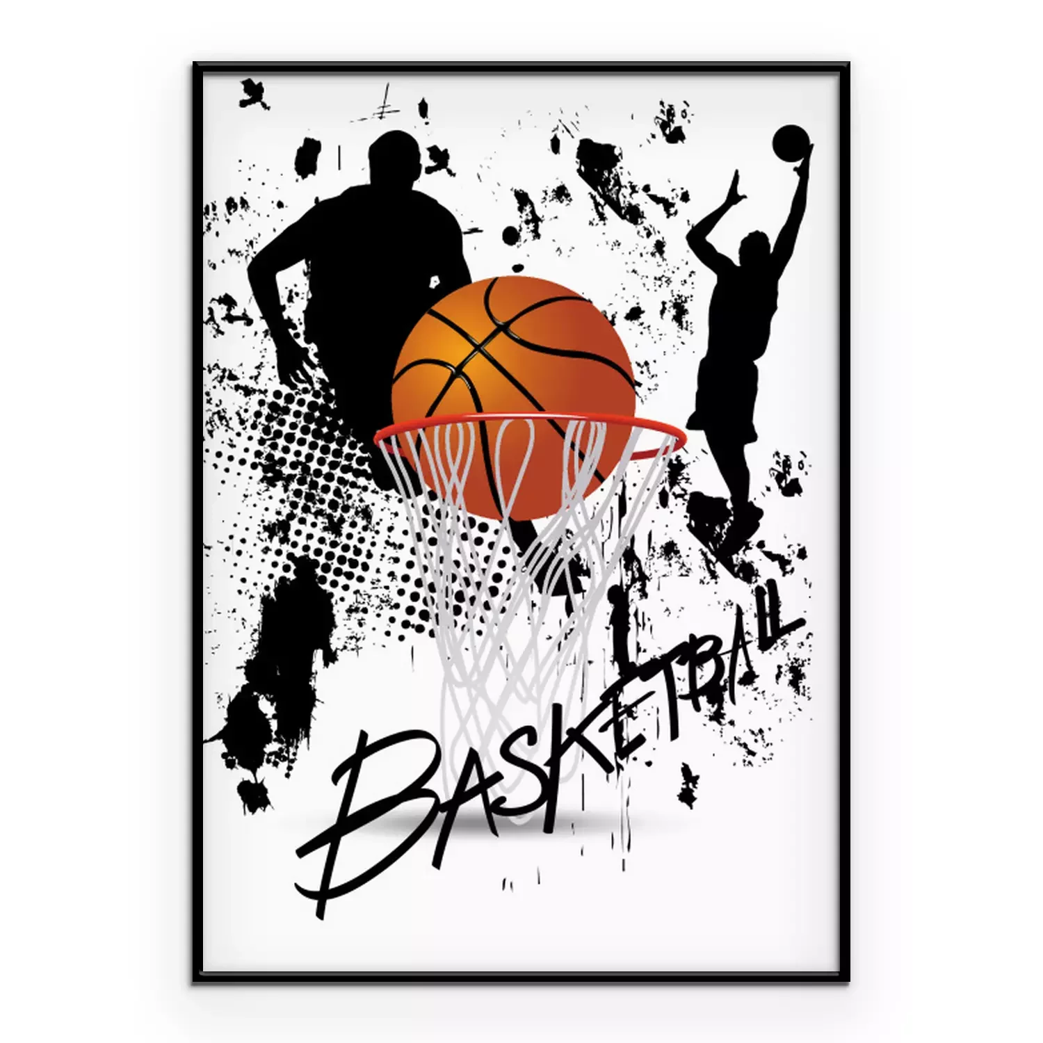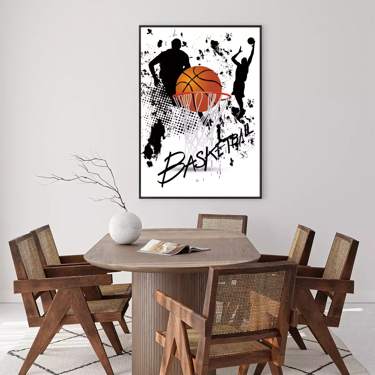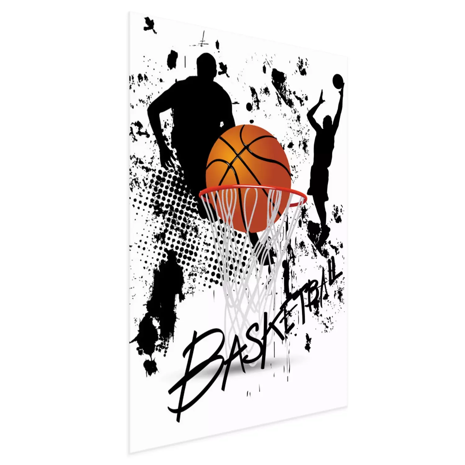 Het opschrift Basketbal en de schaduwen van basketbalspelers in actie
