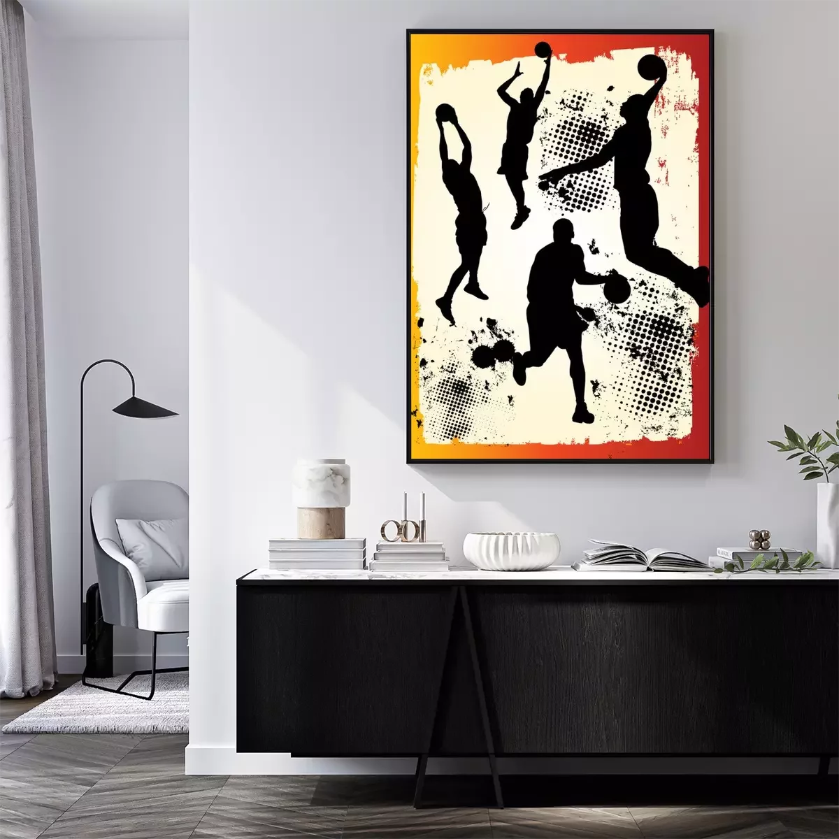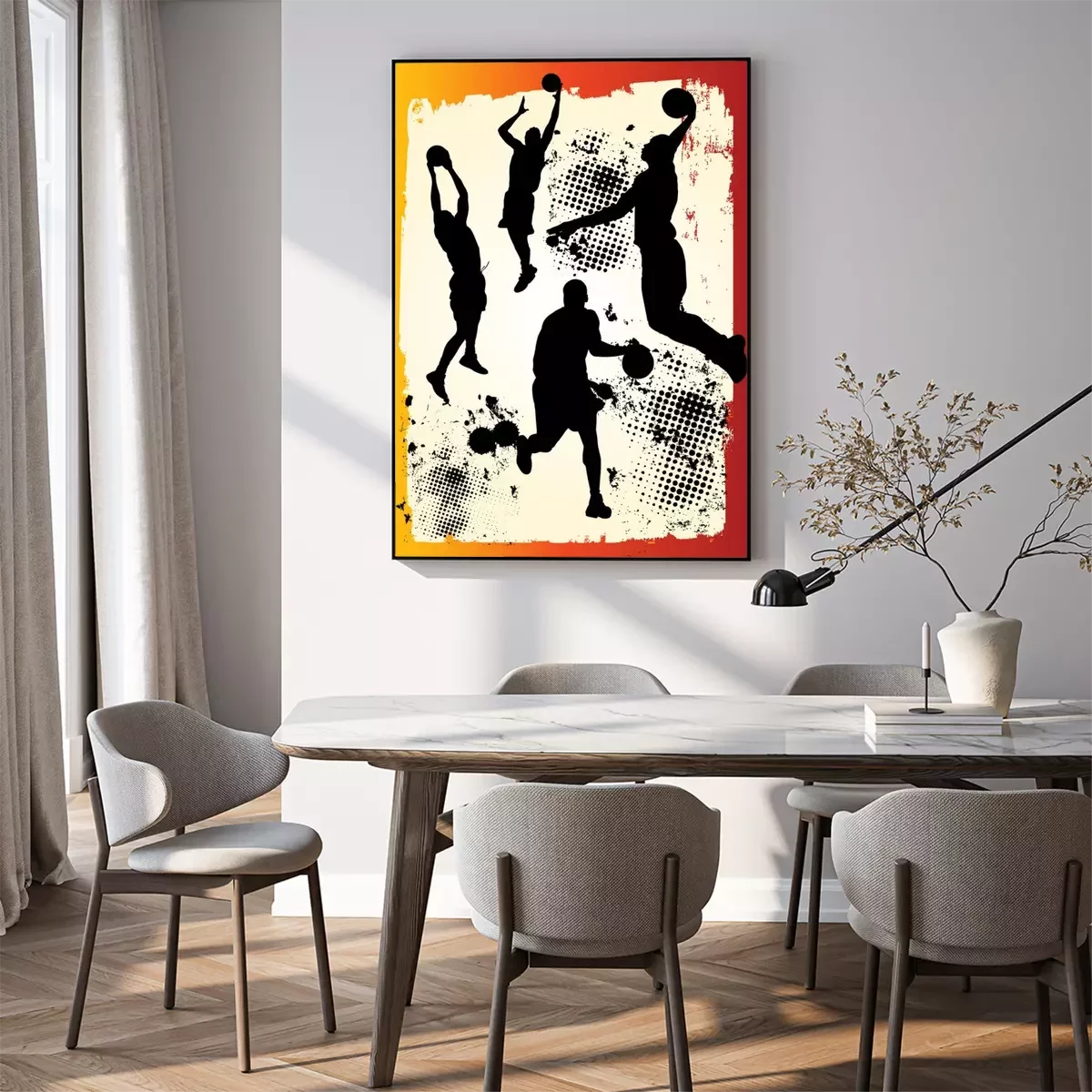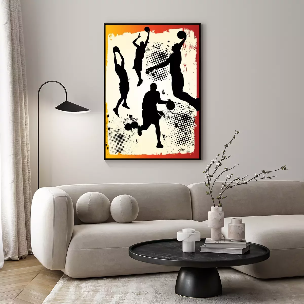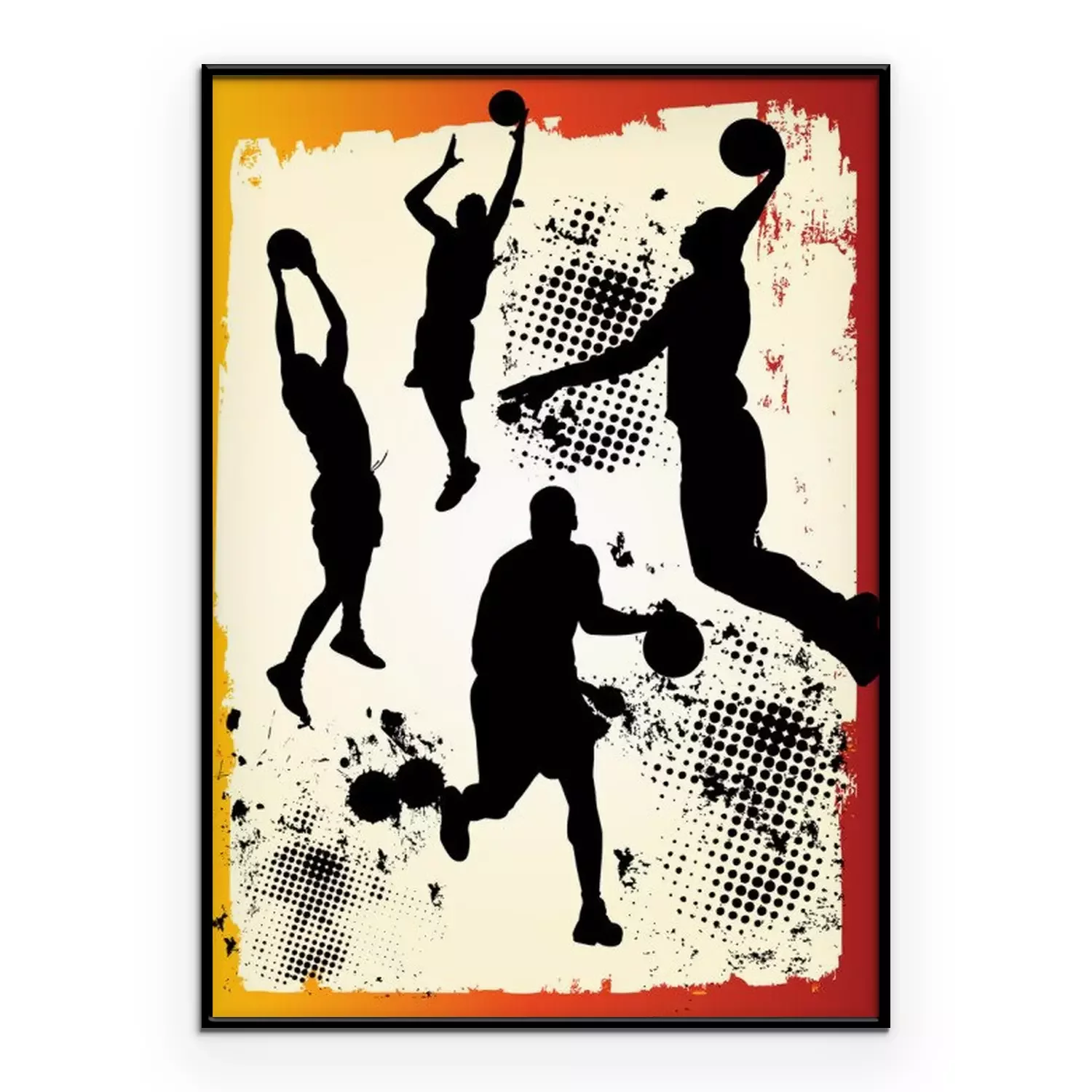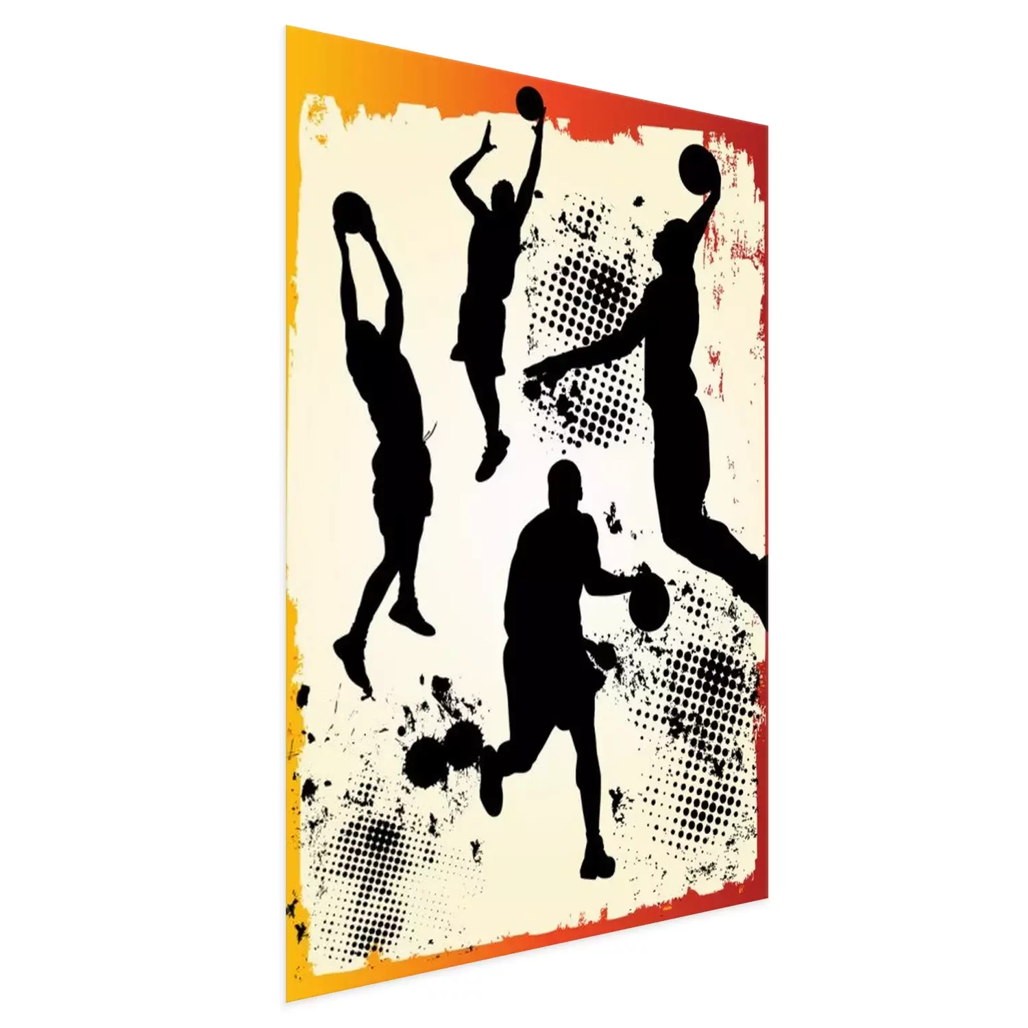 Poster: basketbalspeler team in vele houdingen op grunge grafische