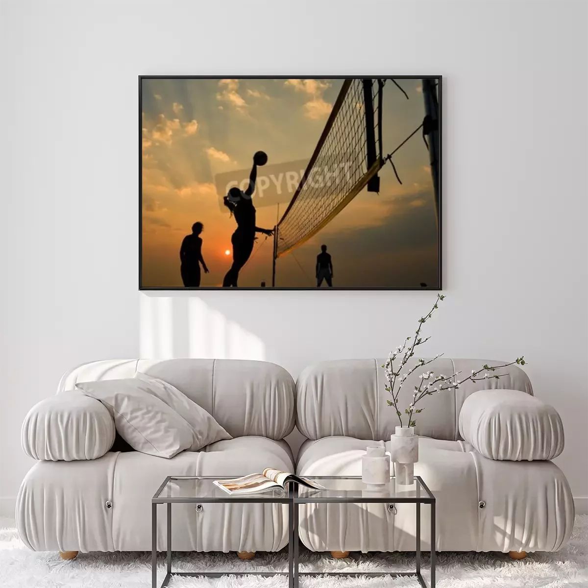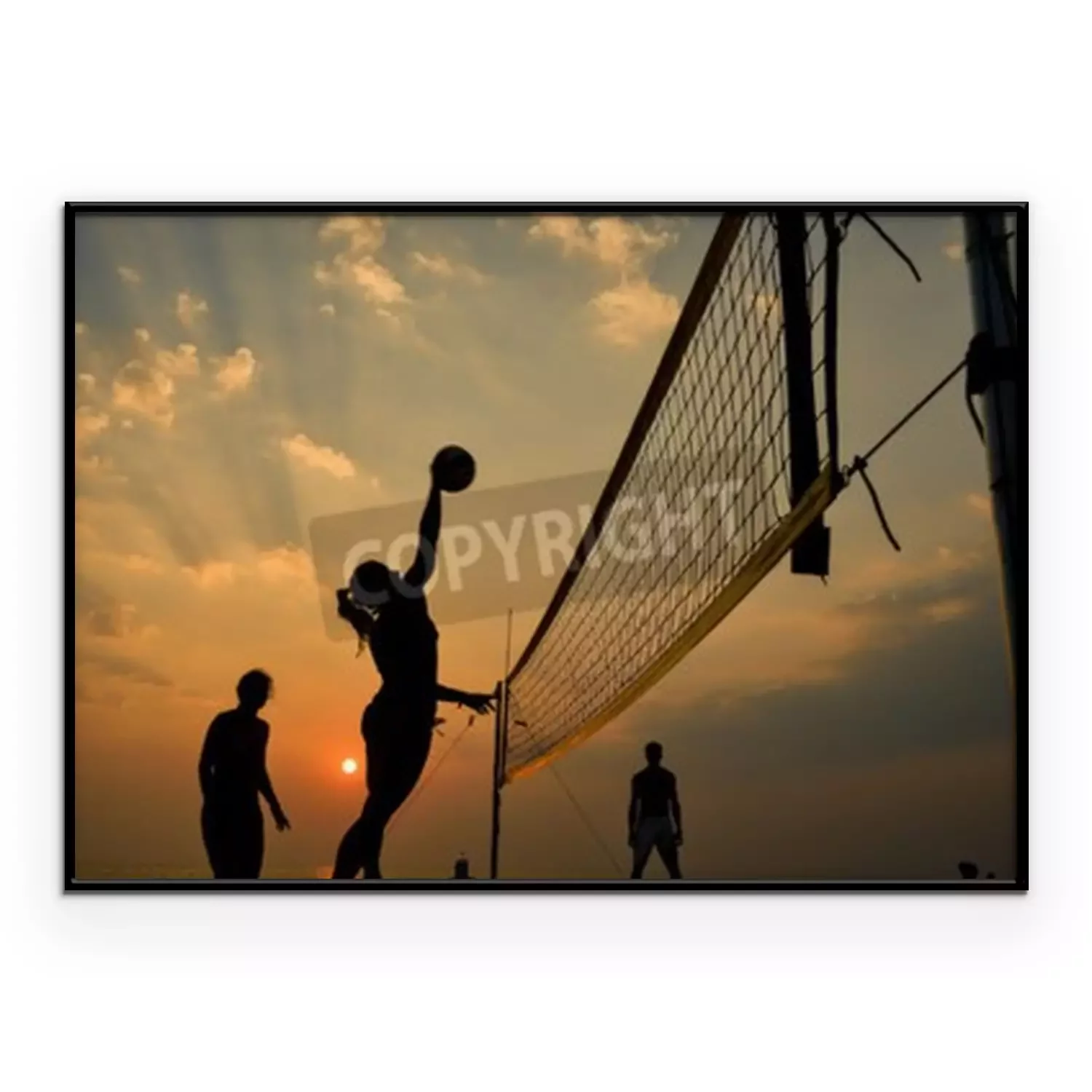 Poster: Beachvolleybal silhouet bij zonsondergang, beweging vervagen