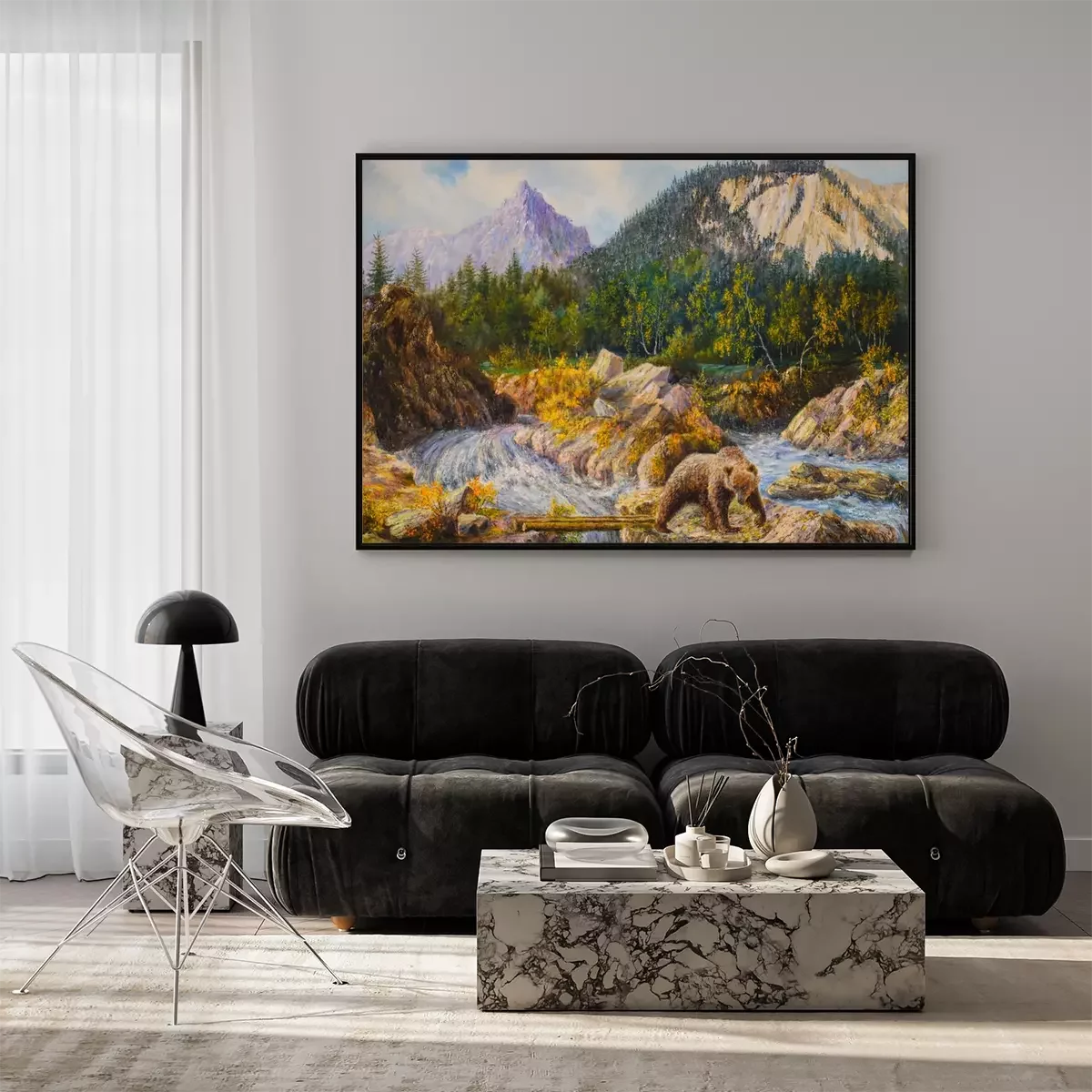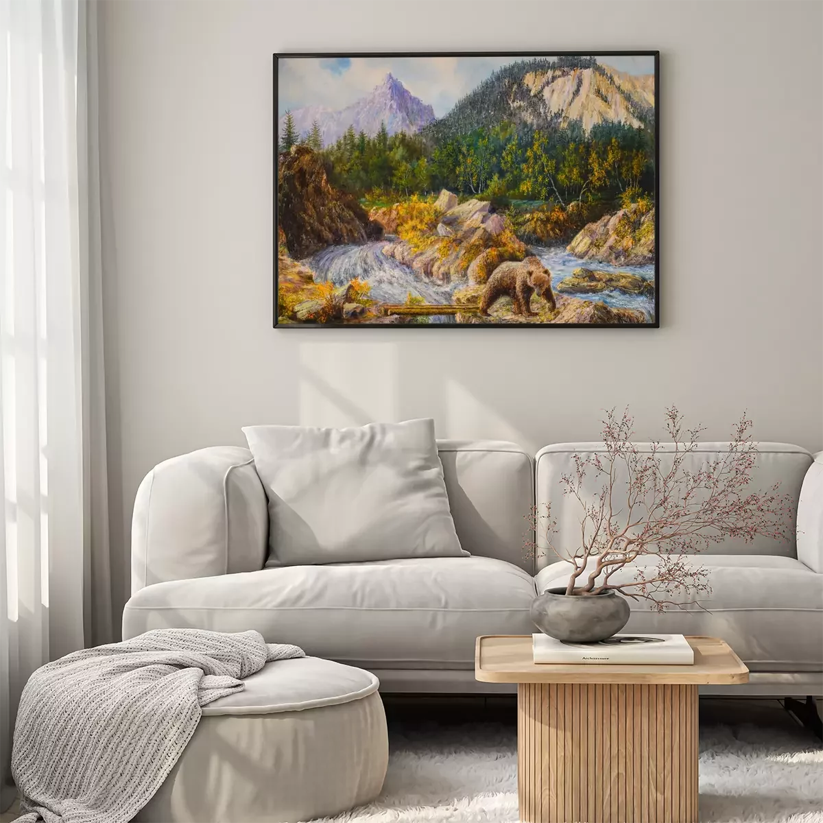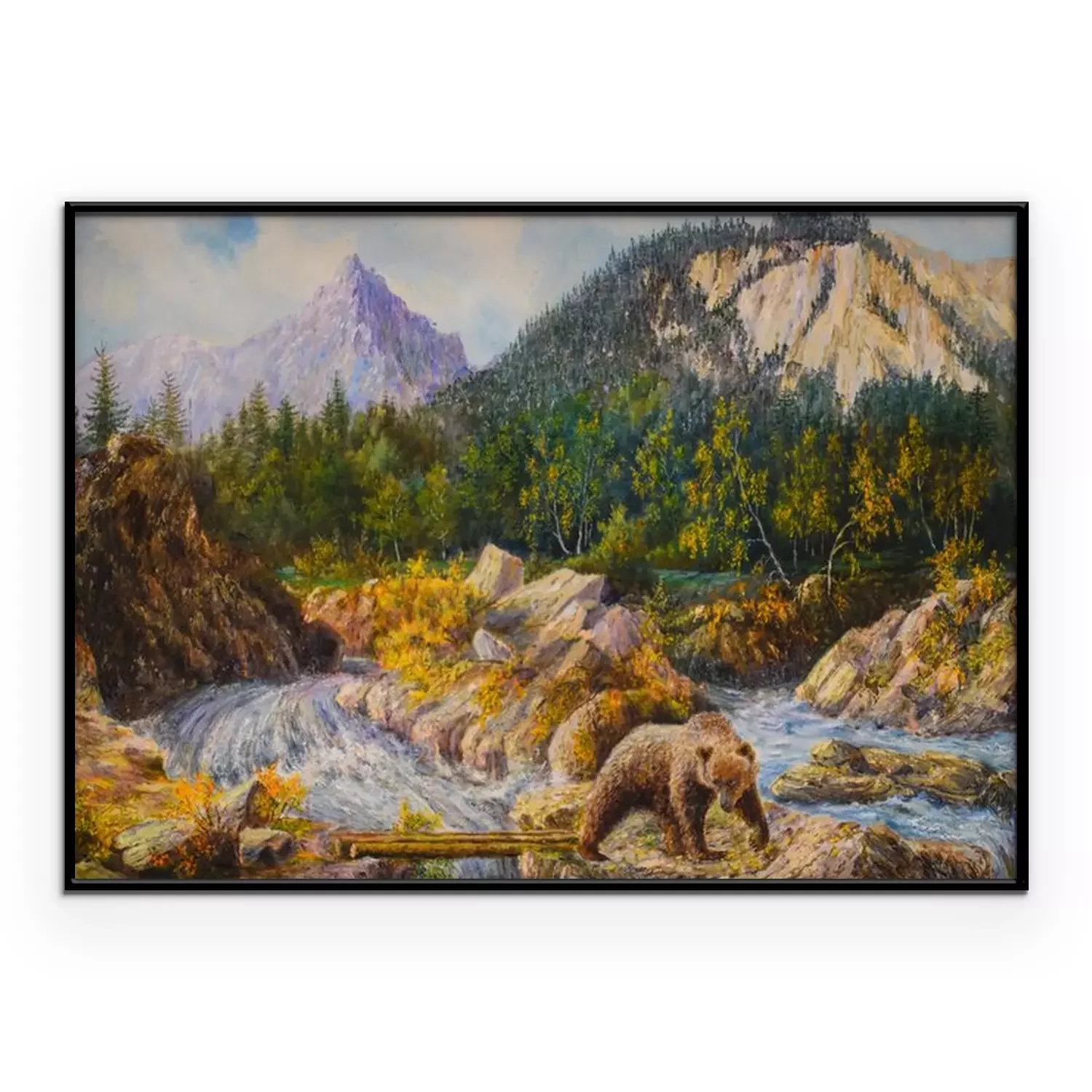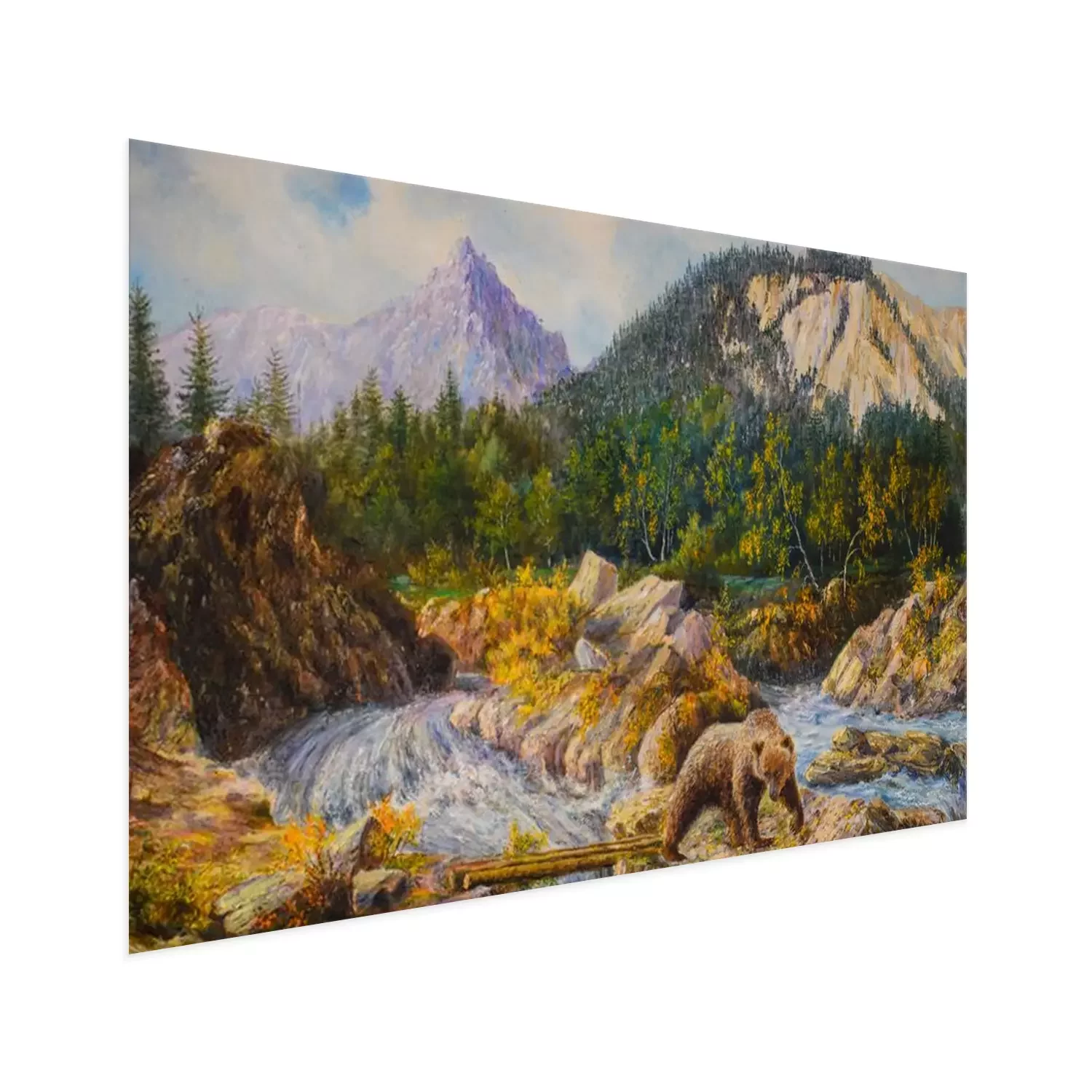 Poster: bear on the rapids of a river is fishing. oil painting on canvas.