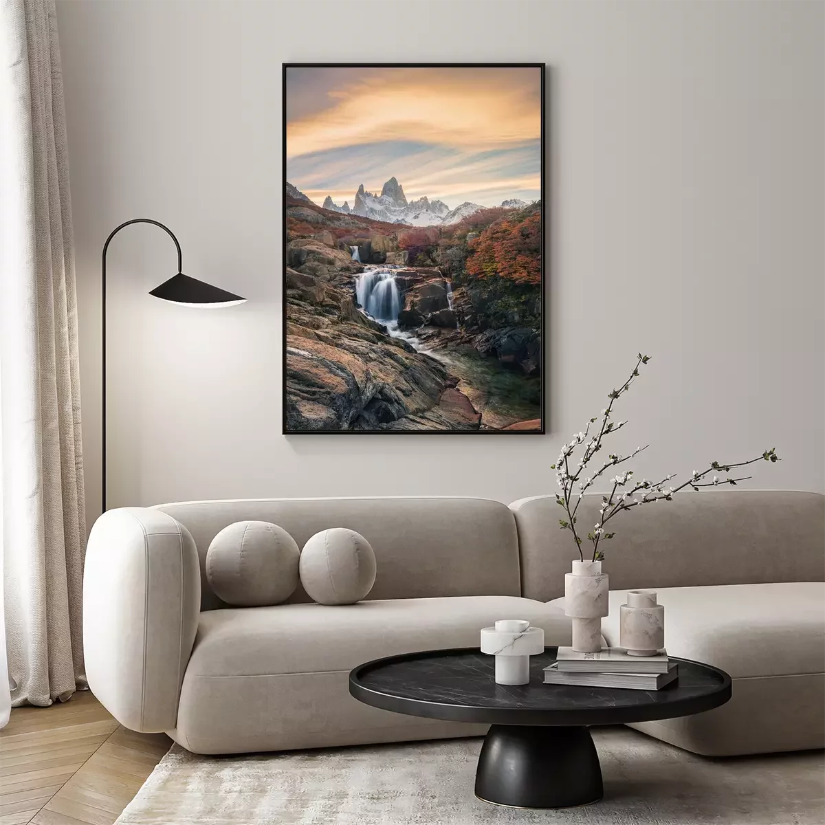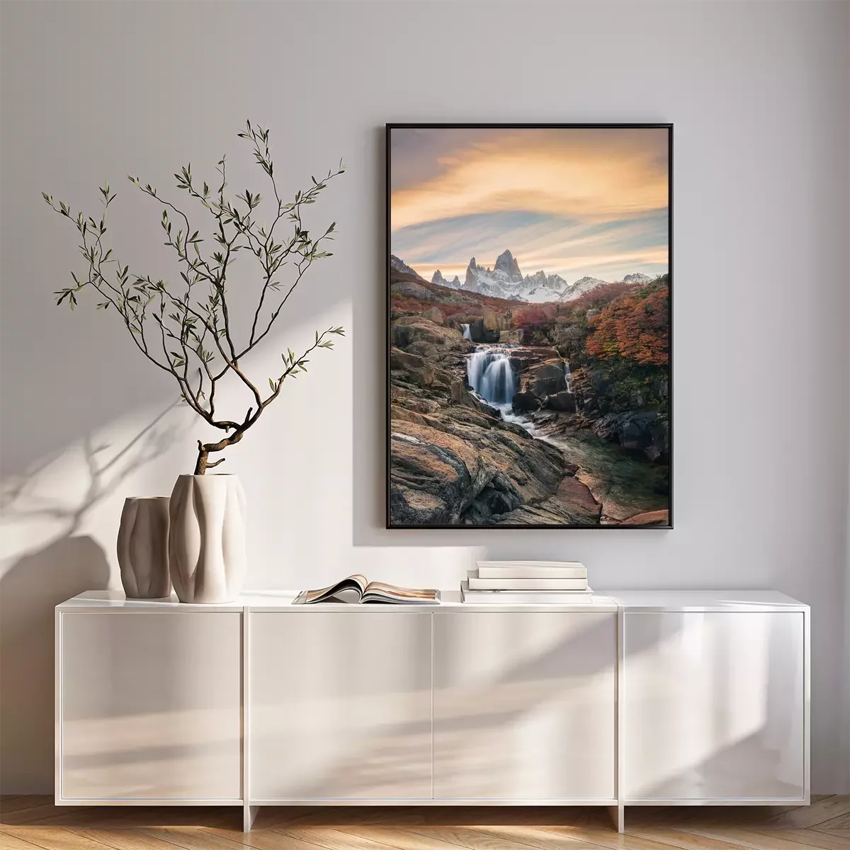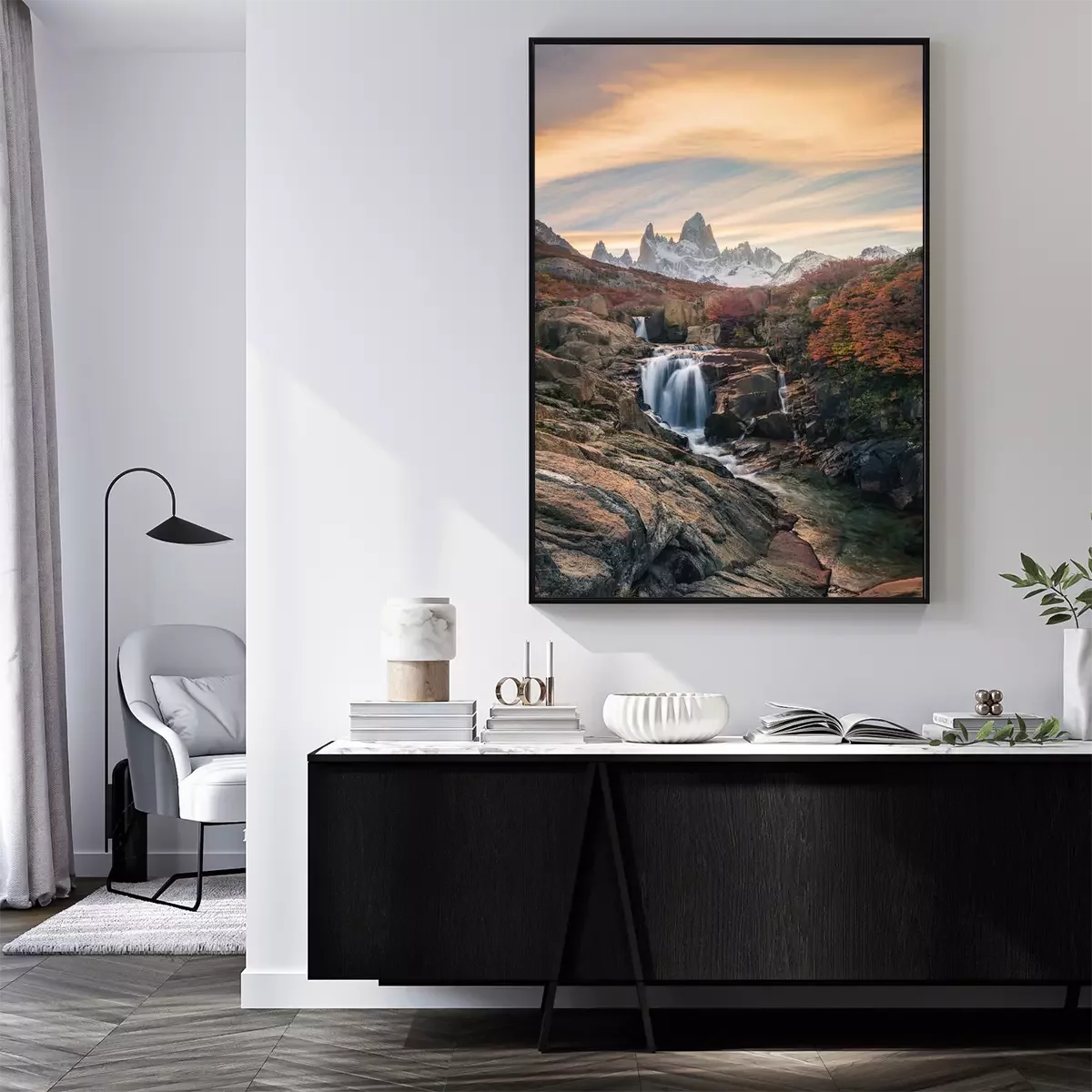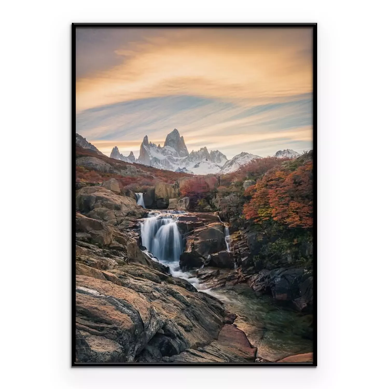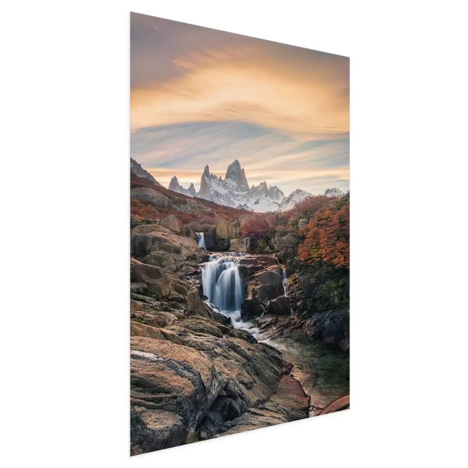 Poster: Beautiful mountains and waterfalls, stunning sceneries, popular tourist attractions. The location is in the Glacier National Park, Argentina.
