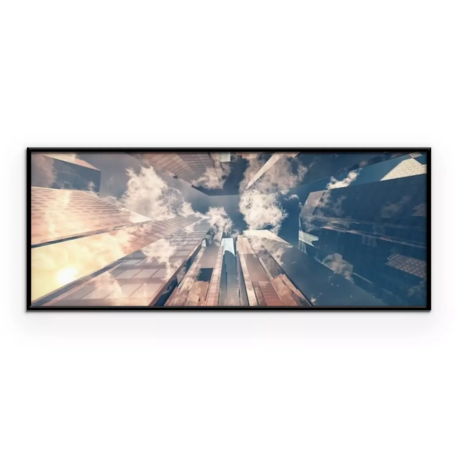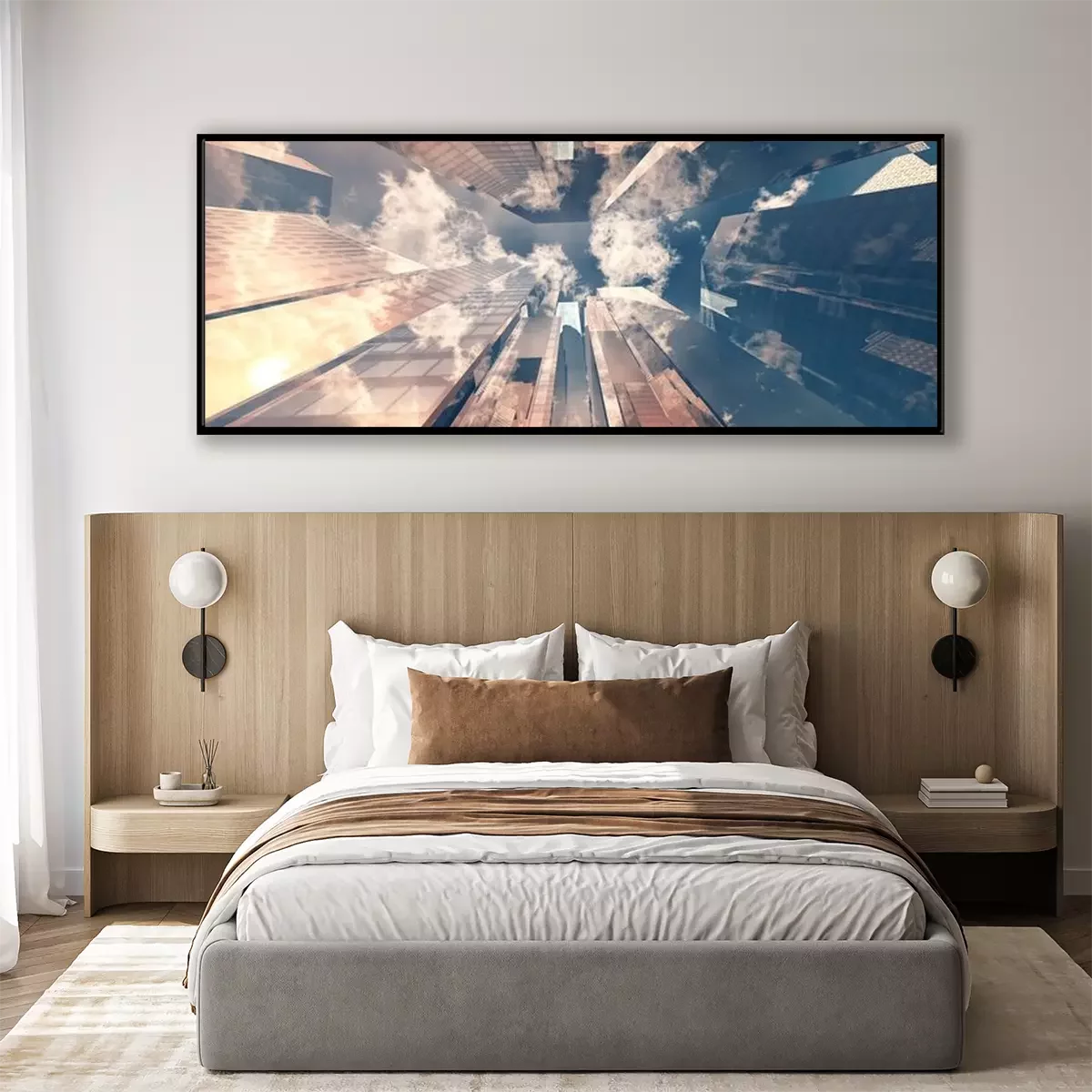 Poster: Beautiful skyscrapers against the sky, modern high-rise buildings bottom view, 3D rendering