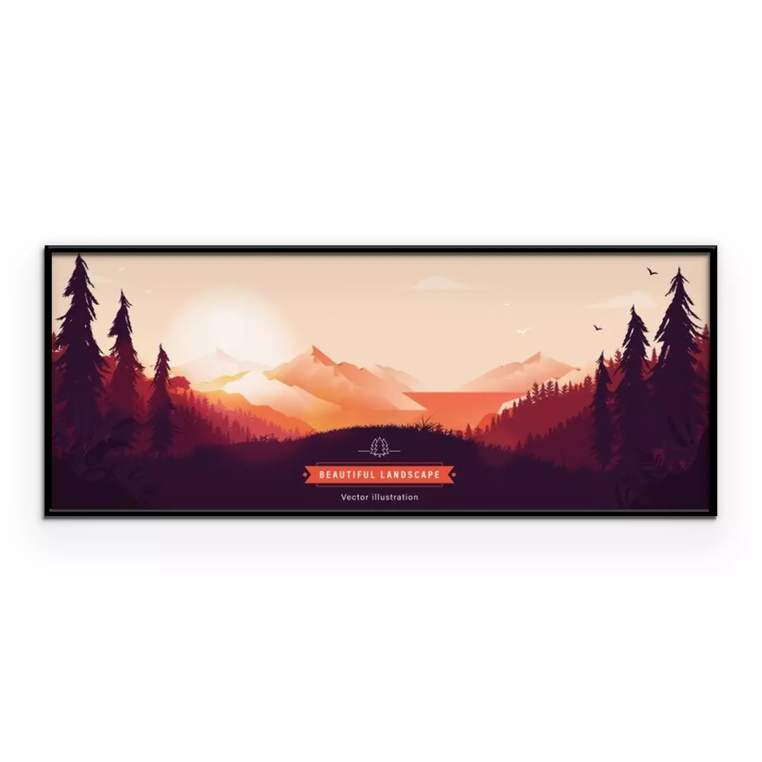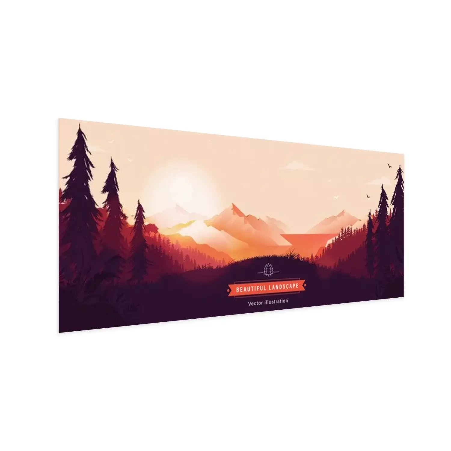 Poster: Beautiful vector landscape illustration - Peaceful warm sunrise over mountains, ocean and forest. Travel, hiking, outdoors and adventure concept. Use as background or wallpaper.