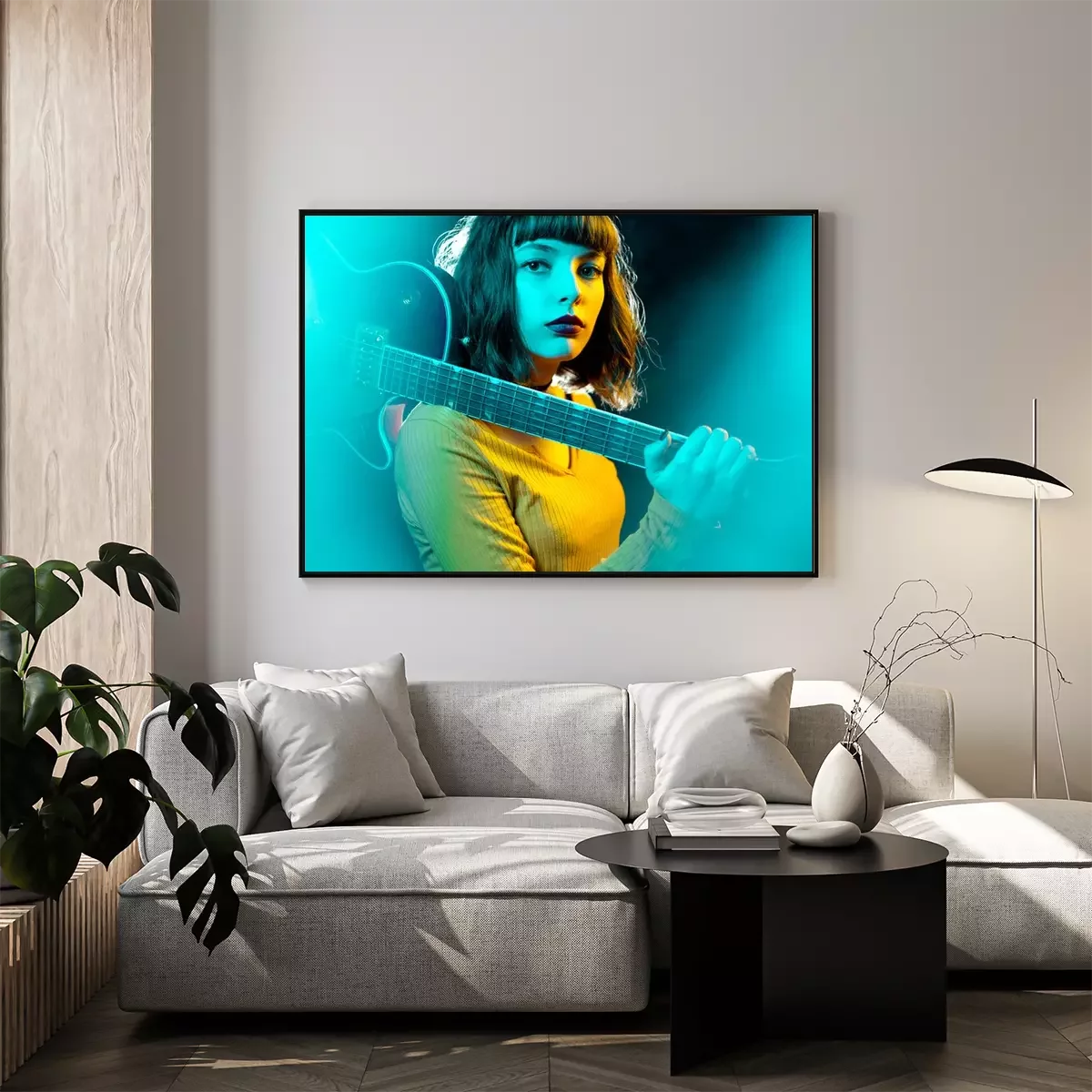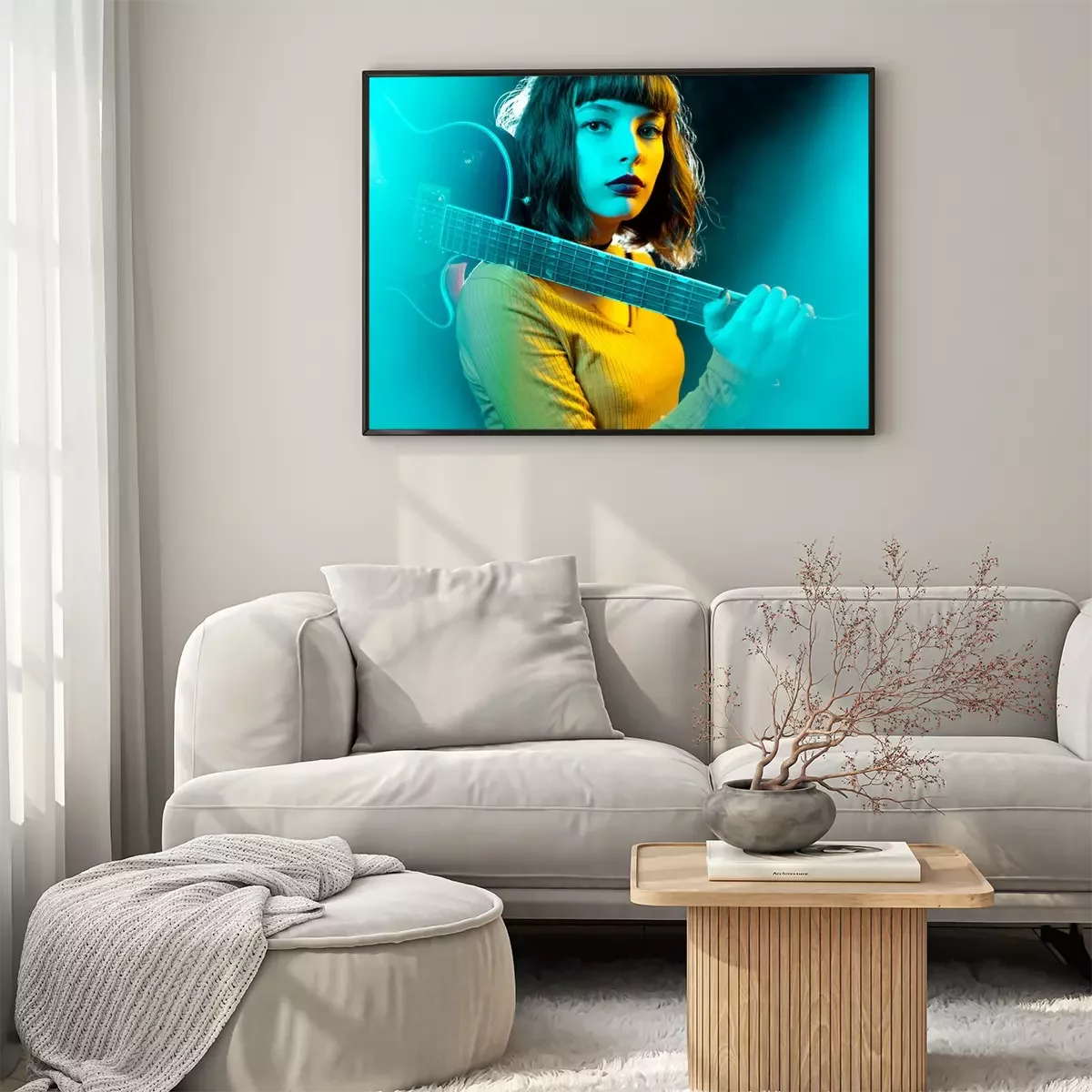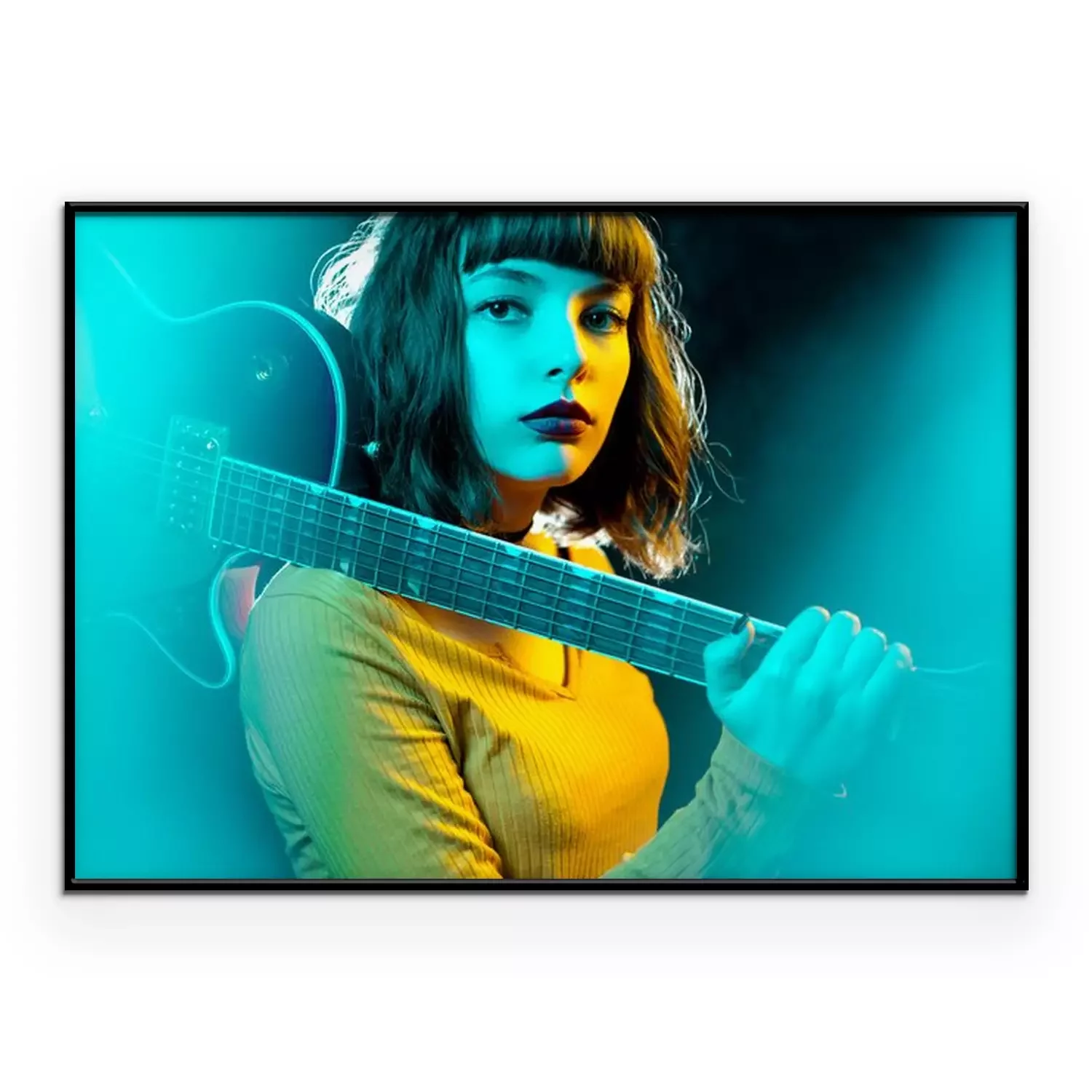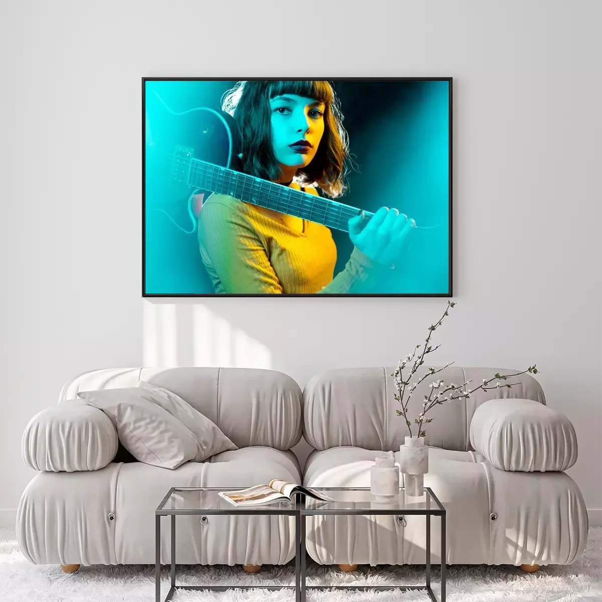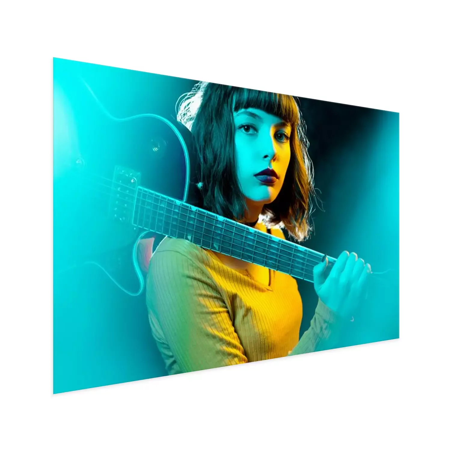 Poster: Beautiful young hipster woman with curly hair with red guitar in neon lights. Rock musician is playing electrical guitar. 90s style concept.