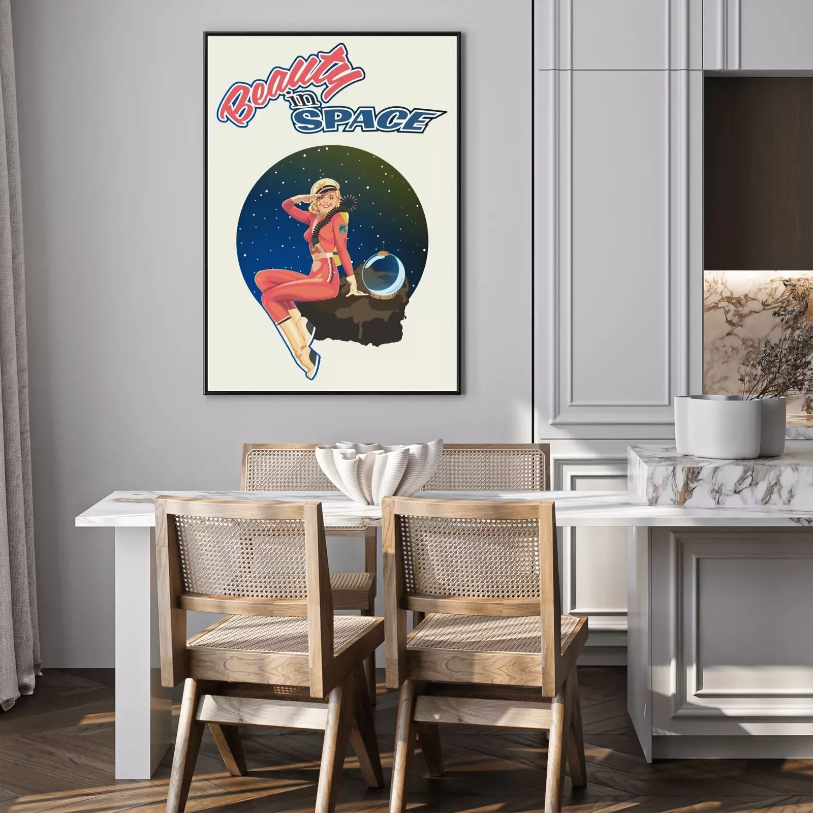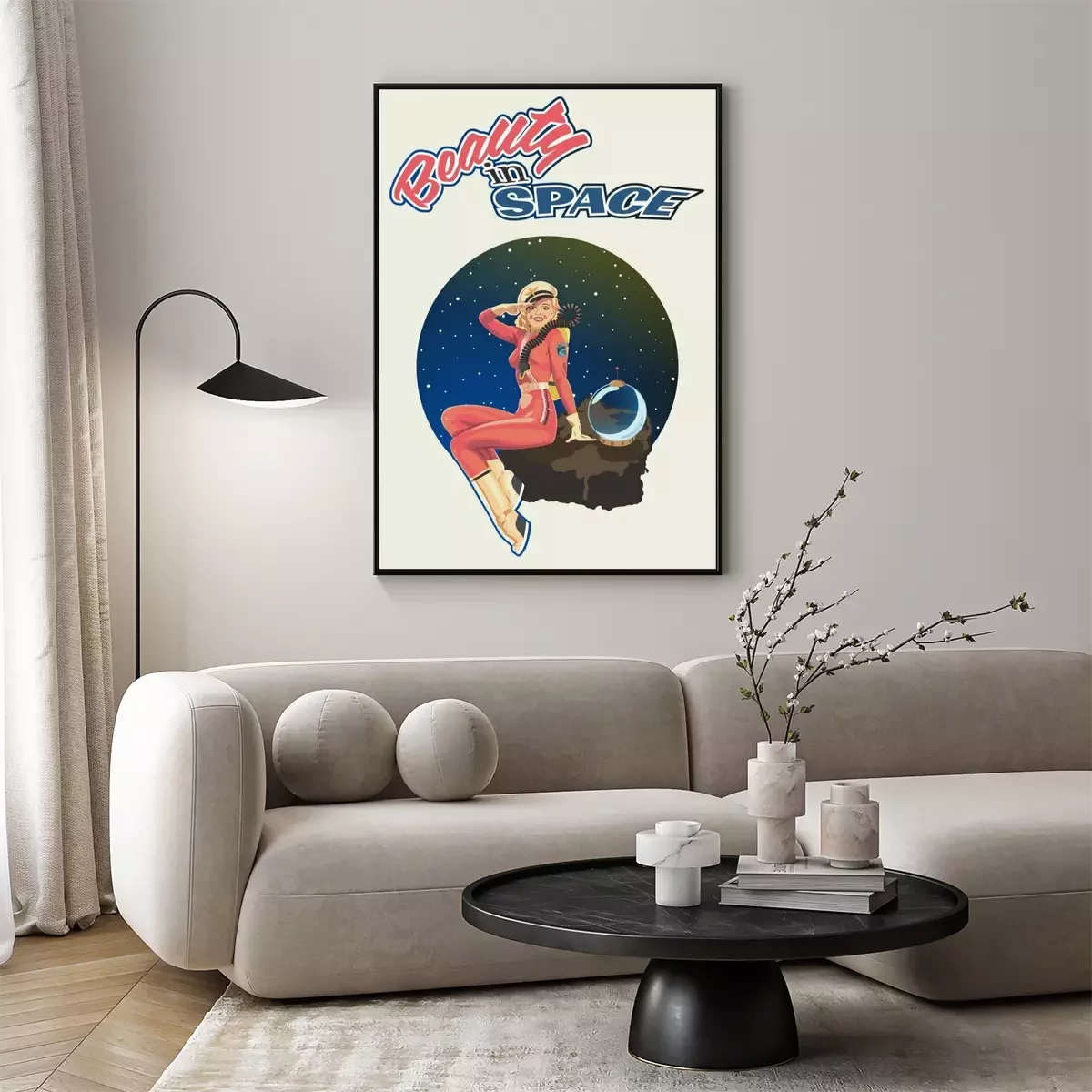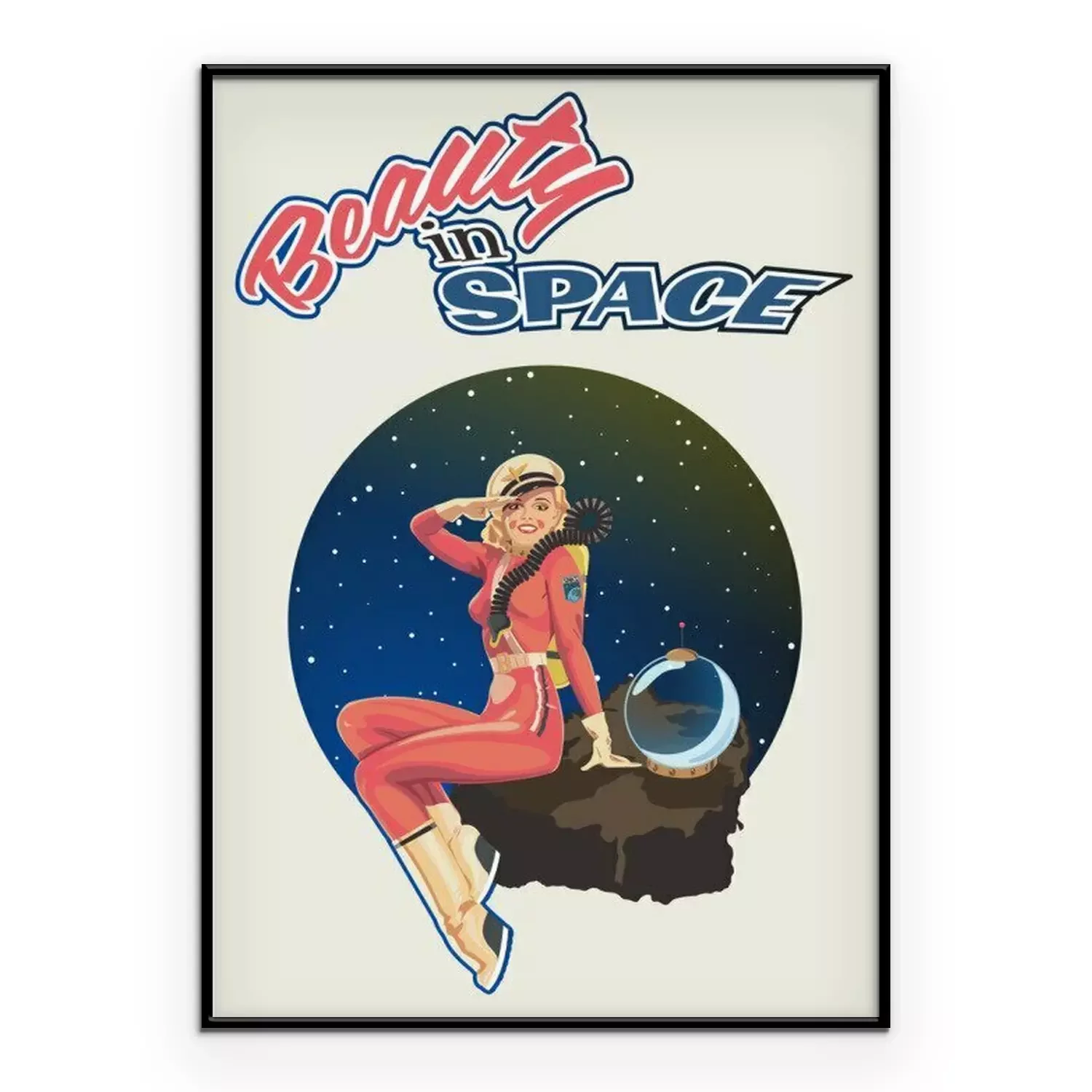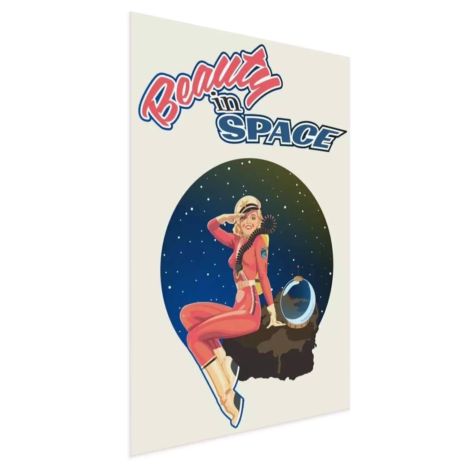 Poster: Beauty in Space, Retro Pin Up Girl Illustration, 1940s - 1950s Retro Futurism Style Poster, Woman Astronaut, Space Background